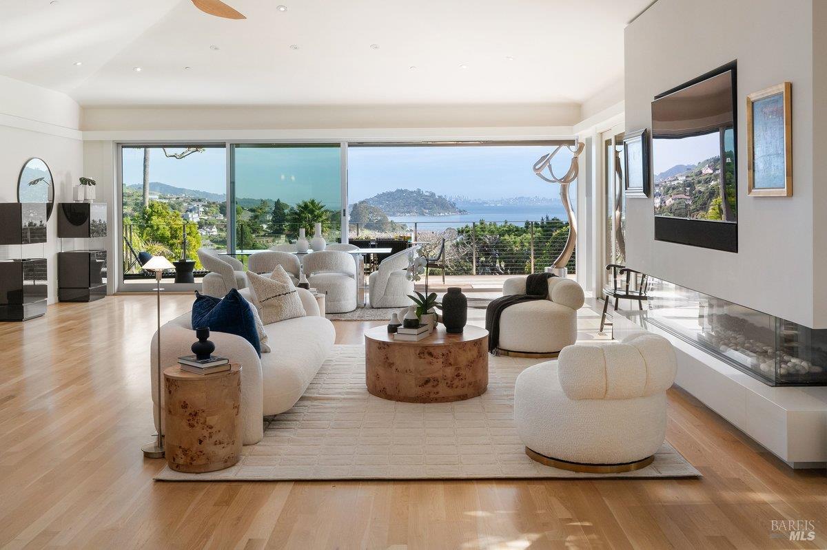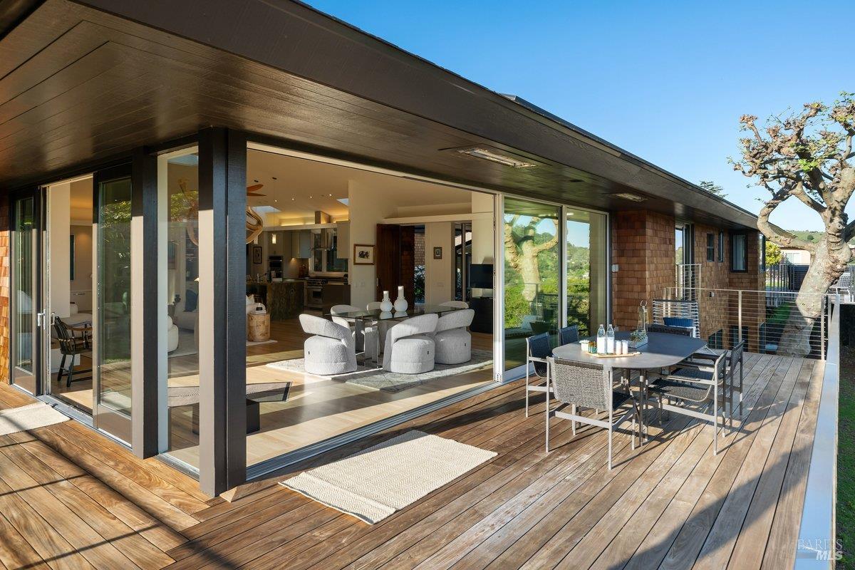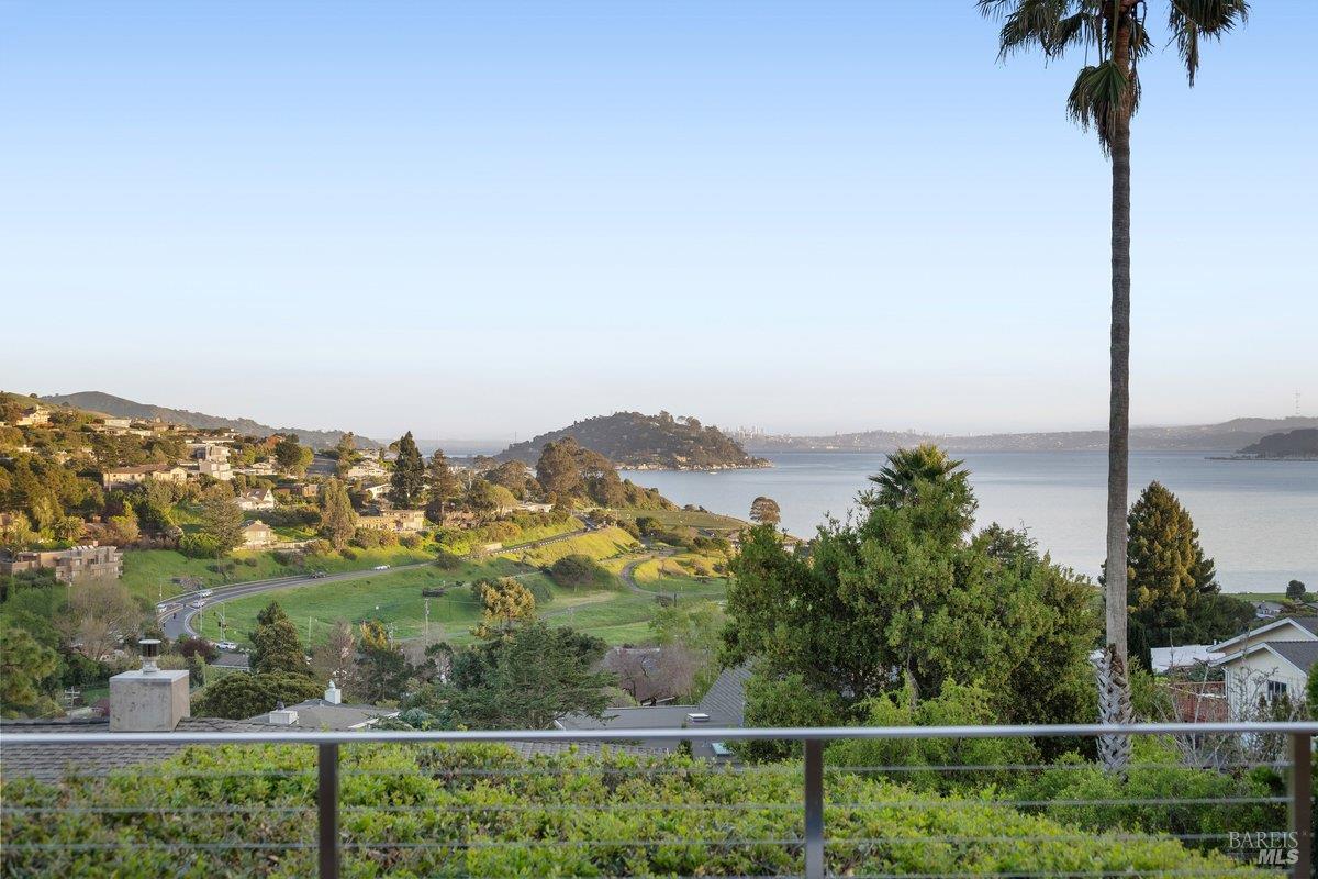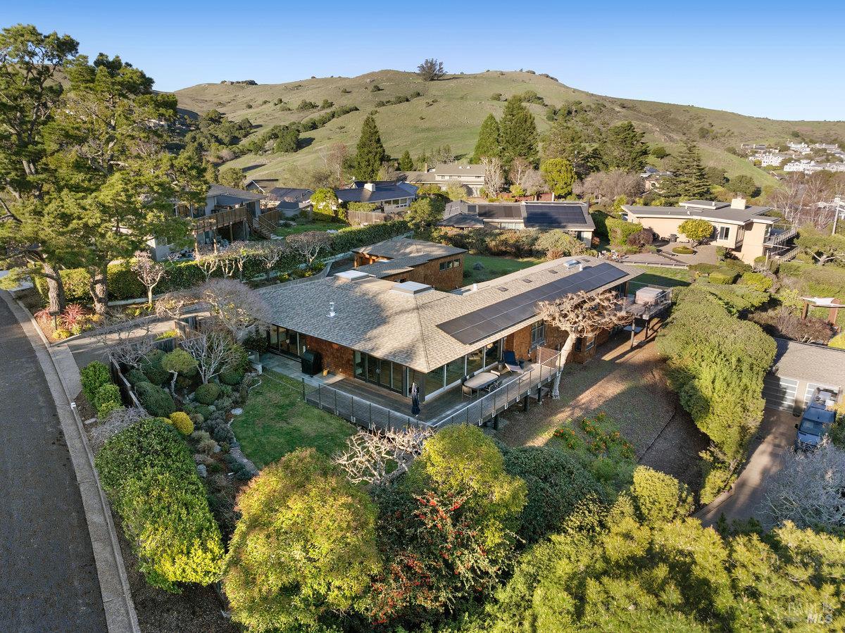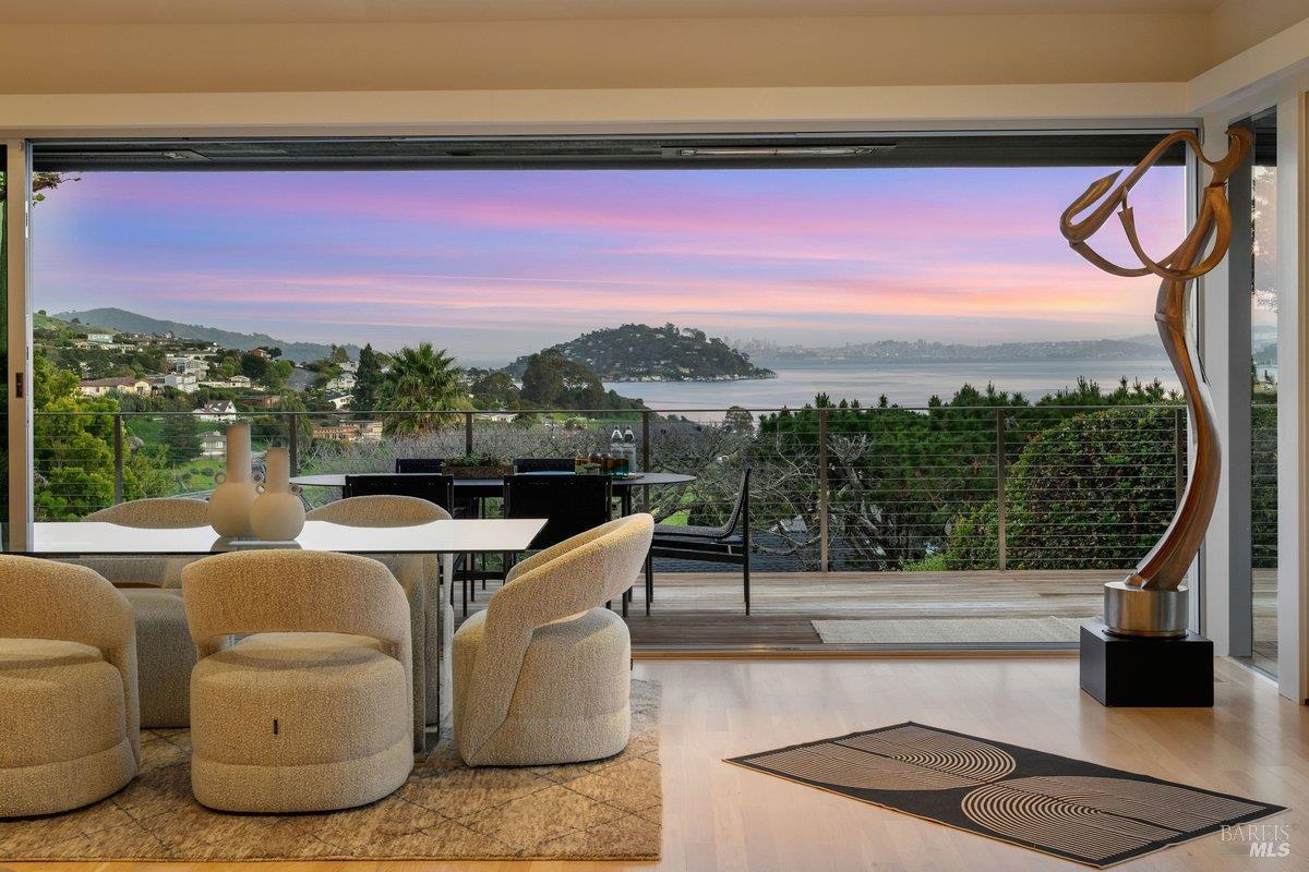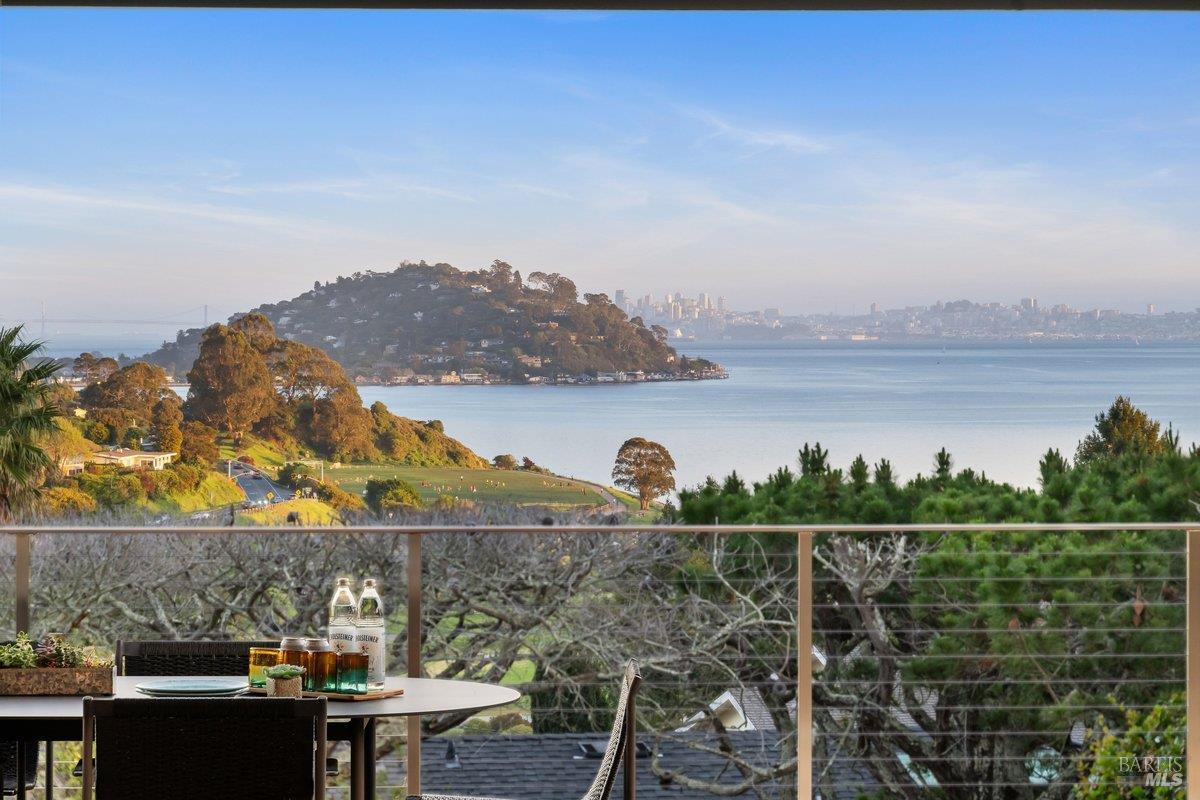Perched on a private, oversized, south-facing lot, this beautifully updated contemporary Tiburon home captures sweeping views of the San Francisco Bay and City Skyline. Thoughtfully renovated and meticulously maintained, this home blends open-concept living, indoor-outdoor entertaining and flexible spaces ideal for families, remote work and multi-generational living. The main level functions comfortably as single-level living and features a light-filled open concept Great Room, Dining and Kitchen that flows seamlessly into a beautifully manicured garden. Graced with tall Fleetwood Sliding doors, an entire wall opens directly onto gorgeous Ipe decks with recessed heaters for enjoyment any time of the day. The Chef's kitchen features a large island graced with Brazilian Granite countertops and stainless steel appliances. A large walk-in pantry and mud room with custom built-ins and separate entry ensure that the needs of today's practical lifestyle are also met. The elegant primary suite also offers breathtaking views and is located down a light-filled hallway. No detail was spared in the striking renovated spa-like bath, dual custom closets, and built-in vanity. A private deck and hot tub completes this sophisticated retreat. There is an additional bedroom on this floor that has been outfitted as a home office with custom built-in desks and cabinetry. Downstairs are three additional bedrooms with wonderful light, views, high-ceilings along with two full baths, and a laundry room. Directly across a flat, grassy yard is a a detached 1-bedroom / 1-bath guest house with its own entrance that makes for the ultimate flex space as guest quarters, AuPair unit, secondary home office or workout room. Environmentally friendly features include owned solar, a battery back-up and EV charger in the 2-car detached garage. This home provides a rare combination of convenience and comfort for long-term livability through multiple stages of life. The coveted Reedlands neighborhood offers easy access to Blackies' Pasture, the Cove Shopping Center and Highway 101.