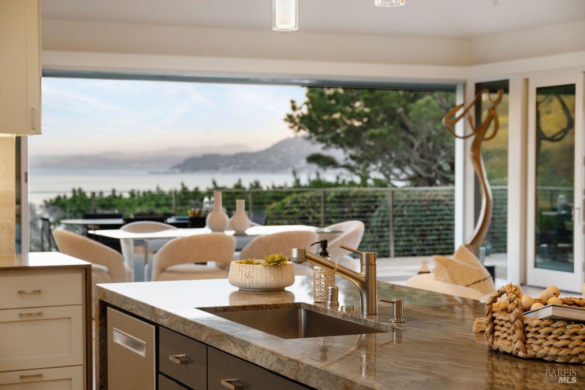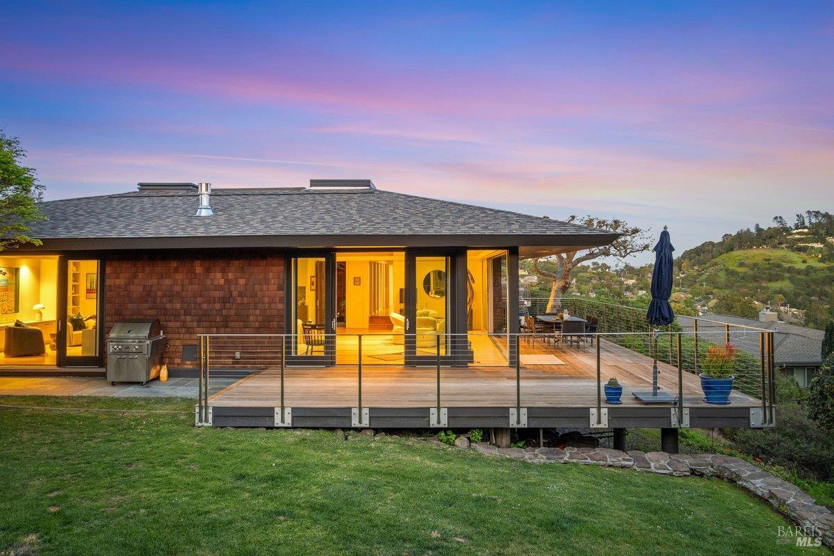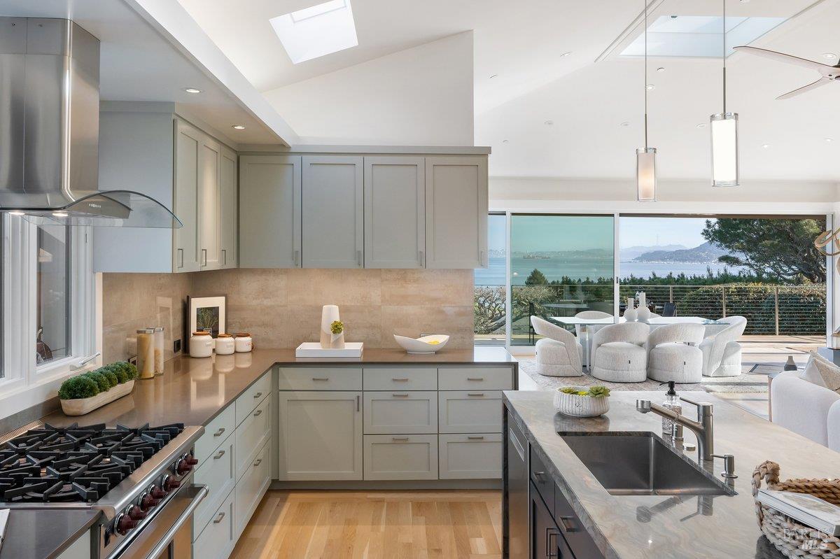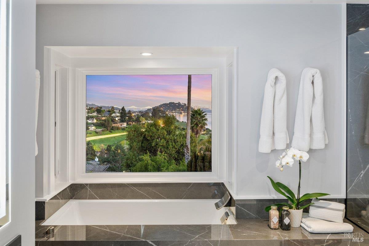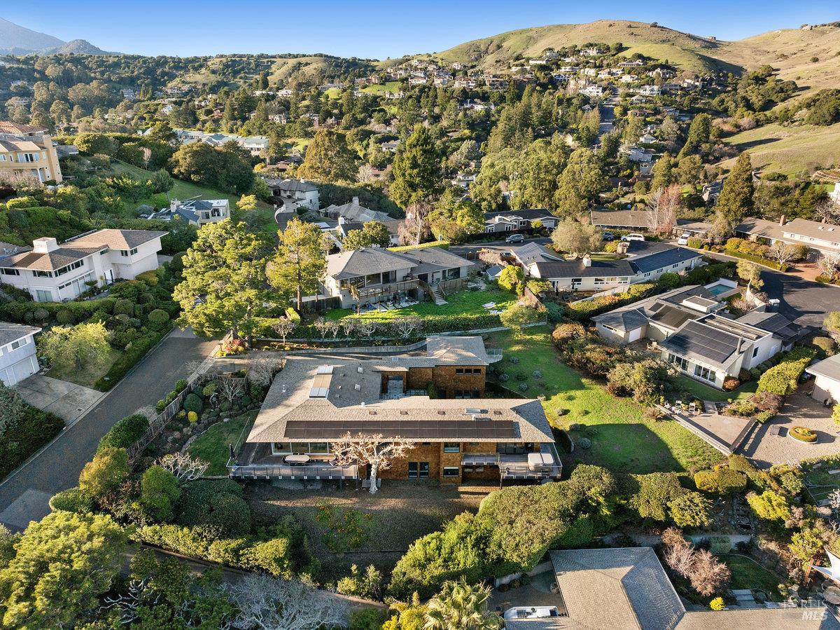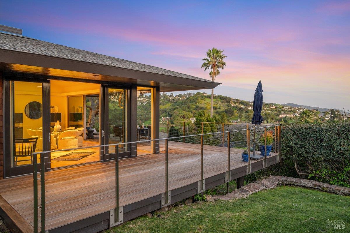 Perched on a private, oversized, south-facing lot, this beautifully updated contemporary Tiburon home captures sweeping views of the San Francisco Bay and City Skyline. Thoughtfully renovated and meticulously maintained, this home blends open-concept living, indoor-outdoor entertaining and flexible spaces ideal for families, remote work and multi-generational living. The main level functions comfortably as single-level living and features a light-filled open concept Great Room, Dining and Kitchen that flows seamlessly into a beautifully manicured garden. Graced with tall Fleetwood Sliding doors, an entire wall opens directly onto gorgeous Ipe decks with recessed heaters for enjoyment any time of the day. The Chef's kitchen features a large island graced with Brazilian Granite countertops and stainless steel appliances. A large walk-in pantry and mud room with custom built-ins and separate entry ensure that the needs of today's practical lifestyle are also met. The elegant primary suite also offers breathtaking views and is located down a light-filled hallway. No detail was spared in the striking renovated spa-like bath, dual custom closets, and built-in vanity. A private deck and hot tub completes this sophisticated retreat. There is an additional bedroom on this floor that has been outfitted as a home office with custom built-in desks and cabinetry. Downstairs are three additional bedrooms with wonderful light, views, high-ceilings along with two full baths, and a laundry room. Directly across a flat, grassy yard is a a detached 1-bedroom / 1-bath guest house with its own entrance that makes for the ultimate flex space as guest quarters, AuPair unit, secondary home office or workout room. Environmentally friendly features include owned solar, a battery back-up and EV charger in the 2-car detached garage. This home provides a rare combination of convenience and comfort for long-term livability through multiple stages of life. The coveted Reedlands neighborhood offers easy access to Blackies' Pasture, the Cove Shopping Center and Highway 101.