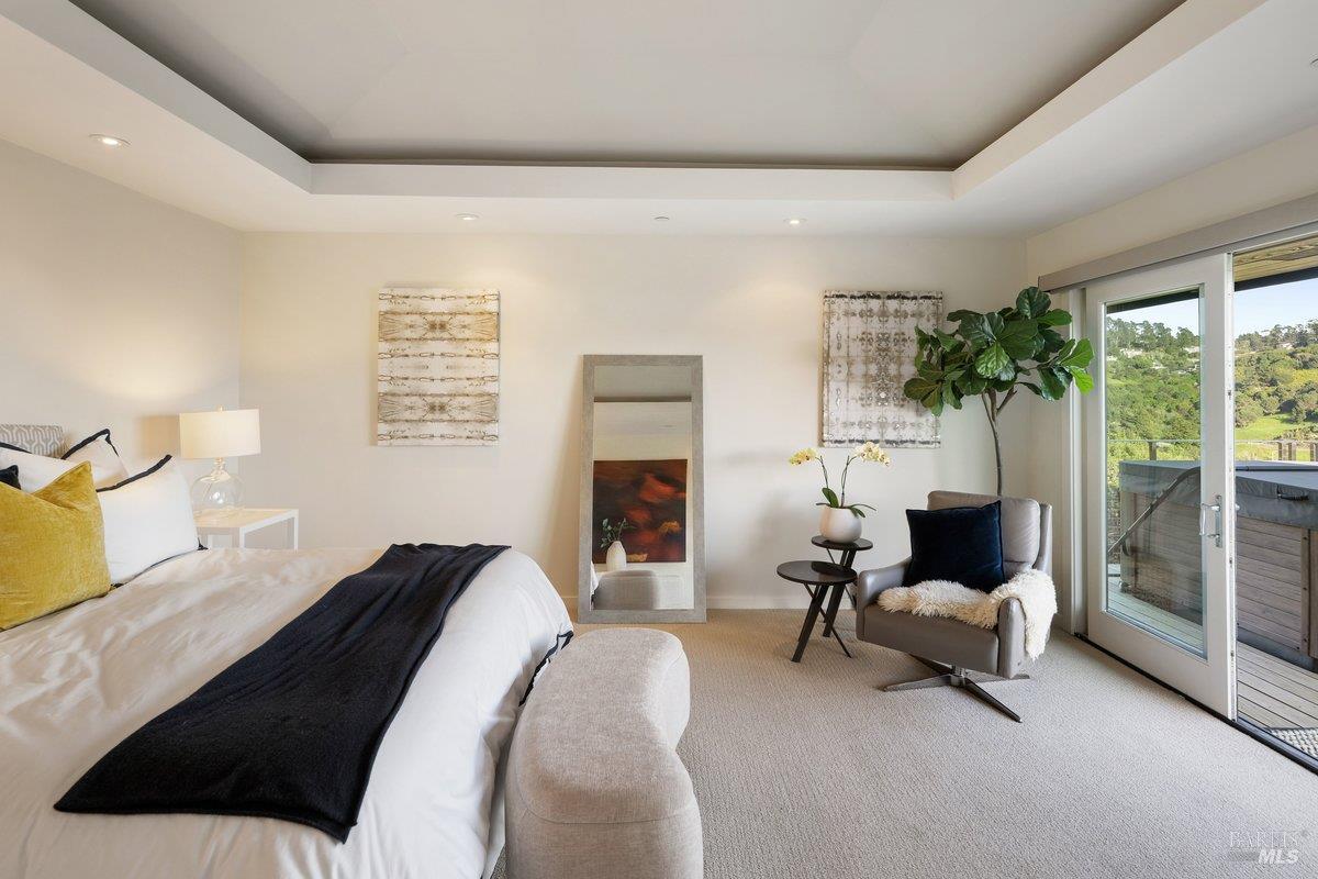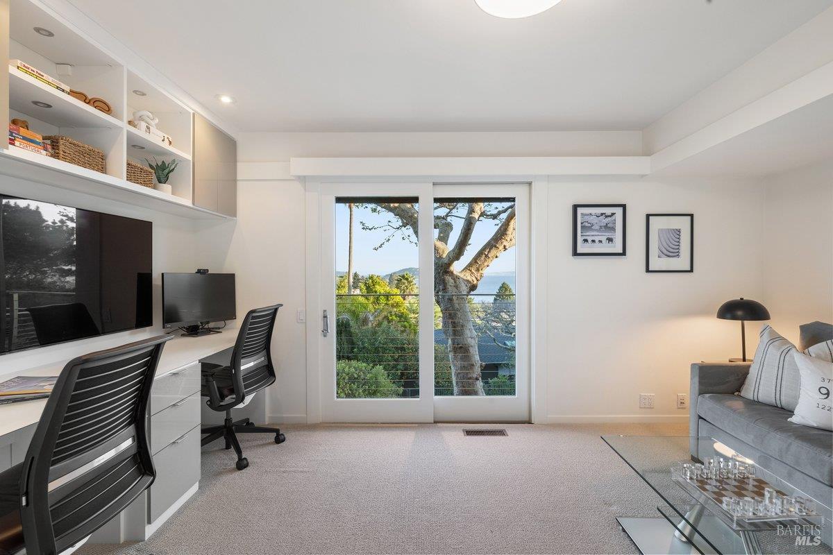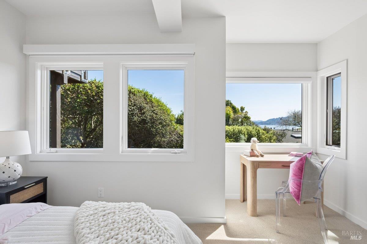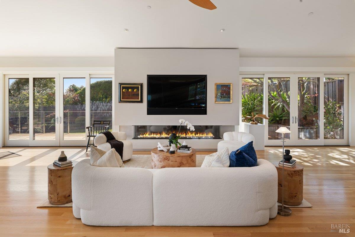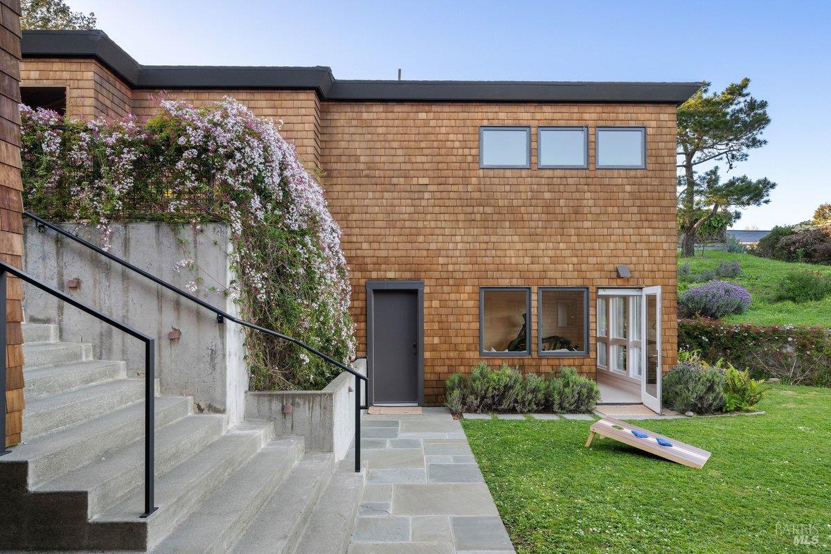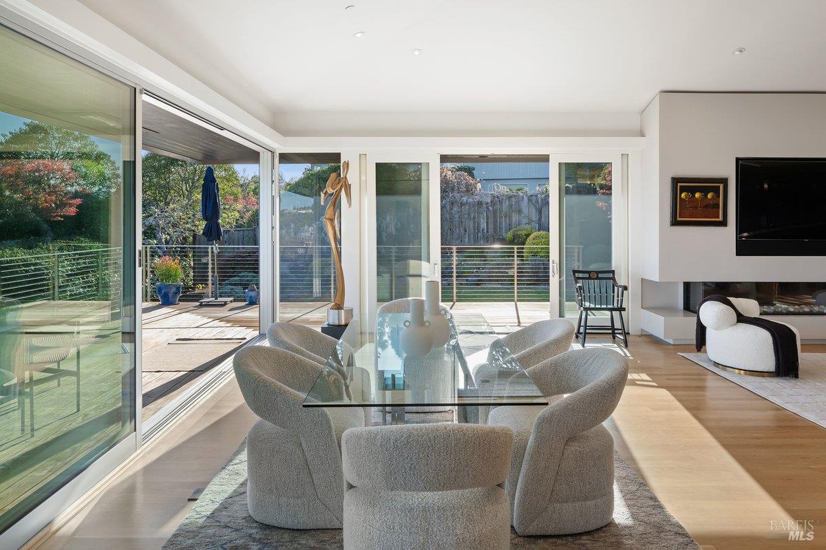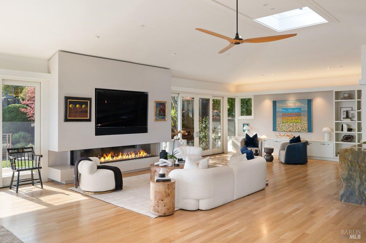 Perched on a private, oversized, south-facing lot, this beautifully updated contemporary Tiburon home captures sweeping views of the San Francisco Bay and City Skyline. Thoughtfully renovated and meticulously maintained, this home blends open-concept living, indoor-outdoor entertaining and flexible spaces ideal for families, remote work and multi-generational living. The main level functions comfortably as single-level living and features a light-filled open concept Great Room, Dining and Kitchen that flows seamlessly into a beautifully manicured garden. Graced with tall Fleetwood Sliding doors, an entire wall opens directly onto gorgeous Ipe decks with recessed heaters for enjoyment any time of the day. The Chef's kitchen features a large island graced with Brazilian Granite countertops and stainless steel appliances. A large walk-in pantry and mud room with custom built-ins and separate entry ensure that the needs of today's practical lifestyle are also met. The elegant primary suite also offers breathtaking views and is located down a light-filled hallway. No detail was spared in the striking renovated spa-like bath, dual custom closets, and built-in vanity. A private deck and hot tub completes this sophisticated retreat. There is an additional bedroom on this floor that has been outfitted as a home office with custom built-in desks and cabinetry. Downstairs are three additional bedrooms with wonderful light, views, high-ceilings along with two full baths, and a laundry room. Directly across a flat, grassy yard is a a detached 1-bedroom / 1-bath guest house with its own entrance that makes for the ultimate flex space as guest quarters, AuPair unit, secondary home office or workout room. Environmentally friendly features include owned solar, a battery back-up and EV charger in the 2-car detached garage. This home provides a rare combination of convenience and comfort for long-term livability through multiple stages of life. The coveted Reedlands neighborhood offers easy access to Blackies' Pasture, the Cove Shopping Center and Highway 101.