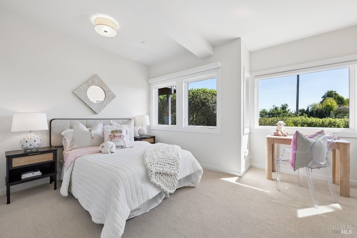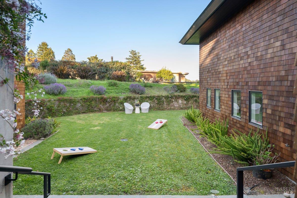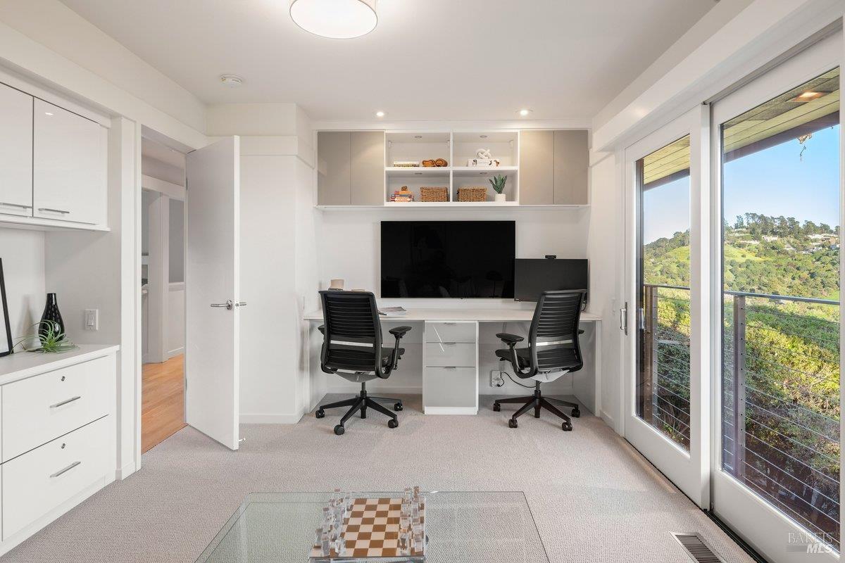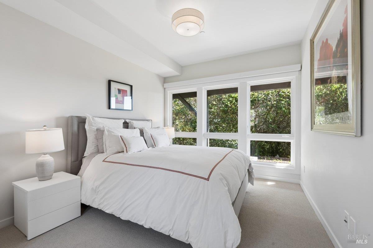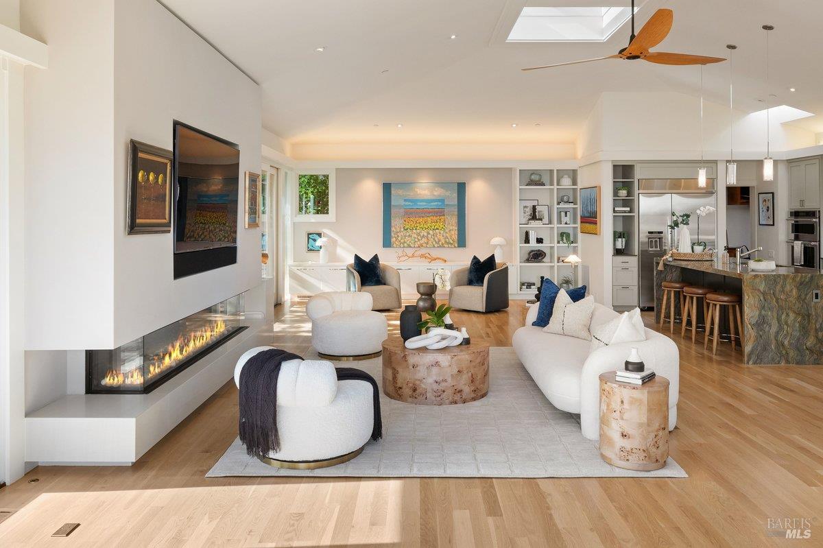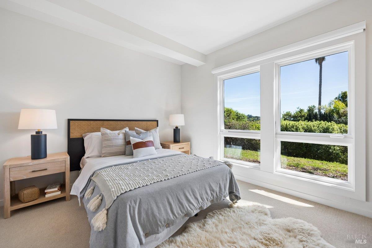 Perched on a private, oversized, south-facing lot, this beautifully updated contemporary Tiburon home captures sweeping views of the San Francisco Bay and City Skyline. Thoughtfully renovated and meticulously maintained, this home blends open-concept living, indoor-outdoor entertaining and flexible spaces ideal for families, remote work and multi-generational living. The main level functions comfortably as single-level living and features a light-filled open concept Great Room, Dining and Kitchen that flows seamlessly into a beautifully manicured garden. Graced with tall Fleetwood Sliding doors, an entire wall opens directly onto gorgeous Ipe decks with recessed heaters for enjoyment any time of the day. The Chef's kitchen features a large island graced with Brazilian Granite countertops and stainless steel appliances. A large walk-in pantry and mud room with custom built-ins and separate entry ensure that the needs of today's practical lifestyle are also met. The elegant primary suite also offers breathtaking views and is located down a light-filled hallway. No detail was spared in the striking renovated spa-like bath, dual custom closets, and built-in vanity. A private deck and hot tub completes this sophisticated retreat. There is an additional bedroom on this floor that has been outfitted as a home office with custom built-in desks and cabinetry. Downstairs are three additional bedrooms with wonderful light, views, high-ceilings along with two full baths, and a laundry room. Directly across a flat, grassy yard is a a detached 1-bedroom / 1-bath guest house with its own entrance that makes for the ultimate flex space as guest quarters, AuPair unit, secondary home office or workout room. Environmentally friendly features include owned solar, a battery back-up and EV charger in the 2-car detached garage. This home provides a rare combination of convenience and comfort for long-term livability through multiple stages of life. The coveted Reedlands neighborhood offers easy access to Blackies' Pasture, the Cove Shopping Center and Highway 101.