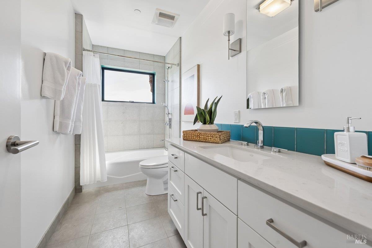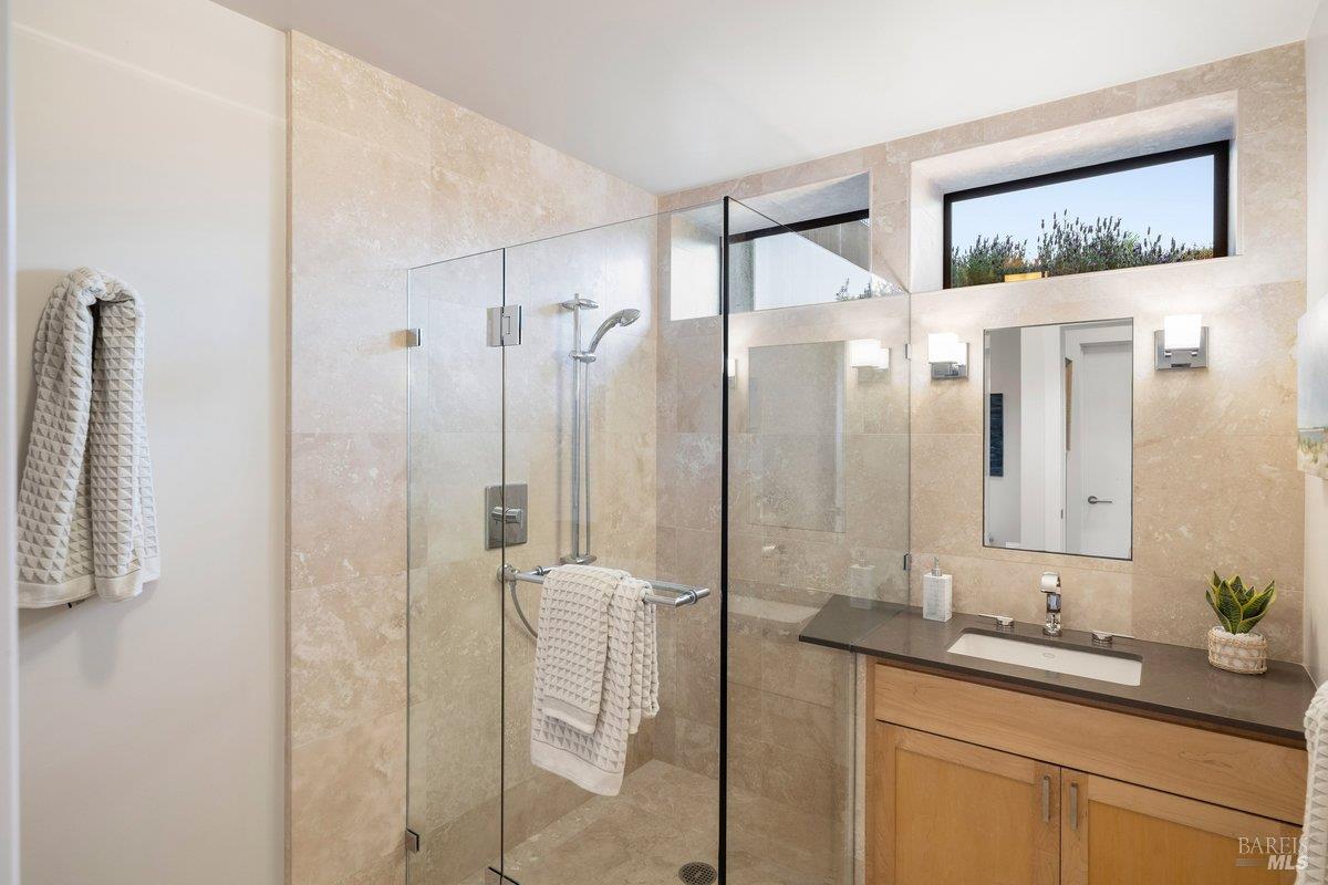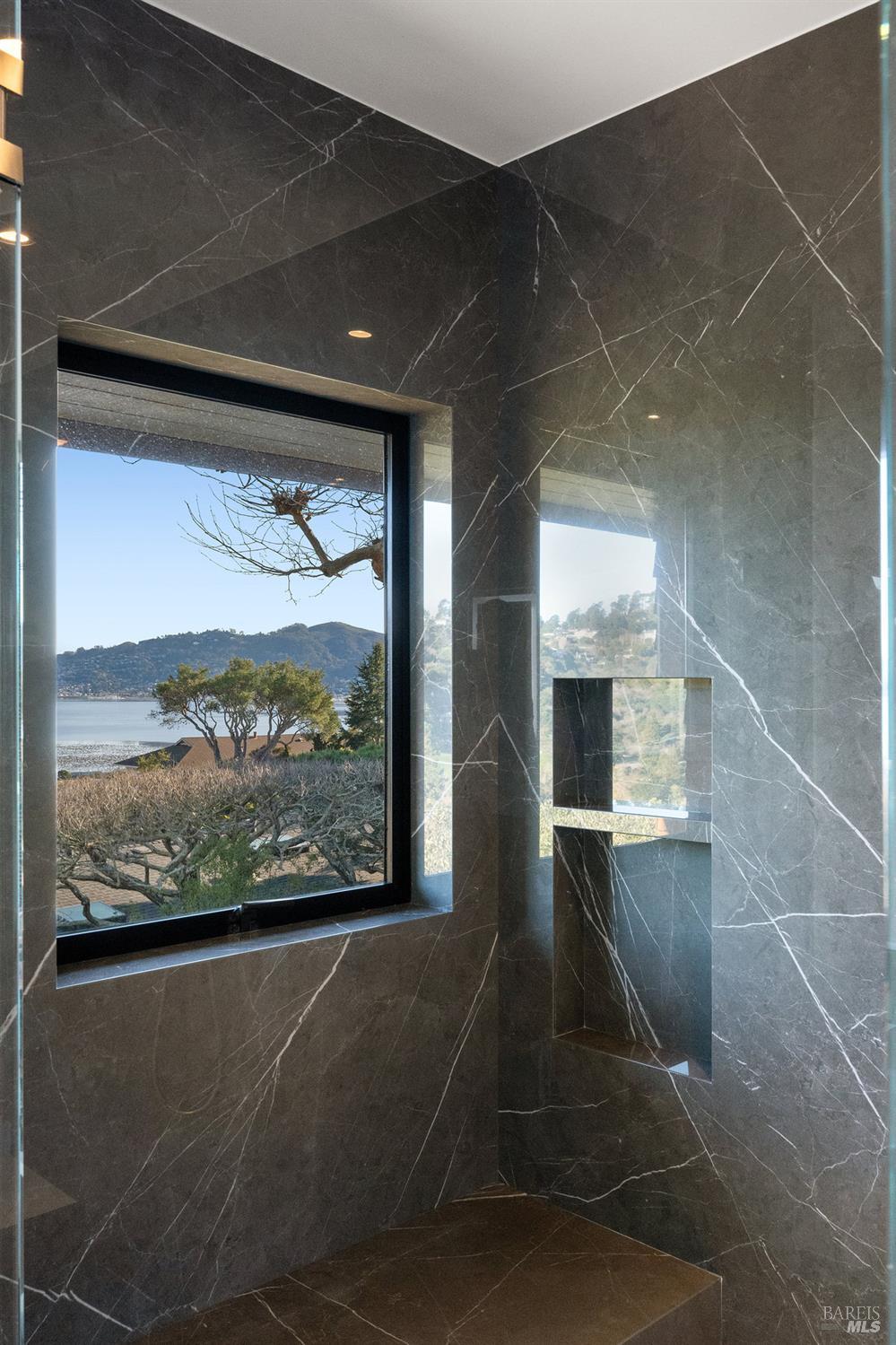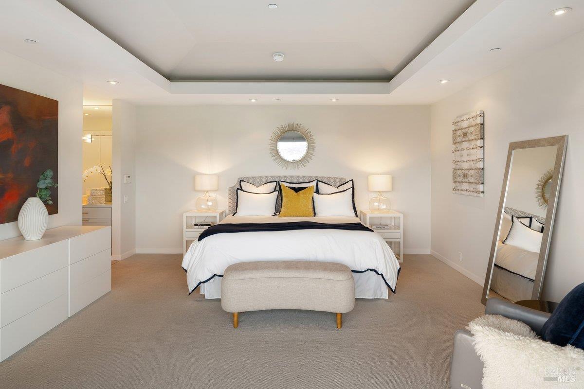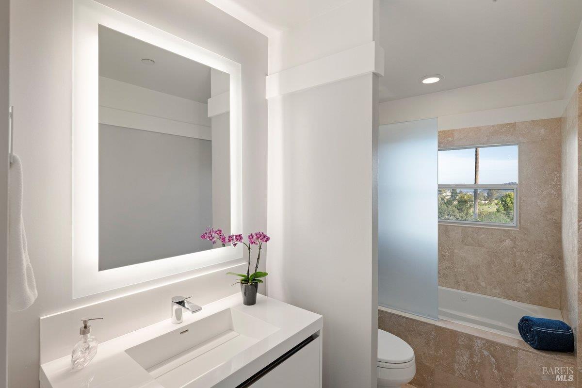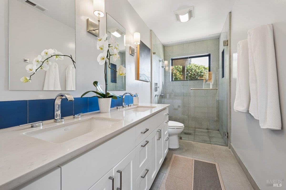 Perched on a private, oversized, south-facing lot, this beautifully updated contemporary Tiburon home captures sweeping views of the San Francisco Bay and City Skyline. Thoughtfully renovated and meticulously maintained, this home blends open-concept living, indoor-outdoor entertaining and flexible spaces ideal for families, remote work and multi-generational living. The main level functions comfortably as single-level living and features a light-filled open concept Great Room, Dining and Kitchen that flows seamlessly into a beautifully manicured garden. Graced with tall Fleetwood Sliding doors, an entire wall opens directly onto gorgeous Ipe decks with recessed heaters for enjoyment any time of the day. The Chef's kitchen features a large island graced with Brazilian Granite countertops and stainless steel appliances. A large walk-in pantry and mud room with custom built-ins and separate entry ensure that the needs of today's practical lifestyle are also met. The elegant primary suite also offers breathtaking views and is located down a light-filled hallway. No detail was spared in the striking renovated spa-like bath, dual custom closets, and built-in vanity. A private deck and hot tub completes this sophisticated retreat. There is an additional bedroom on this floor that has been outfitted as a home office with custom built-in desks and cabinetry. Downstairs are three additional bedrooms with wonderful light, views, high-ceilings along with two full baths, and a laundry room. Directly across a flat, grassy yard is a a detached 1-bedroom / 1-bath guest house with its own entrance that makes for the ultimate flex space as guest quarters, AuPair unit, secondary home office or workout room. Environmentally friendly features include owned solar, a battery back-up and EV charger in the 2-car detached garage. This home provides a rare combination of convenience and comfort for long-term livability through multiple stages of life. The coveted Reedlands neighborhood offers easy access to Blackies' Pasture, the Cove Shopping Center and Highway 101.