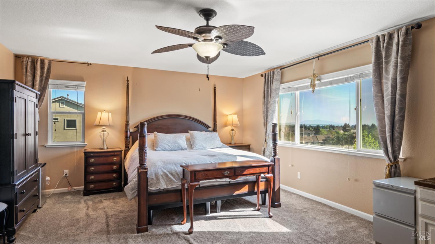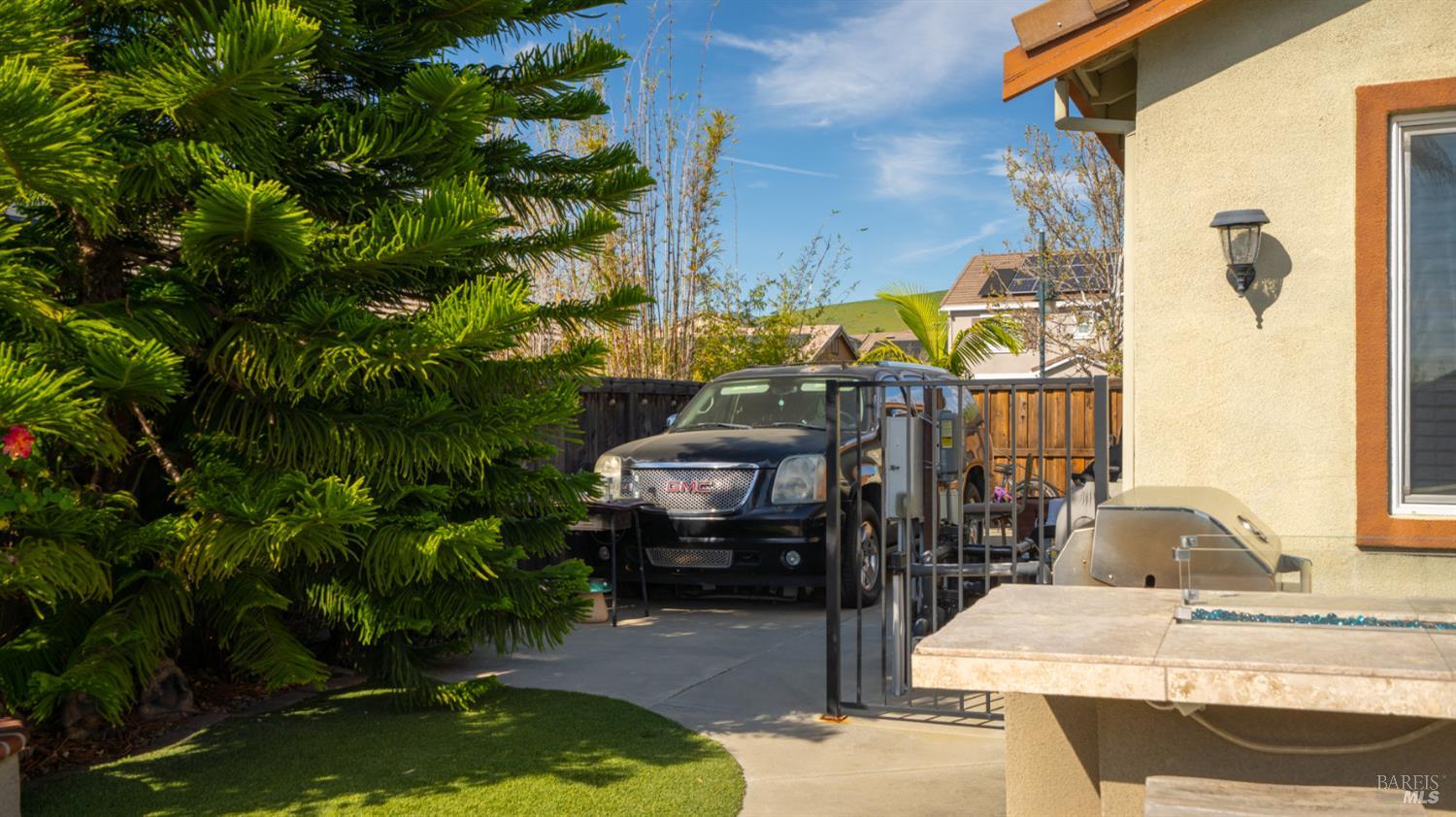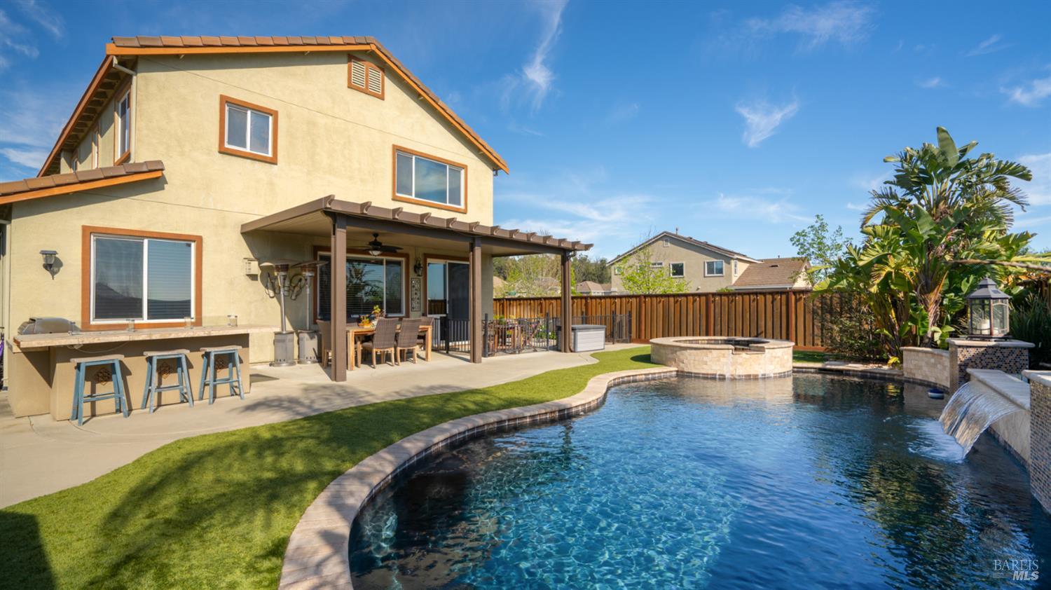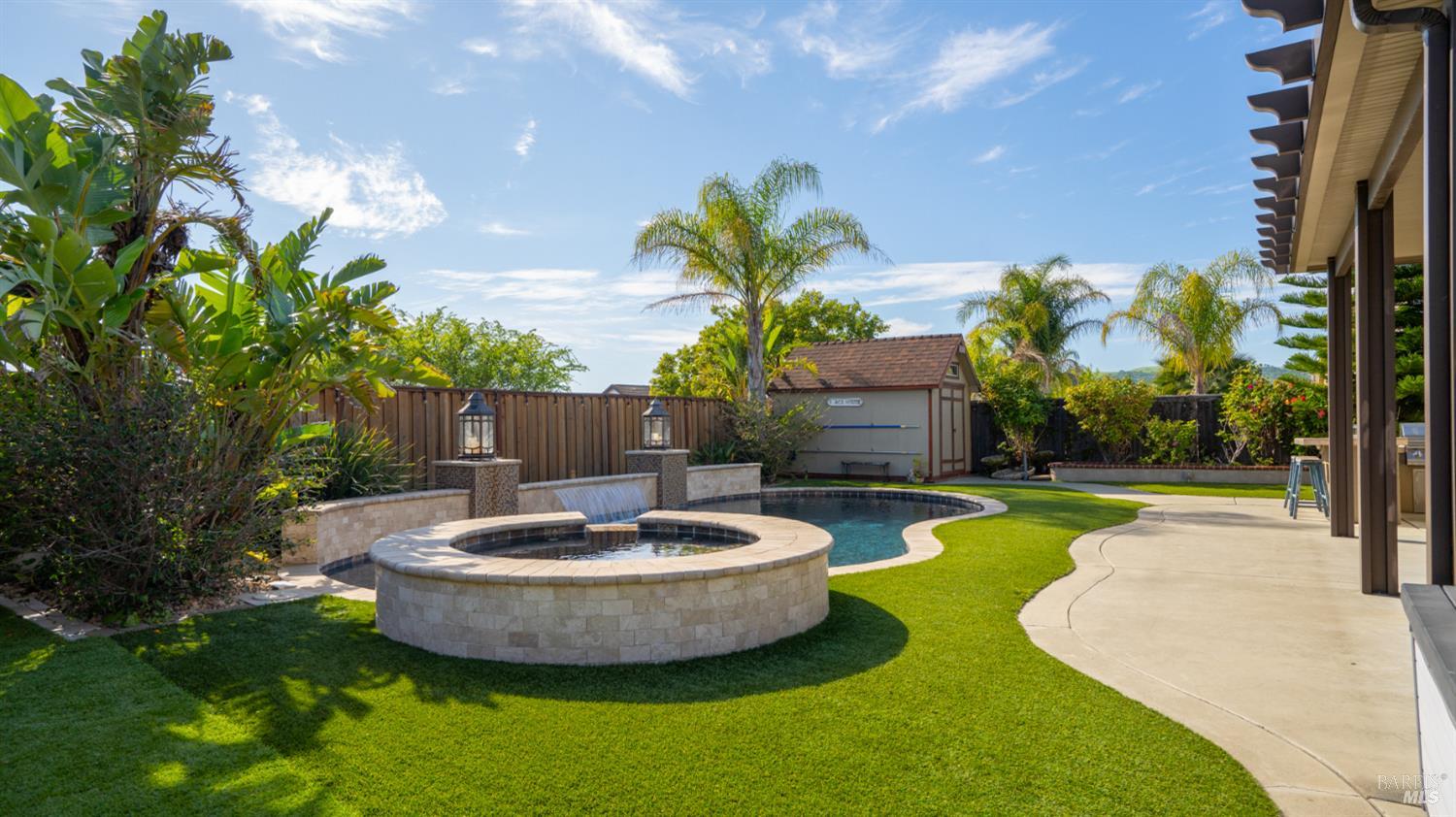 Welcome to this beautiful corner lot home in Paradise Crest offering 4 bedrooms + a den and 3 full baths, including a convenient downstairs bedroom and full bathroom perfect for guests or multi-generational living. The spacious floor plan features a loft, and separate living and family rooms, providing plenty of room to relax, work, or entertain. The open kitchen showcases granite countertops, a large island, and an eat-in dining area that flows into the inviting family room with fireplace. Step outside to your private backyard retreat featuring a covered patio, pool, spa with waterfall and a built-in outdoor kitchen with BBQ, mini refrigerator, and fire pits perfect for entertaining. Additional highlights include RV parking, Tesla charger, owned solar less than 10 years old, and a large storage shed. A wonderful blend of comfort, space, and outdoor living.
