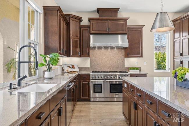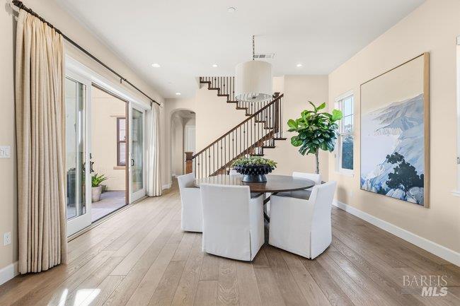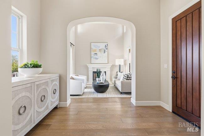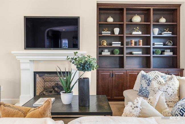 Situated in a desirable residential community just moments from downtown Larkspur, this thoughtfully crafted Santa Barbara style inspired residence offers refined architecture, generous living spaces, and beautifully curated finishes throughout. Positioned on a corner lot, the home enjoys an enhanced sense of openness while showcasing a graceful blend of European Costal character and timeless design elements. Wide-plank flooring carries through the main living areas, where a graciously scaled living room with an inviting fireplace, custom built-ins, and direct outdoor access creates a welcoming gathering space. The living room flows seamlessly into a combined dining and family room, forming one expansive area for everyday living and entertaining. Large sliding glass doors invite the outdoors in and extend the living spaces to the surrounding grounds. The gourmet kitchen is designed for both style and functionality, featuring sleek granite counters and backsplash, abundant cabinetry, a center island, and premium stainless appliances including a six-burner gas range. A private main-level guest suite provides comfortable accommodations for visitors. A striking staircase with elegant oil rubbed bronze balustrades leads to the upper level, where three serene en-suite bedrooms offer privacy and comfort. The primary suite captures breath taking views of Mount Tamalpais, complemented by a beautifully appointed bath with a calming neutral palette, soaking tub, dual vanities, walk-in shower, and separate water closet. A spacious laundry room adds everyday convenience and central air conditioning adds modern comfort to this beautifully designed home. A charming courtyard connects the main residence to a studio above the garage, creating an inviting outdoor setting ideal for unwinding or entertaining. The one-bedroom studio with full kitchen, stylish bath, and leafy outlooks, offering flexible space for guests, a home office, or extended living. A lush green turned side-yard has a hot tub to add an extra element of relaxation. Located just moments from Magnolia Avenue's restaurants, cafes, boutiques, and the historic Lark Theater, the property also enjoys close proximity to the Larkspur Ferry and Highway 101 for convenient commuting. With its spacious layout, private studio, and prime location near Piper Park and downtown Larkspur, the home offers an ideal setting for comfortable everyday living and effortless entertaining.