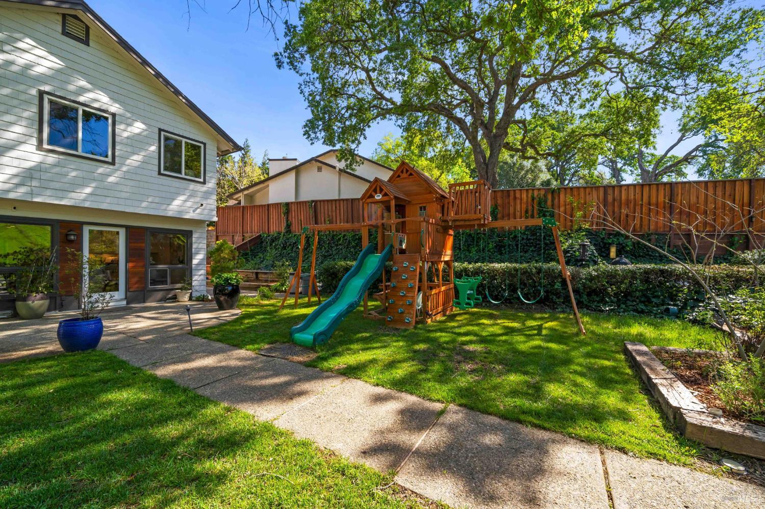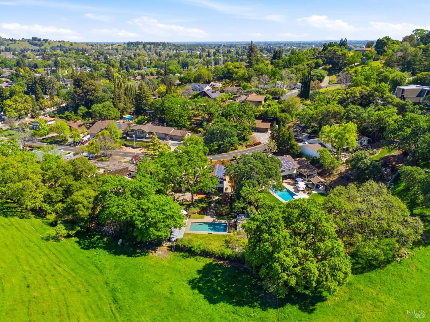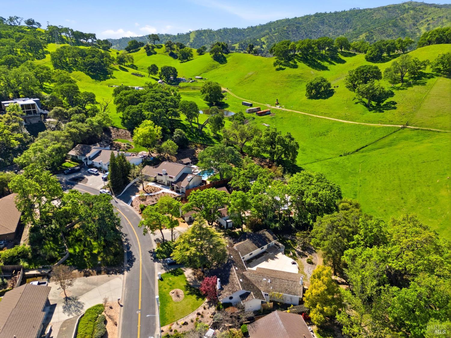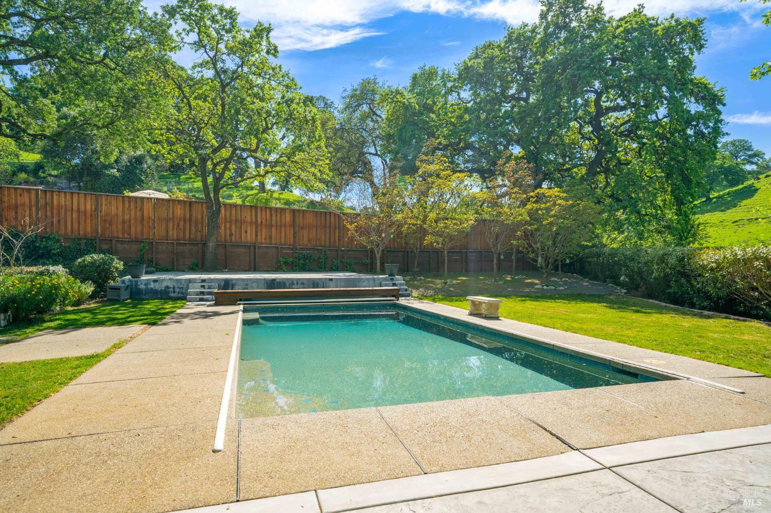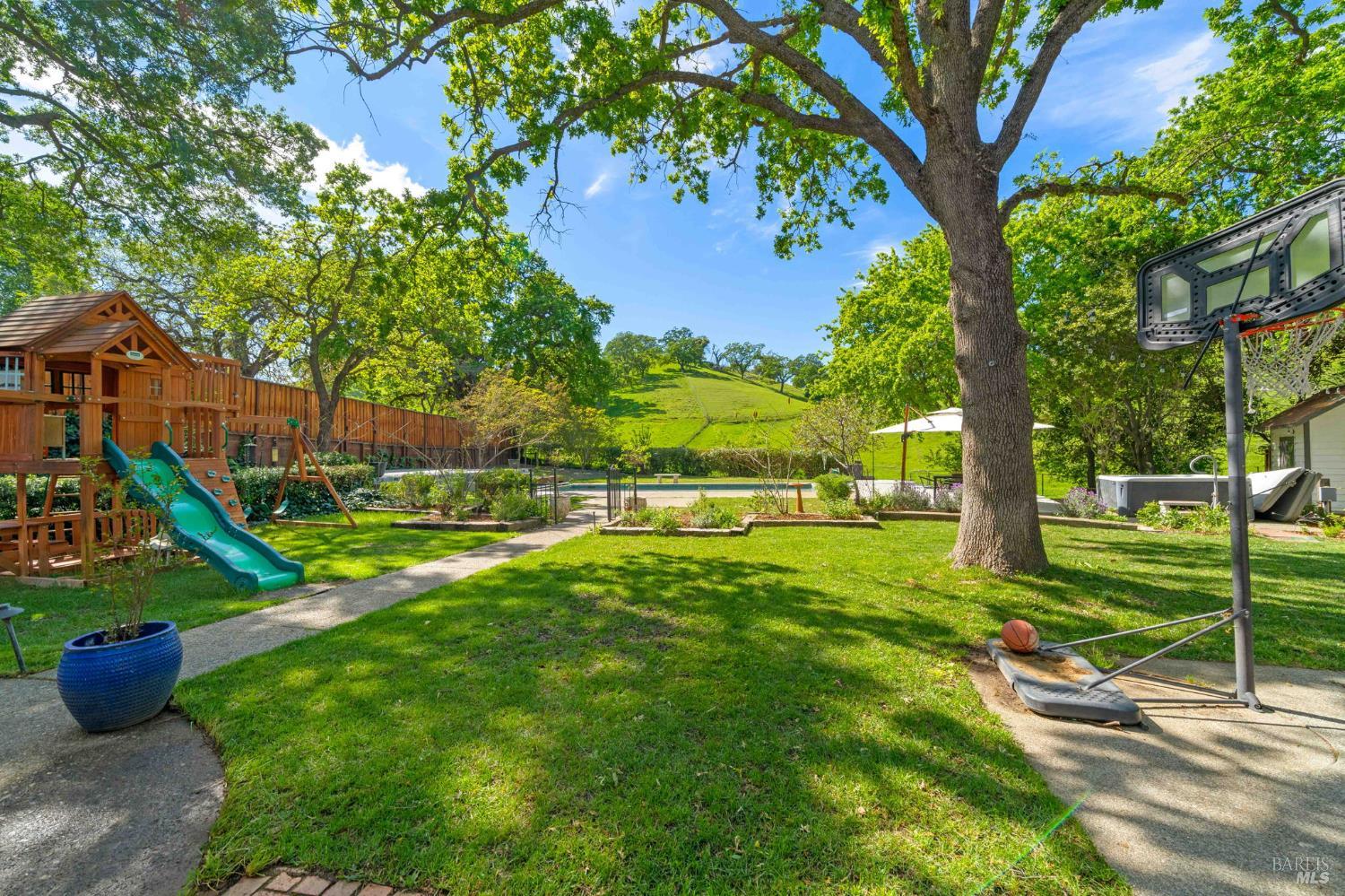 Discover an extraordinary luxury custom home on over a half-acre in prestigious, serene Wykoff Estates of North Vacaville minutes to Alamo Park, the freeway, and downtown. Never before on the market, this one-of-a-kind residence offers unobstructed countryside views, new LVP flooring and carpet, fresh interior and exterior paint and modern finishes throughout. The bright, chef-ready kitchen is a showpiece: white shaker cabinetry, quartz countertops and oversized island with seating, marble-look tile backsplash, stainless steel appliances, designer pendant lighting, recessed lights, and a sunny dining area overlooking the landscaped yard. The stunning living room features vaulted, beamed ceilings, oversized custom windows that flood the space with natural light and frame lush yard and oak-canopy views, and warm wood tones that create an inviting, airy retreat.The generous bedroom suite is a peaceful retreatwide windows capture verdant backyard and hillside vistas, bathing the room in natural light and creating a serene connection to the outdoors. The professionally landscaped backyard is an entertainer's dream: a brand-new Pebble-Tec pool with a broad sun deck, adjacent Hot Springs hot tub, shaded dining and lounge areas, mature oak canopy for privacy, lush lawn, kids' playset and trampoline, along generous paved areas ideal for outdoor living and events. Soaring custom windows bring the outdoors in; a large flex room with private separate entrance is perfect for multigenerational living, an office, or a kids' retreat. The wide driveway allows RV parking and the spacious backyard can accommodate a large ADU. Solar-equipped roof, electric car charger, 3 storage sheds and a peaceful, private setting complete this rare offeringimpeccable inside and out.