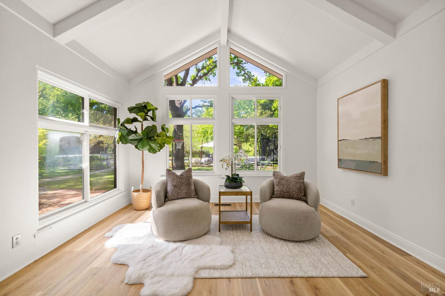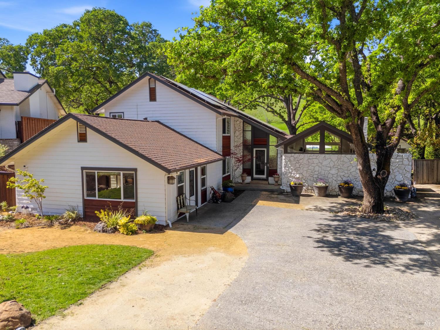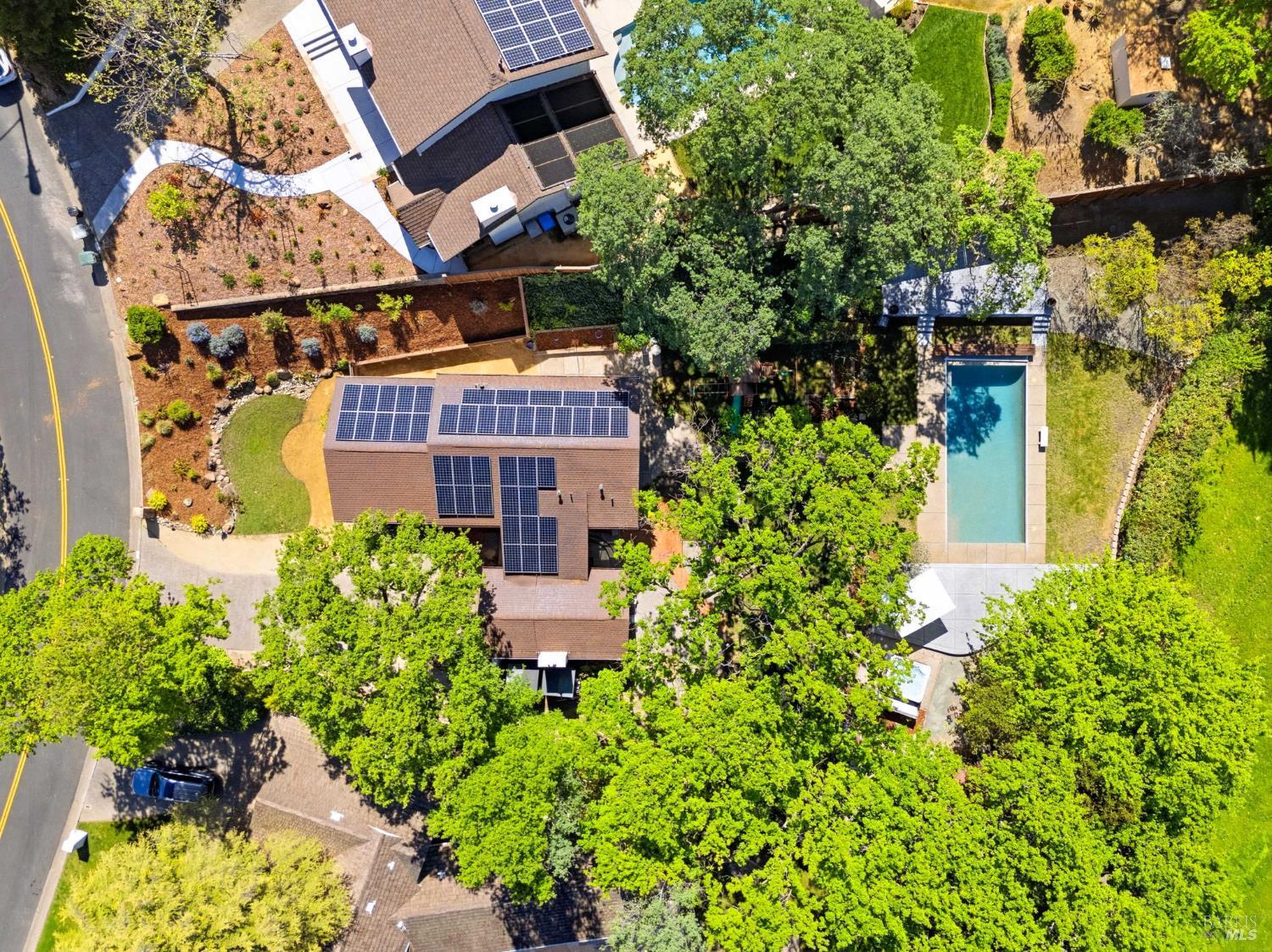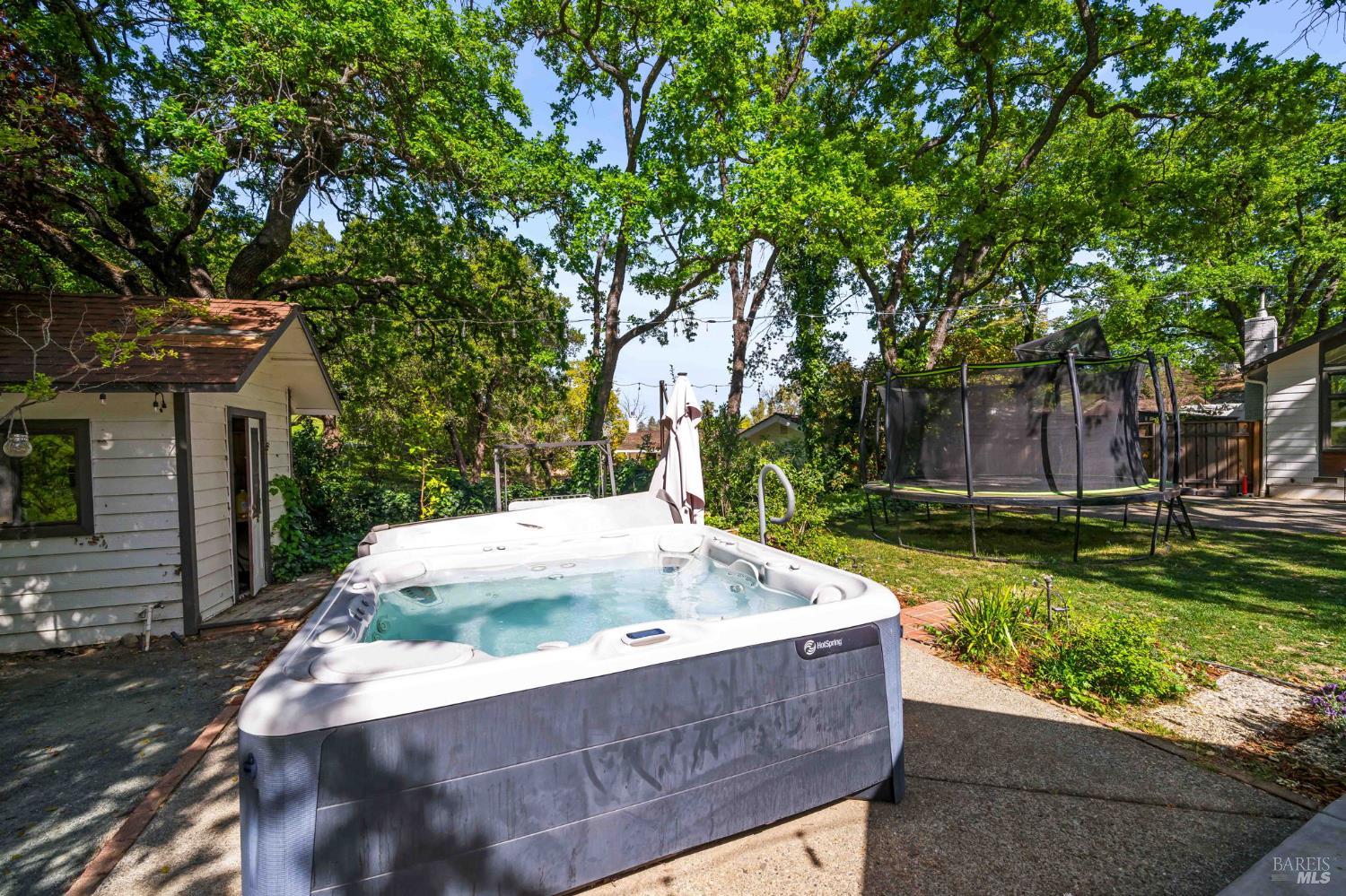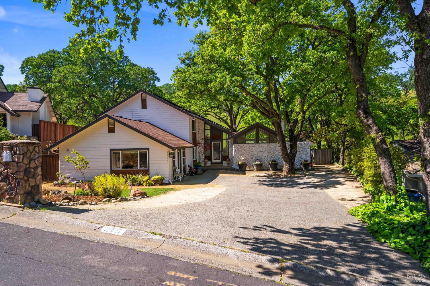 Discover an extraordinary luxury custom home on over a half-acre in prestigious, serene Wykoff Estates of North Vacaville minutes to Alamo Park, the freeway, and downtown. Never before on the market, this one-of-a-kind residence offers unobstructed countryside views, new LVP flooring and carpet, fresh interior and exterior paint and modern finishes throughout. The bright, chef-ready kitchen is a showpiece: white shaker cabinetry, quartz countertops and oversized island with seating, marble-look tile backsplash, stainless steel appliances, designer pendant lighting, recessed lights, and a sunny dining area overlooking the landscaped yard. The stunning living room features vaulted, beamed ceilings, oversized custom windows that flood the space with natural light and frame lush yard and oak-canopy views, and warm wood tones that create an inviting, airy retreat.The generous bedroom suite is a peaceful retreatwide windows capture verdant backyard and hillside vistas, bathing the room in natural light and creating a serene connection to the outdoors. The professionally landscaped backyard is an entertainer's dream: a brand-new Pebble-Tec pool with a broad sun deck, adjacent Hot Springs hot tub, shaded dining and lounge areas, mature oak canopy for privacy, lush lawn, kids' playset and trampoline, along generous paved areas ideal for outdoor living and events. Soaring custom windows bring the outdoors in; a large flex room with private separate entrance is perfect for multigenerational living, an office, or a kids' retreat. The wide driveway allows RV parking and the spacious backyard can accommodate a large ADU. Solar-equipped roof, electric car charger, 3 storage sheds and a peaceful, private setting complete this rare offeringimpeccable inside and out.