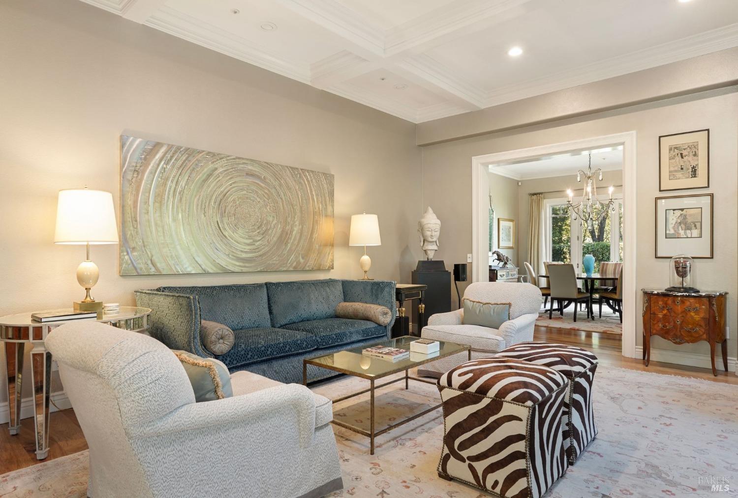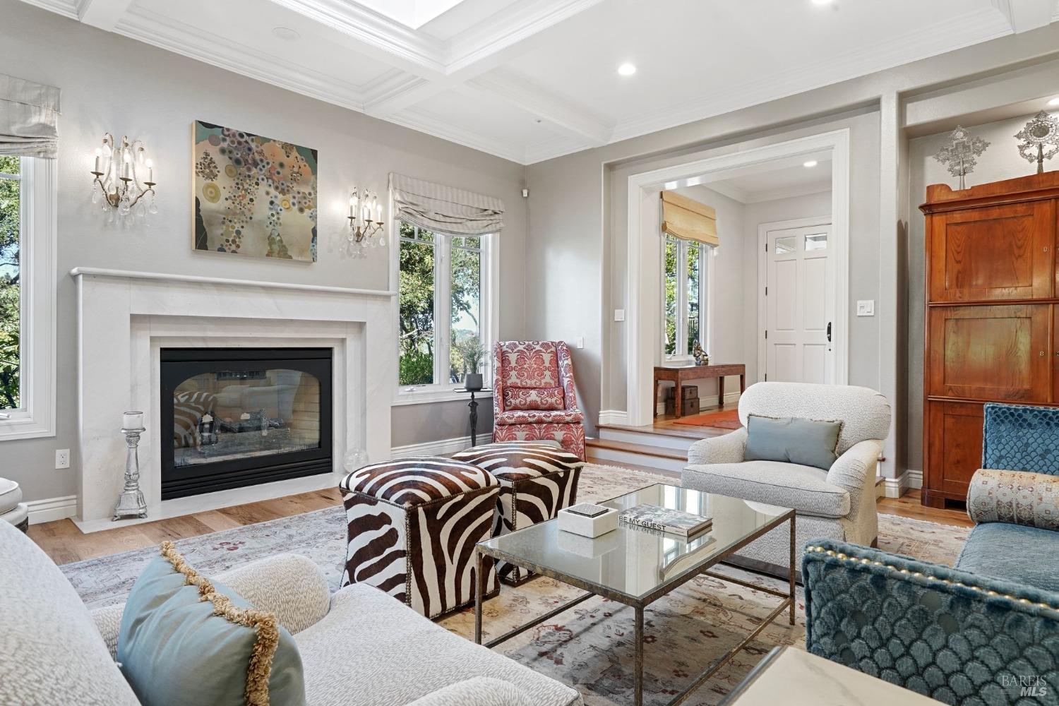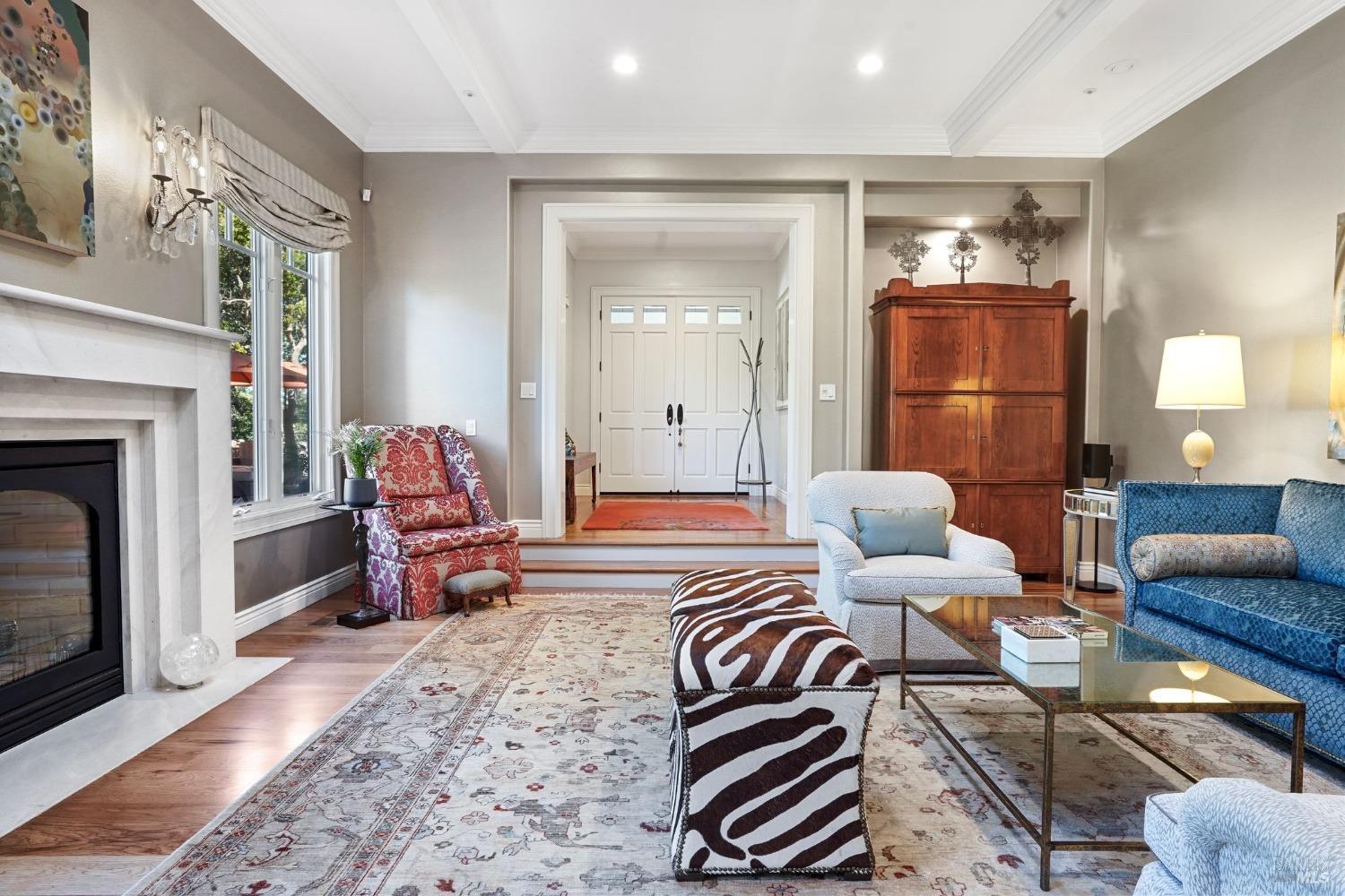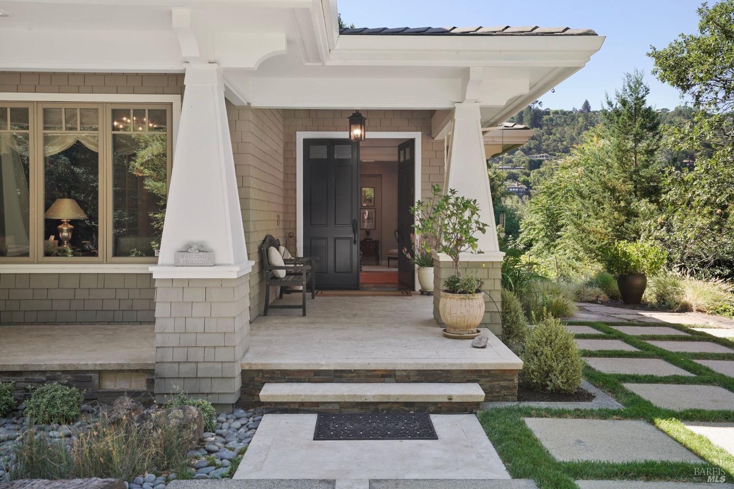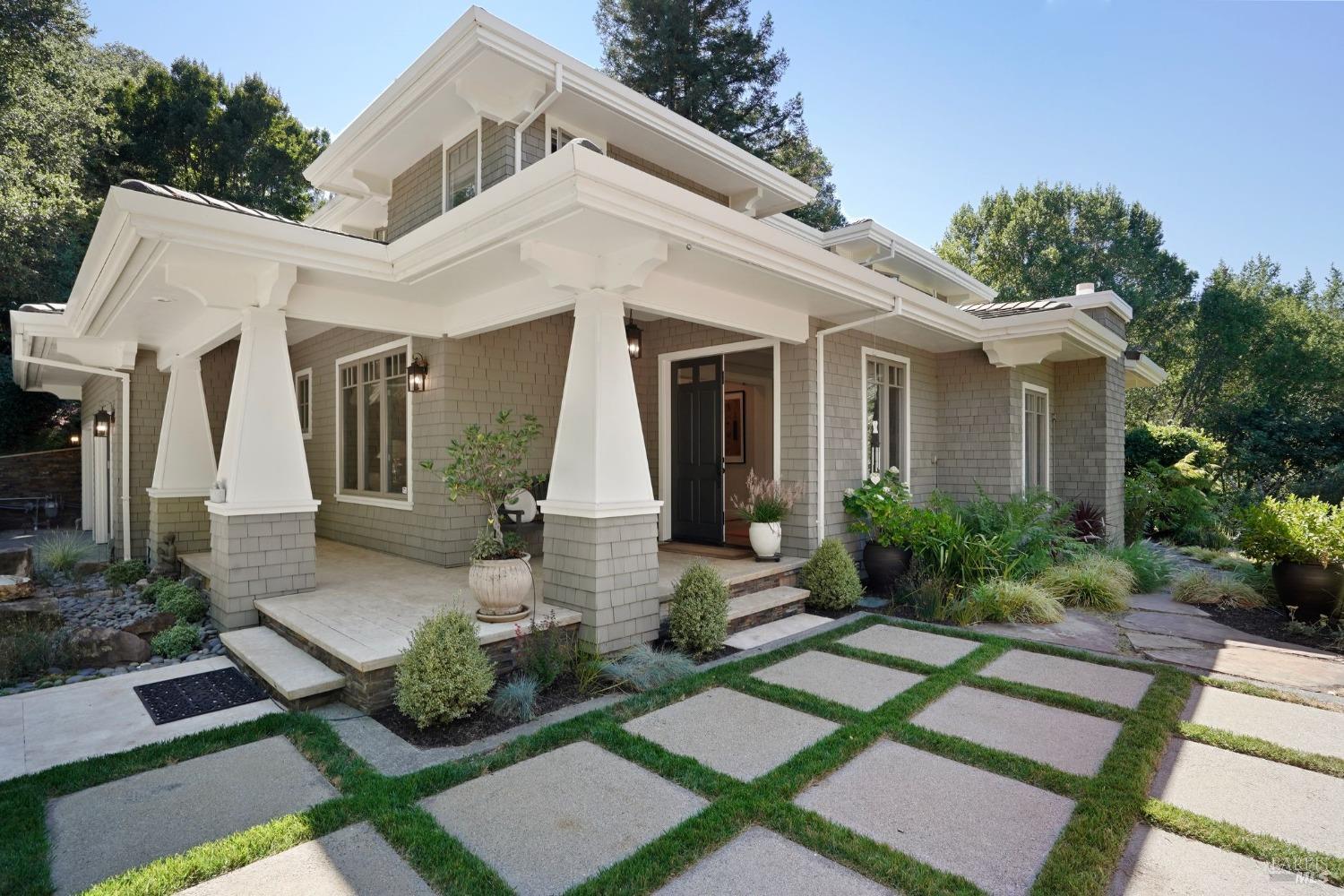 Furnished, Elegant Craftsman-Style home in the heart of Kentfield. Set in a private, gated setting with scenic views, this residence blends timeless elegance with modern comforts. Featuring rich woodwork, coffered ceilings, a gourmet kitchen with top-tier appliances, and an open floor plan ideal for both every day living and entertaining. The family room with beamed ceiling and custom built-ins opens to a beautifully landscaped backyard through French doors, offering seamless indoor-outdoor living.