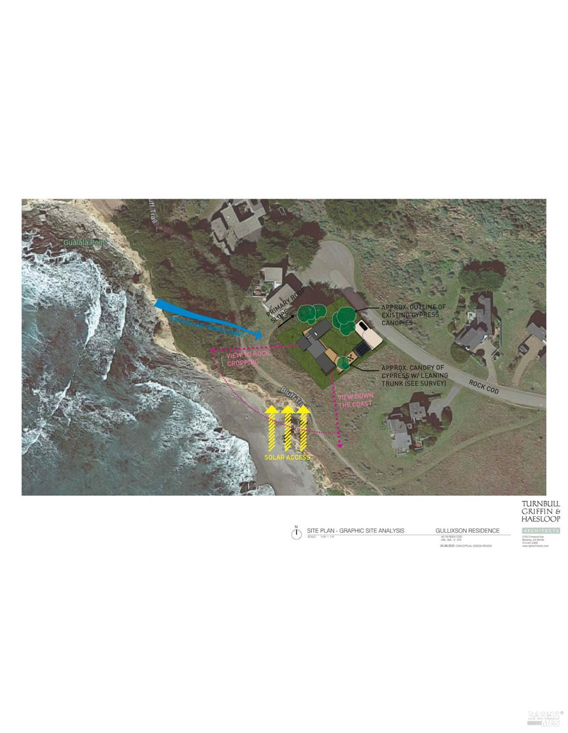 Experience the rugged beauty of the Sonoma Coast in the distinctive community of The Sea Ranch. This exceptional ocean bluff lot comes with an inspired conceptual design by renowned architect Eric Haesloop of Turnbull Griffin Haesloop an award-winning firm that has shaped some of the region's most iconic homes since 1965. Set on a level parcel with sweeping ocean views, the property includes valuable infrastructure already in place: sewer connection, fiber optic internet, and a 24-foot height allowance. The thoughtfully designed 4-bedroom home concept blends modern comfort with the natural landscape, nestled among dramatic, windswept cypress trees. Skip the lengthy permitting and study phase and begin bringing your vision to life right away. Enjoy direct access to the breathtaking 10-mile bluff trail, with Gualala Point Beach just a scenic 15-minute walk away. Nearby amenities include the Sea Ranch Del Mar Recreation Center, offering a pool, tennis courts, pickleball, and yoga. Just a short drive north, the charming village of Gualala provides everyday essentials, dining, and local shops. This is coastal living at its finestwhere architecture, nature, and tranquility come together.
