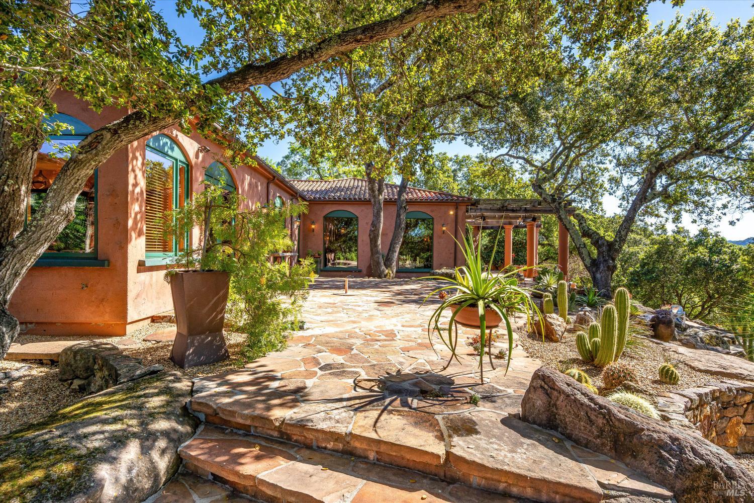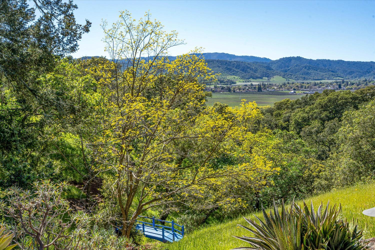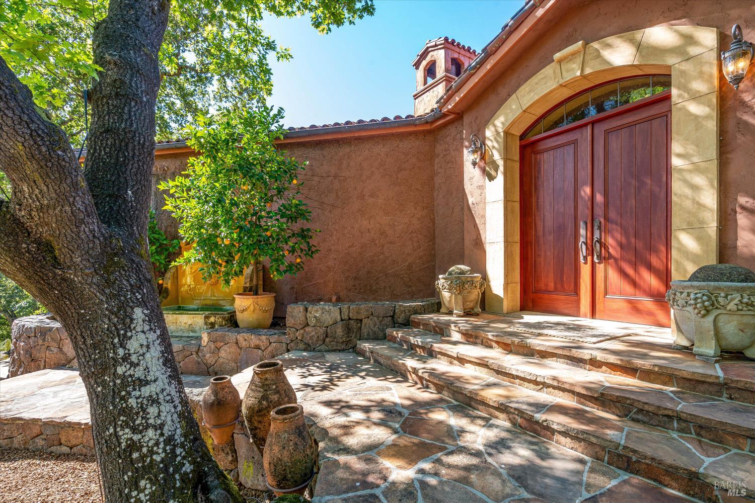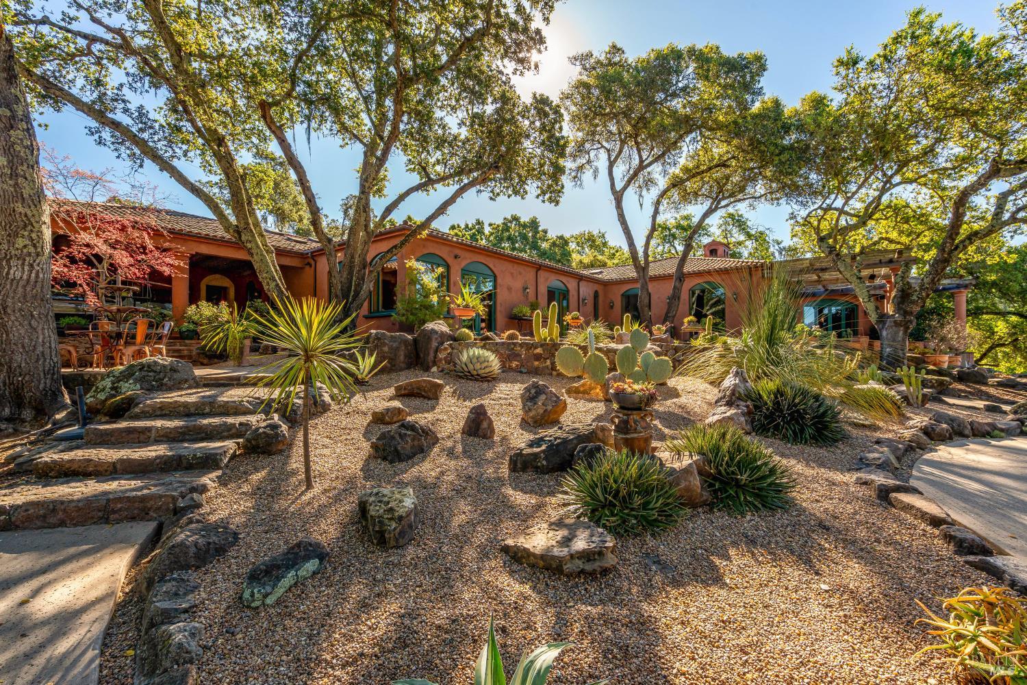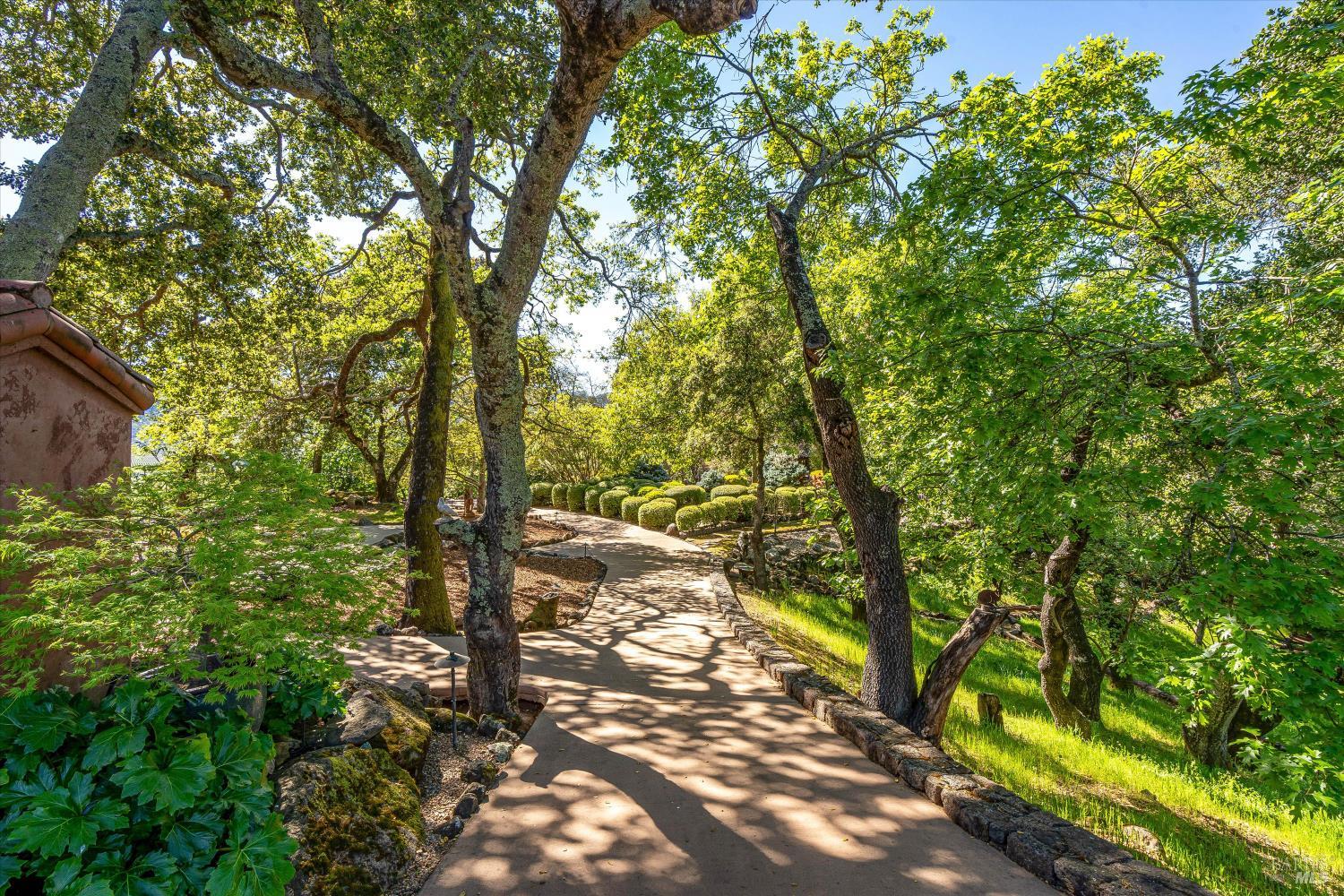 Privacy and Tranquility. Inspired by the French Provincial laid back life style, the owners have created a home on top a knoll with a harmonious atmosphere of style, comfort and serenity. To further enhance these feelings they created a Zen tea garden, trails meandering throughout the property, an alley of maple trees with an elevated walkway leading to a sitting area among the trees, a tiered succulent garden as well as an outdoor dining area with a pizza oven. The view...There is no word to describe the valley view on the one side and the Stags Leap mountain on the other but to physically experience the changing light throughout the day and the evolving seasons. The overall feeling is both calming and inspiring adding a sense of verdant tranquility to this special place. For the next owners of this incredible 20 acre property there is a unique opportunity, if desired, to turn the meadow into a vineyard, wine cave and winery at the heart of the world famous Stags Leap district.
