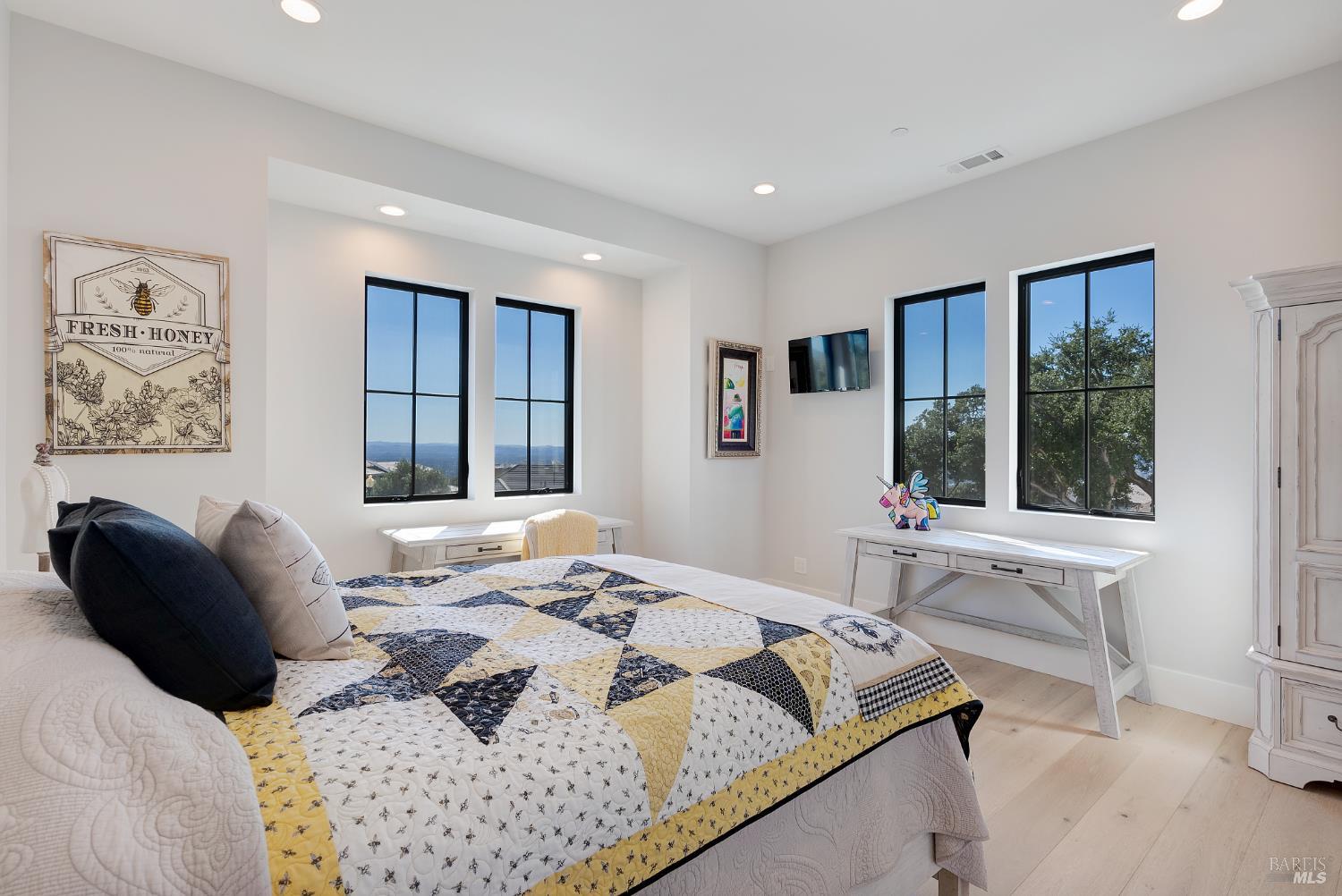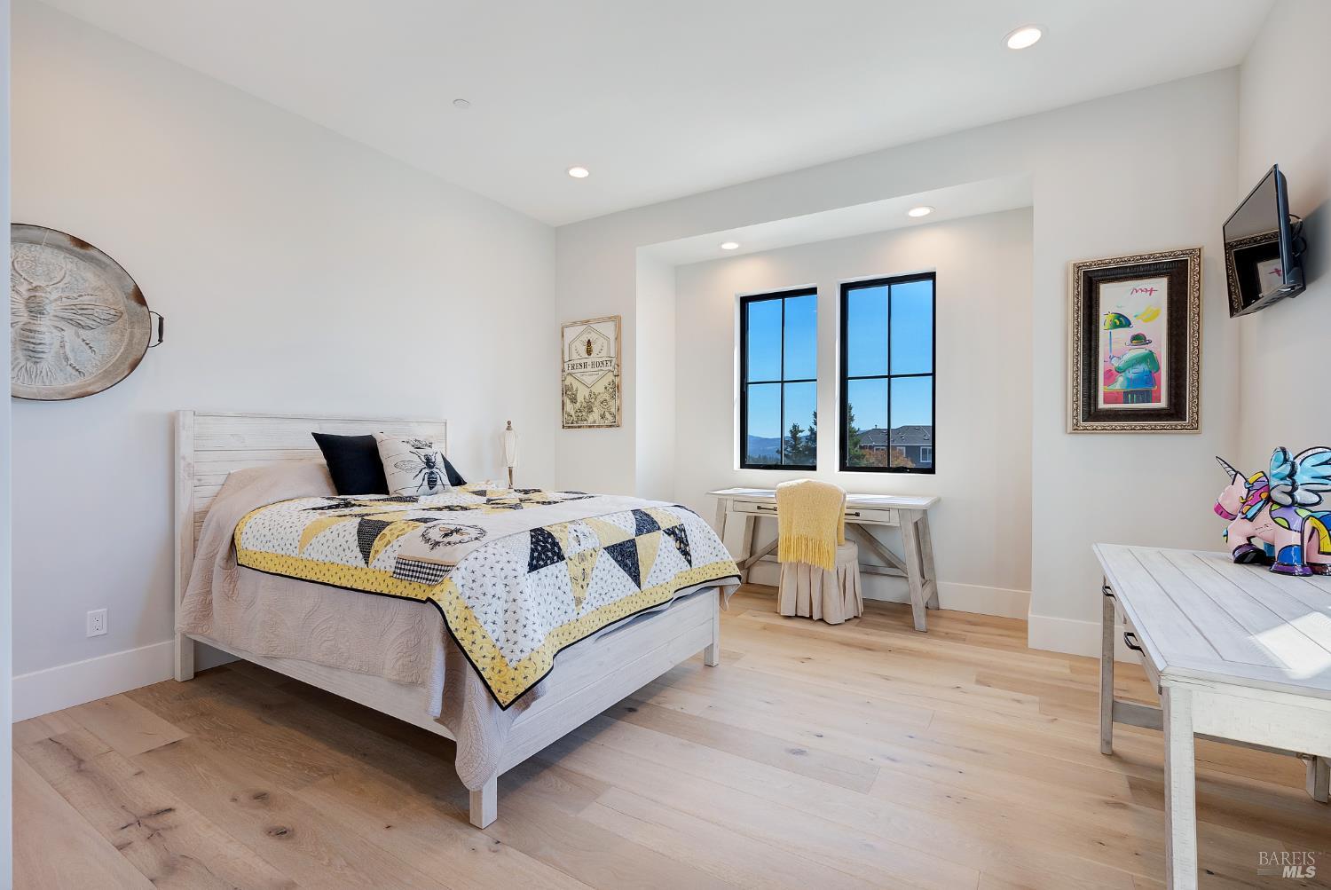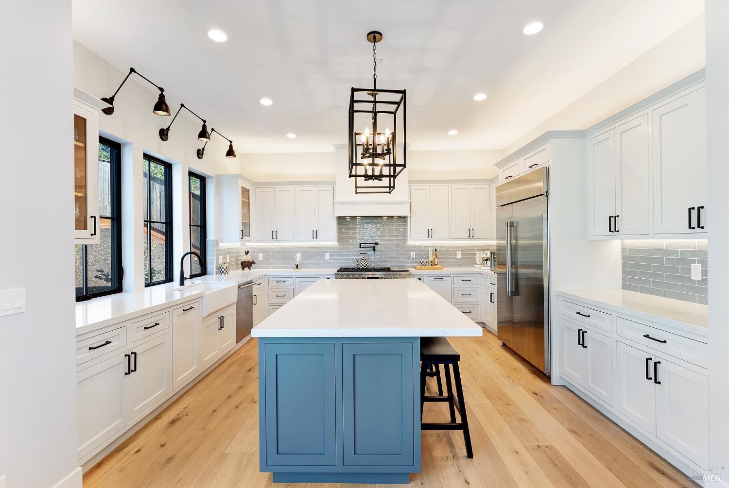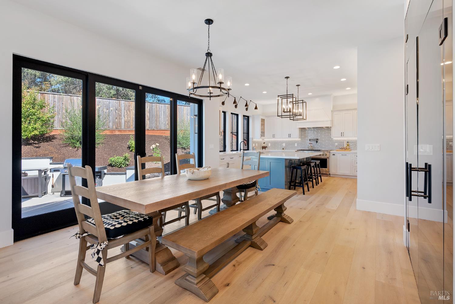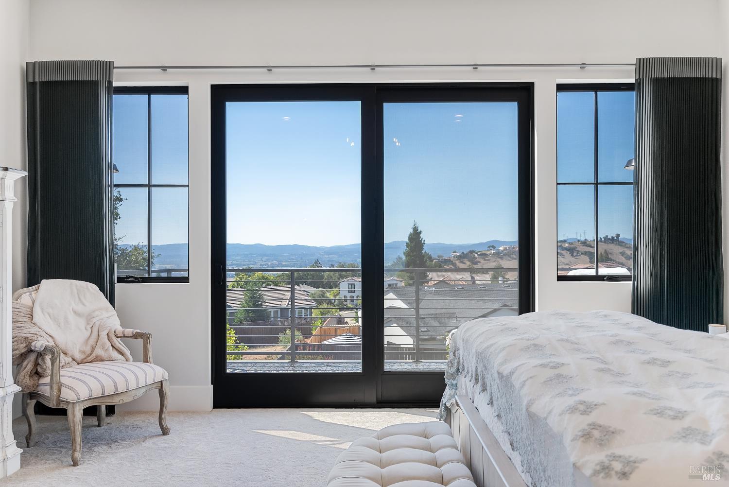 Stunning, Modern Farmhouse set on over a 0.30-acre lot at the end of a quiet cul-de-sac, featuring a walkout yard, new pool and spa. Sweeping views extend from much of the home and grounds, twinkling city lights, sunsets, and the distant coastal ranges. The main level is designed for effortless living and includes a secondary suite, home office, and an expansive great room with wine display and storage cellar, anchored by a chef's kitchen equipped with premium stainless steel GE Monogram appliances, including a 48 range, refrigerator, and dishwasher. Upstairs, the luxurious primary suite offers a sun-filled private deck, perfect for taking in the views. Two additional bedrooms share a dual-vanity bathroom. A spacious laundry room completes the upper level. The walkout backyard is ideal for both entertaining and everyday enjoyment, with three expansive patios, a flowing lawn, and a PebbleTec pool and spa. The garage is finished with a new epoxy floor, abundant natural light, and ample storage ready for vehicles, hobbies, or bonus space.