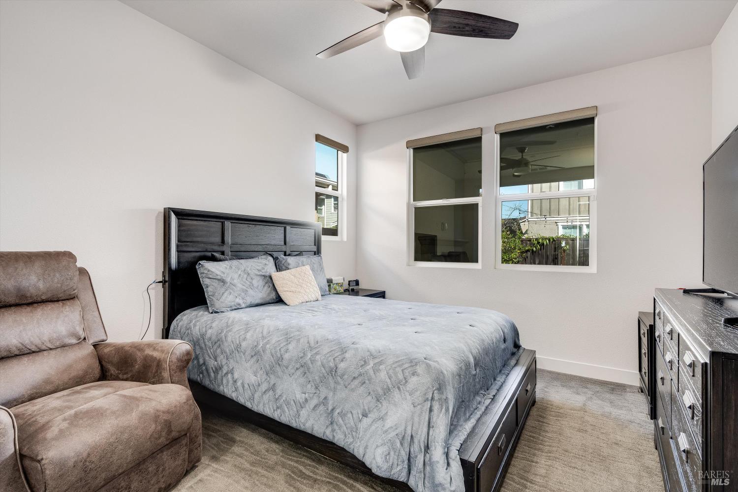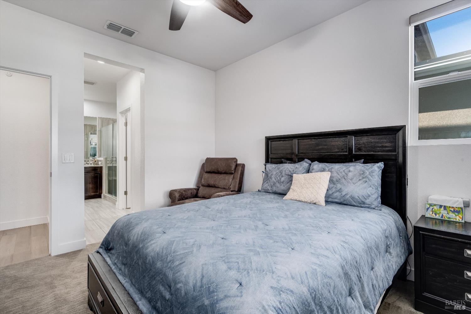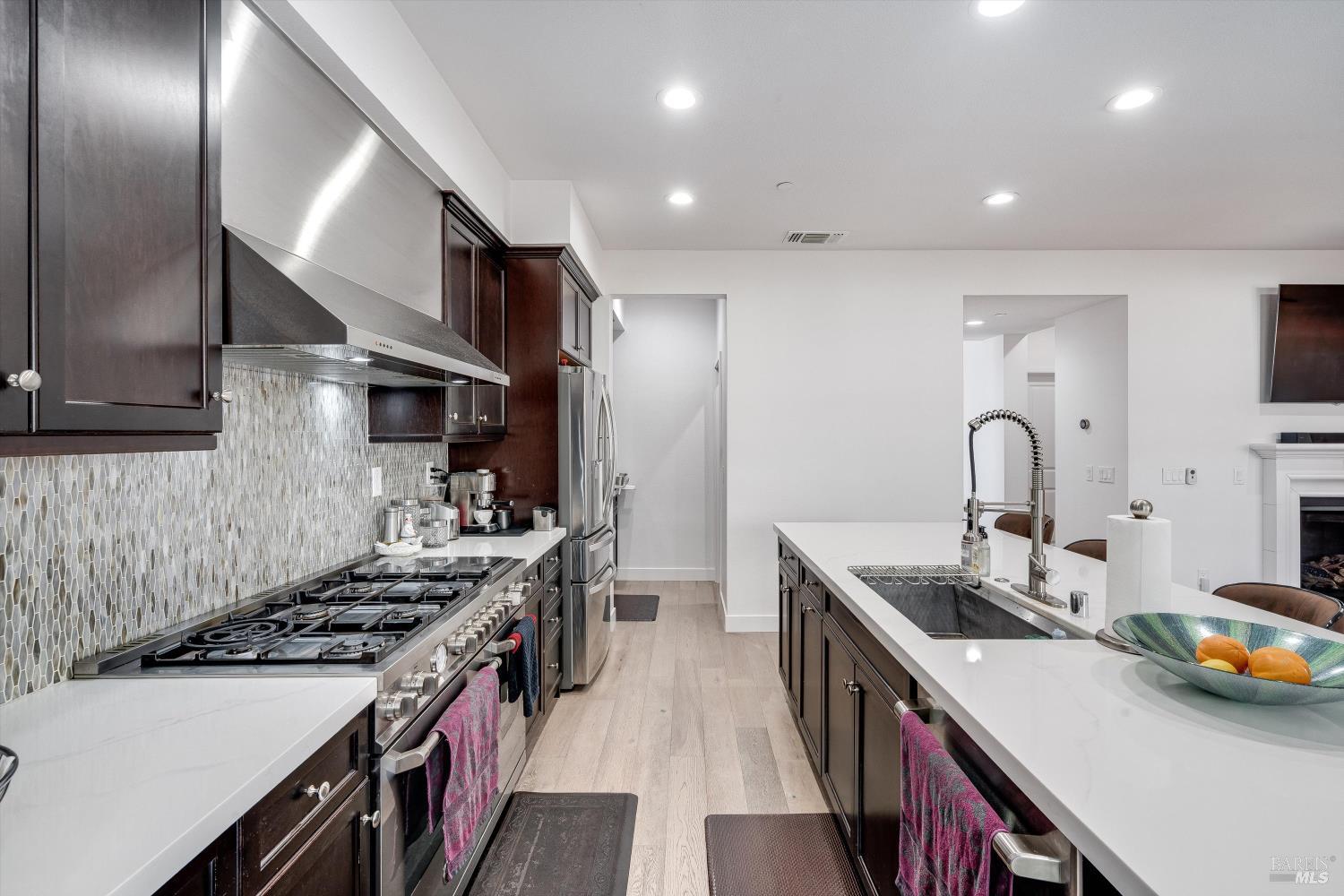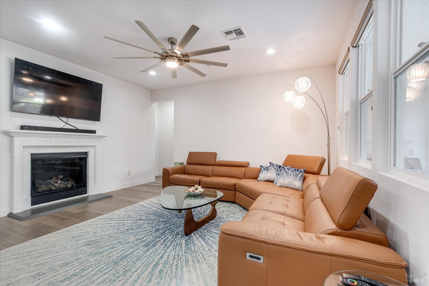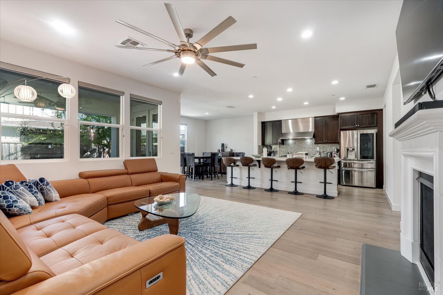 Imagine stepping through the door, as the golden rays of sunset spill across your sun-drenched haven, welcoming you, after a long day into over 3,000sqft, 5 bed/4 bath, 2 primary suites(1up/1down), with gleaming designer-painted walls catching the light & warm French Oak-look plank flooring underfoot, sleek updated cabinetry, and stainless steel appliances, beckon with promise. Beyond the kitchen, an inviting covered loggia calls for slow evening spritzers from the lemon/orange trees, while the corner lot offers effortless access to a private rear yard where spring's blooming, walnut & street trees drape soft foliage, whispering of shade, the drought-tolerant landscaping an eco-conscious display. Picture fireside moments as aerodynamic ceiling fan stirs the air, wrapping both indoors and out in gentle, cozy currents; & the great room flows with seamless grace, separation when you crave solitude, continuity when desire draws you together from the island bar, kitchen table, through sliding doors to the covered patio inviting laughter. Upstairs, a versatile flex space waits at the landing, ready to shape itself into your private gym, focused office, cinematic escape, or a possible bedroom for tomorrow's dreams. An abode enhanced by: tailored cabinetry, closet built-ins, mirrored doors, built-in outdoor fireplace, pre-plumbed entertainment systems & more. Nestled in a newer enclave (built 2019, NWSR), this home places the airport, wineries, fine dining, and world-renowned medical facilities within easy reach.
