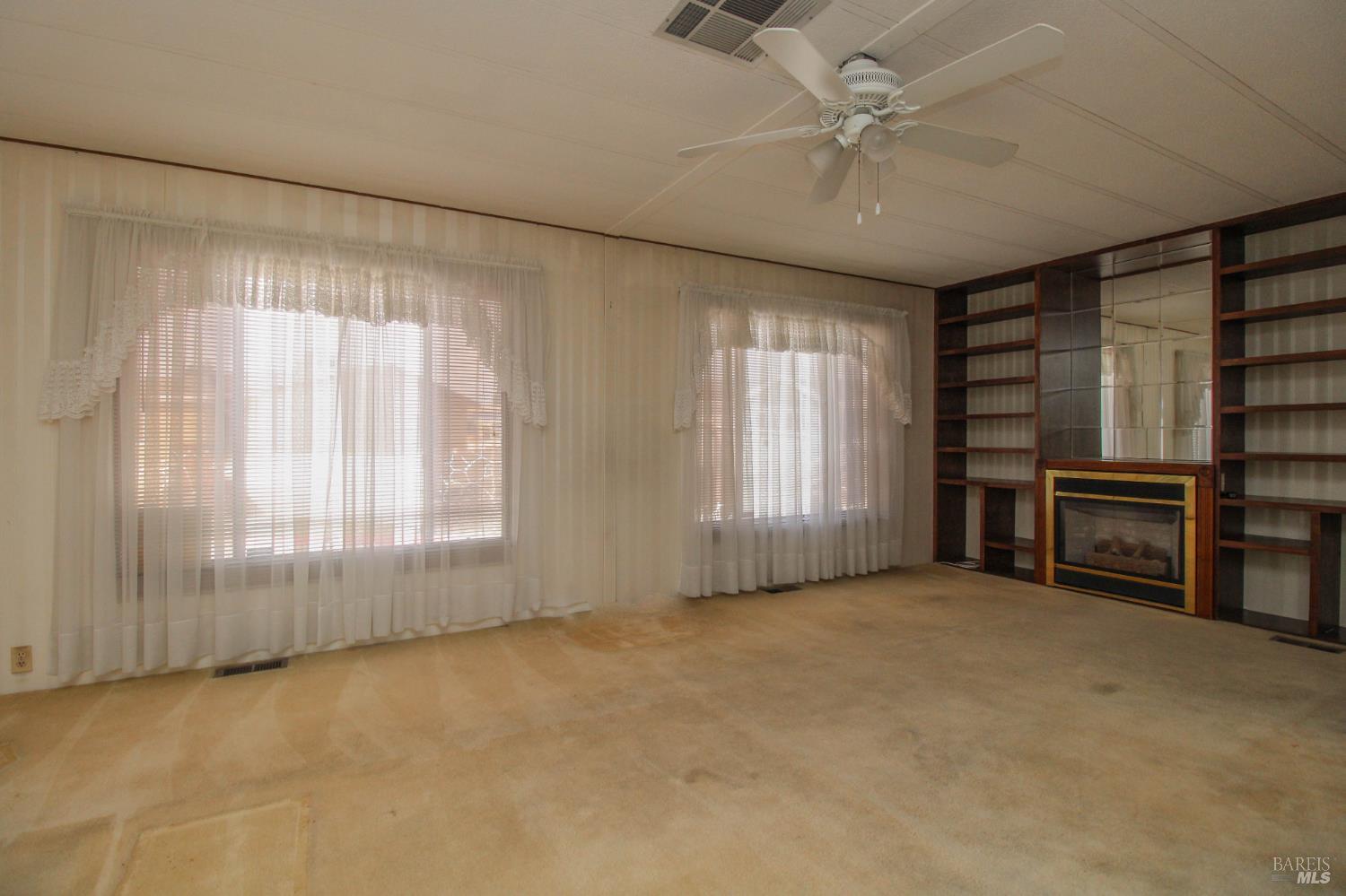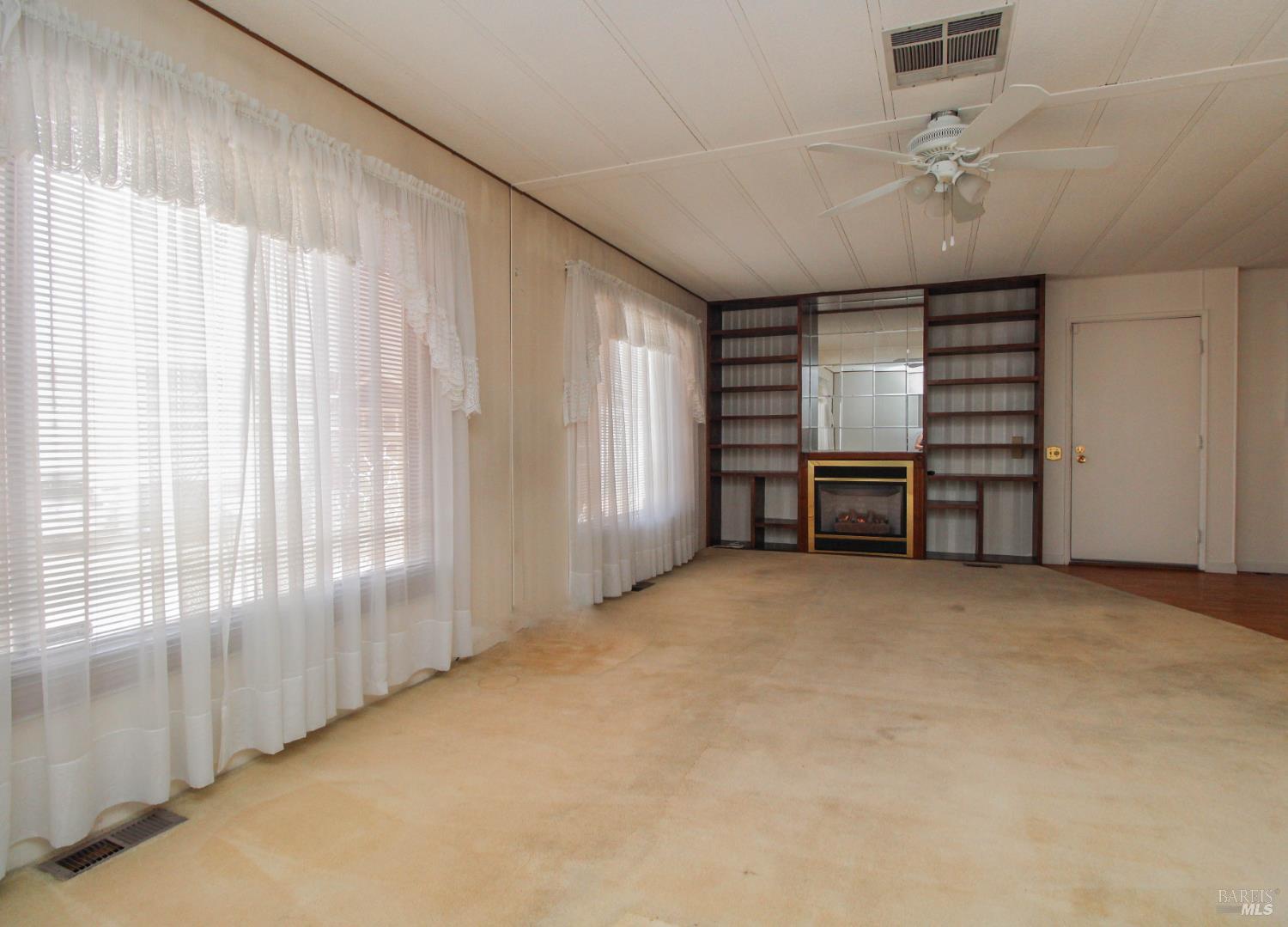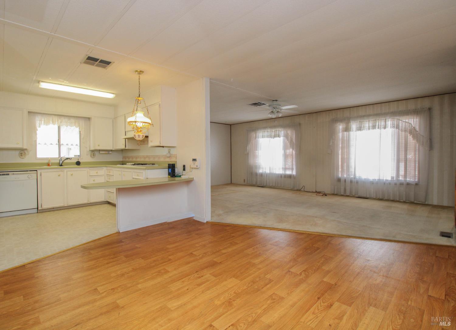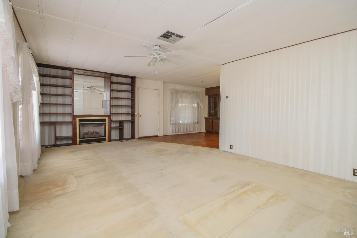 This 3 bedroom, 2 bathroom home offers great space and potential in a highly desirable family community. Built in 1974 and in original condition, this home is perfect for buyers looking to customize and add their personal touch.Features include a spacious and open living room with fireplace, abundant natural light, and built-in shelving for added character. The kitchen and living areas feel open and airy, ideal for everyday living. The home offers generously sized bedrooms, including a large primary suite with double sinks and ample closet space. Additional highlights include a spacious laundry room with sink and plenty of storage, central AC, ceiling fans, and a low-maintenance yard with an orange tree. Enjoy outdoor space with a side yard and added privacy with space between neighbors. Conveniently located next to guest parking with two-car parking available.Located in Dover Mobile Home Park, a family community near Travis Air Force Base, with easy access to the freeway and just minutes from Vacaville and surrounding areas.