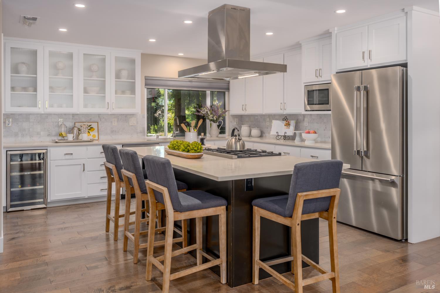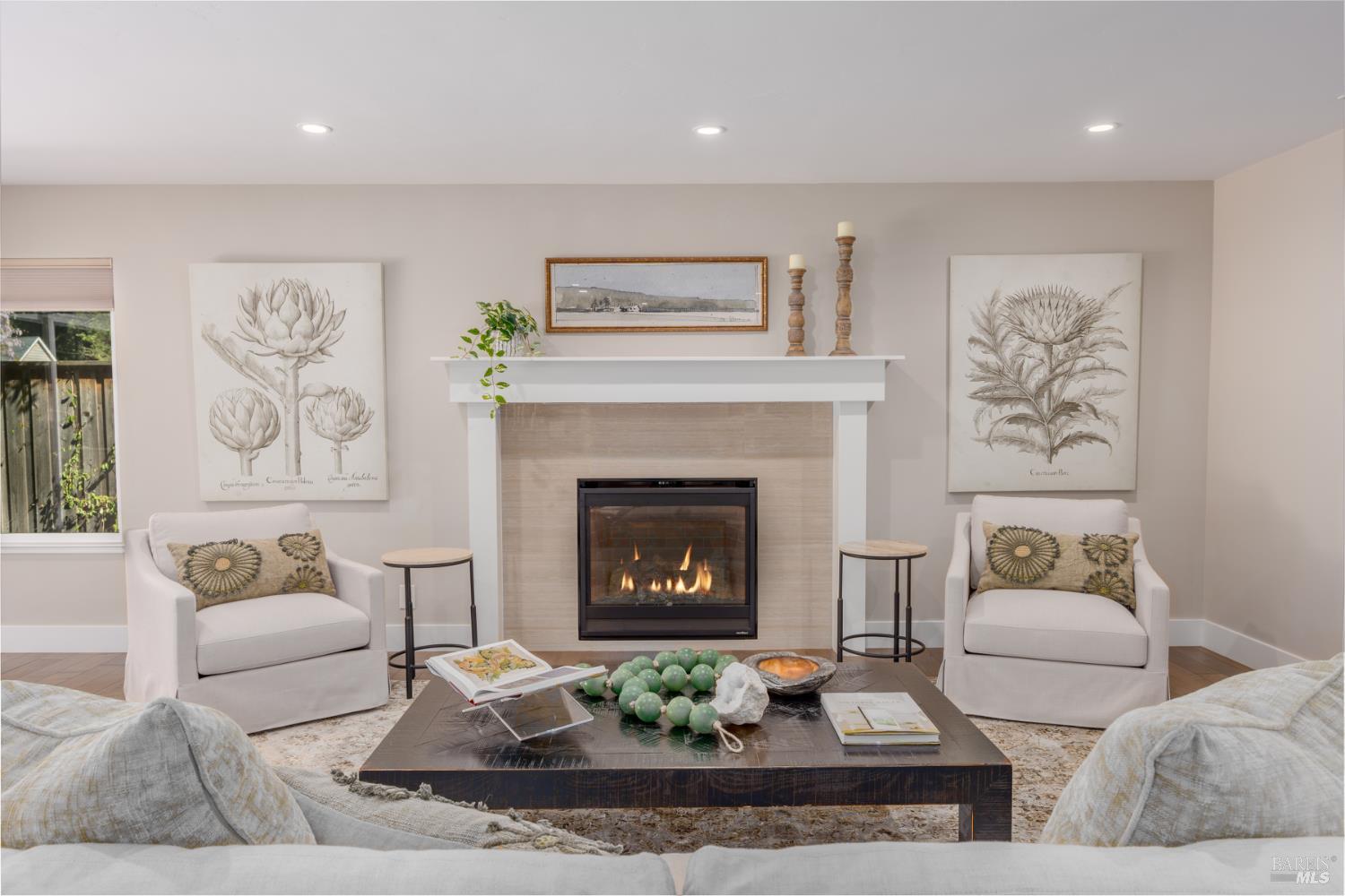 Located on a quiet street in Kenwood, this updated 3-bedroom, 3.5-bath home sits on approximately 0.5 acres surrounded by 23 mature redwood trees with views of Sugarloaf Ridge and nearby vineyards. Remodeled by Synergy Architects and Designers, the approximately 2,200 sq ft residence features classic contemporary styling and an open living, dining, and kitchen area designed for entertaining. Quartz countertops, textured walls and ceilings, a marble and tile fireplace surround, and a suspended kitchen vent hood create distinctive design elements. Large sliding glass doors provide broad access to the spacious backyard dotted with redwoods and peach trees. The front yard features mound gardens and a long paved driveway with embedded lighting. Additional highlights include an attached 3-car garage with epoxy flooring and built-in storage, Bosch refrigerator (2026), new carpeting (2026), Generic generator (2020), water heater replacement (2019), and Nest smart home features.