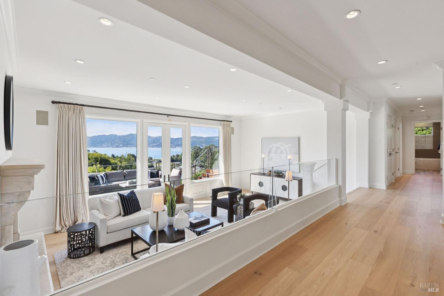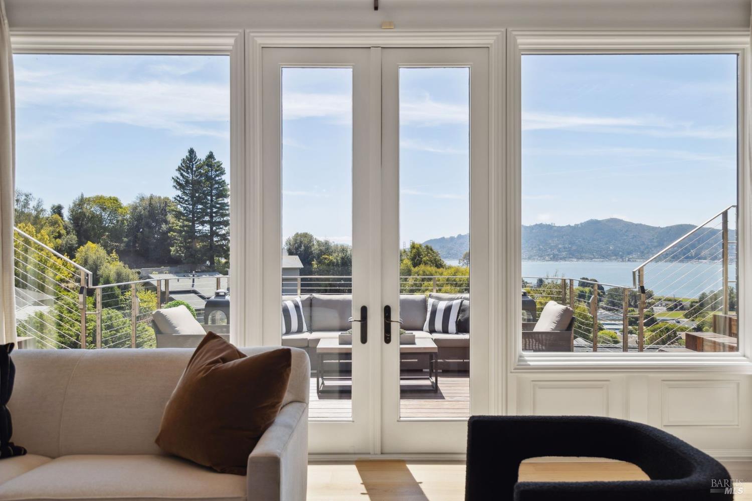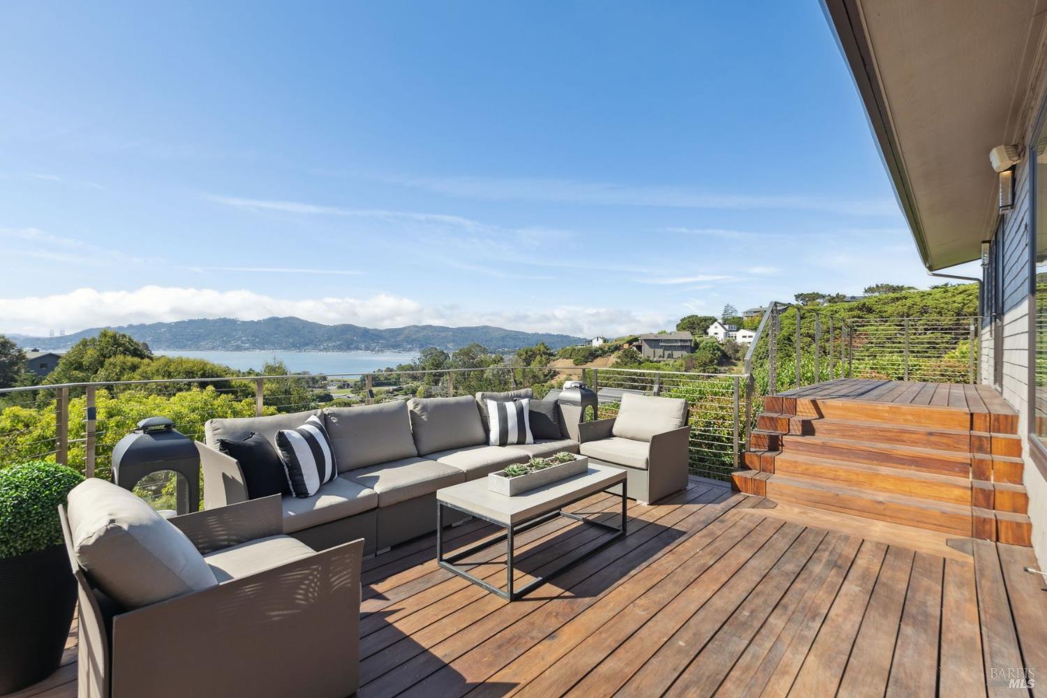 Perfectly sited on a private SW-facing cul-de-sac, this remodeled residence showcases some of the most iconic views in the Bay Area. Sweeping panoramas of the Golden Gate Bridge, Sausalito, Richardson Bay & surrounding hills provide a breathtaking backdrop. The 4,000 sq ft contemporary home has been extensively upgraded & thoughtfully designed for comfort & entertaining. The 5BD/4BA residence features hardwood floors, renovated baths, skylights flooding interiors w/ natural light & multiple view decks for seamless indoor/outdoor living. The open-concept kitchen w/ Calacatta stone flows to the family rm, breakfast area & adjoining living space. The primary suite upstairs lives like a retreat, while 3 additional BRs are together on the main level. A custom-built library w/ en suite bath doubles as office or guest quarters. Wellness amenities include a private sauna and spa, while gated and fenced grounds ensure privacy. Set on approximately half an acre, the landscaped property also features a miniature golf course. Resort-style amenities balance w/ the warmth & functionality of a family home. This rare combo of privacy, scale & world-class views is minutes from Hwy 101, schools, Blackie's Pasture, Woodlands Market & local restaurants.