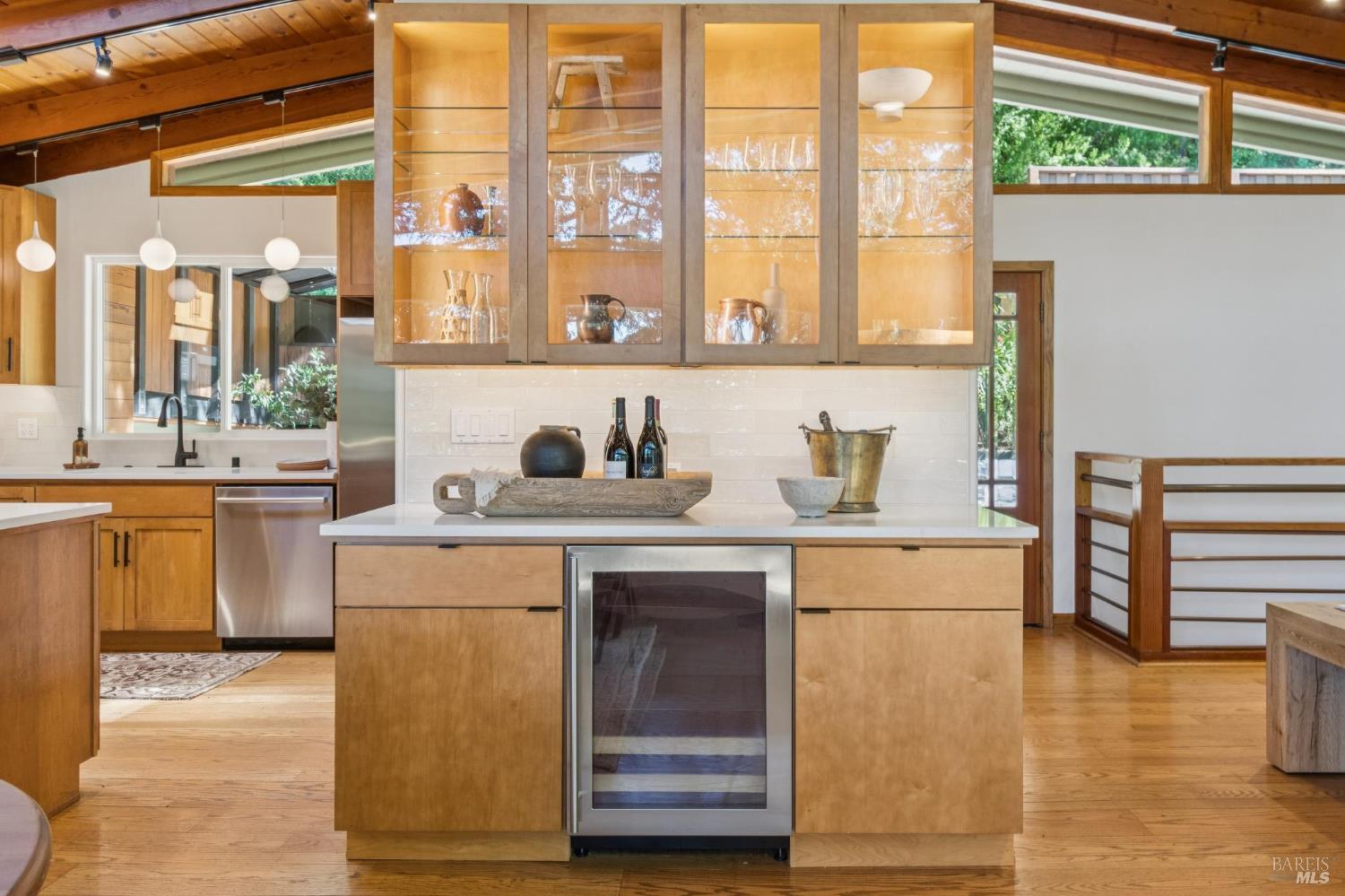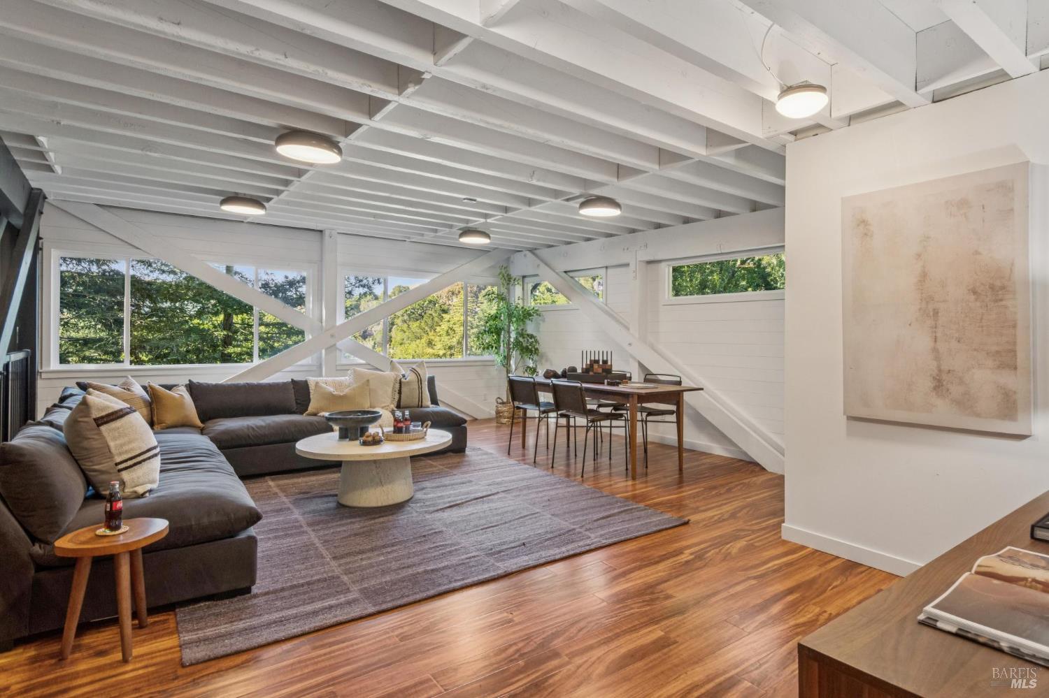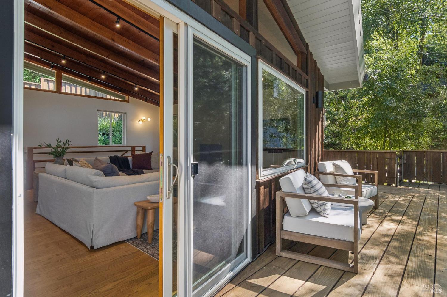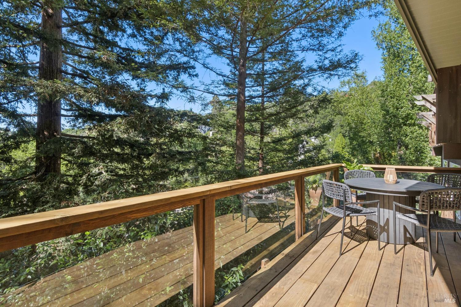 A true refuge awaits at 94 Berkeley, ideally positioned on a quiet cul-de-sac in one of San Anselmo's most sought-after neighborhoods. Designed to capture natural light and sweeping views, the open-concept layout features vaulted ceilings, expansive windows, and sliding glass doors that create a seamless indoor-outdoor connection. A custom fireplace anchors the living room, adding warmth to the home's mid-century inspired design. The updated kitchen is both functional and refined. It's centered around a generous peninsula with counter seating, under-cabinet lighting, and built-in cabinetry, including a dedicated coffee station. Extensive redwood decks wrap the main level, offering multiple spaces to entertain, dine, or unwind in a private, elevated setting, complete with a hot tub. Downstairs, there are three bedrooms and two bathrooms, including a primary suite with French doors that open to a secluded, private deck. Two expansive bonus spaces provide flexibility for a home office, gym, media room, or additional living areas. Just outside, trail access leads to Faude Park and sweeping vistas, while downtown Fairfax and San Anselmo are minutes away. With Brookside Elementary nearby, the home offers a lifestyle defined by ease, access, and connection to nature.