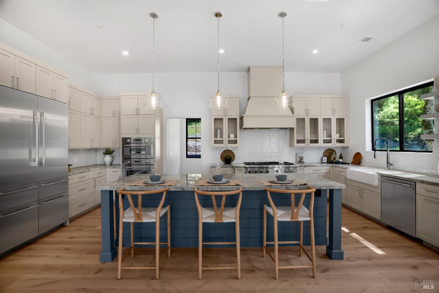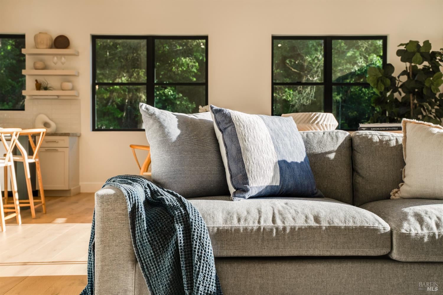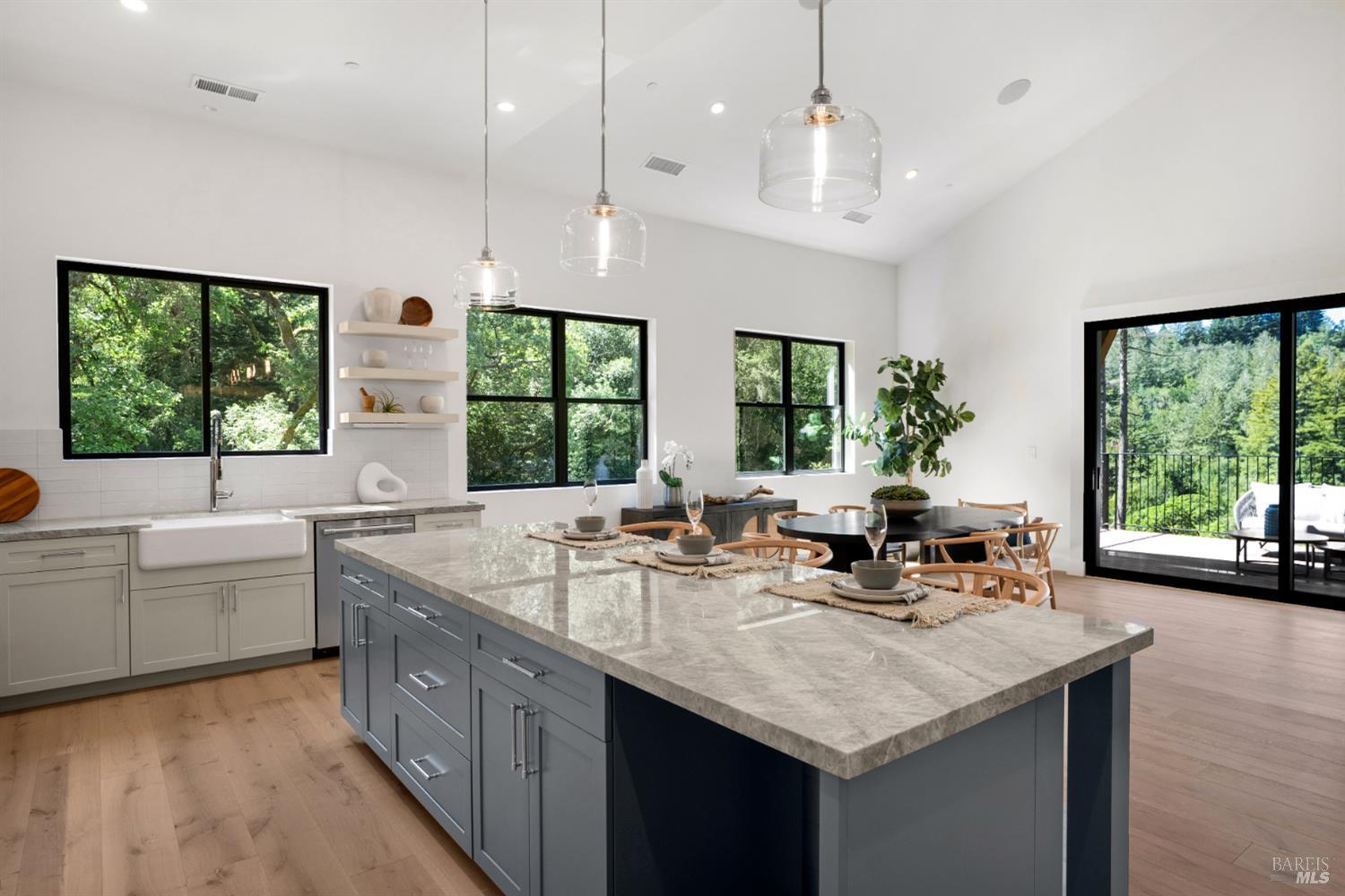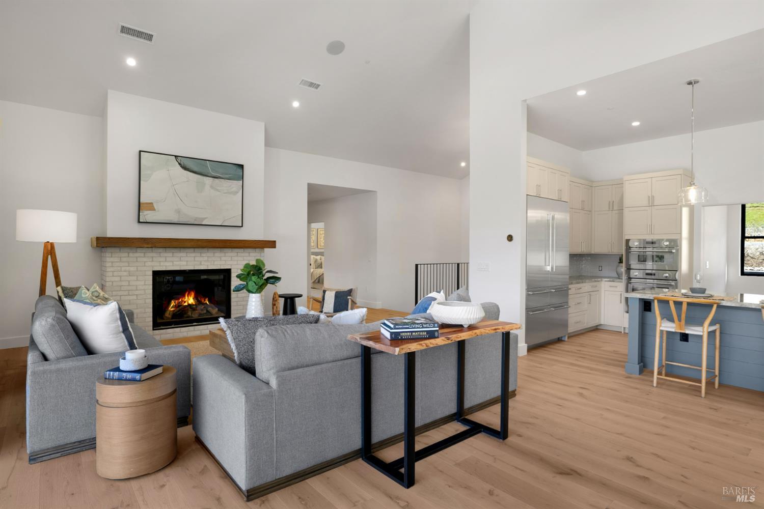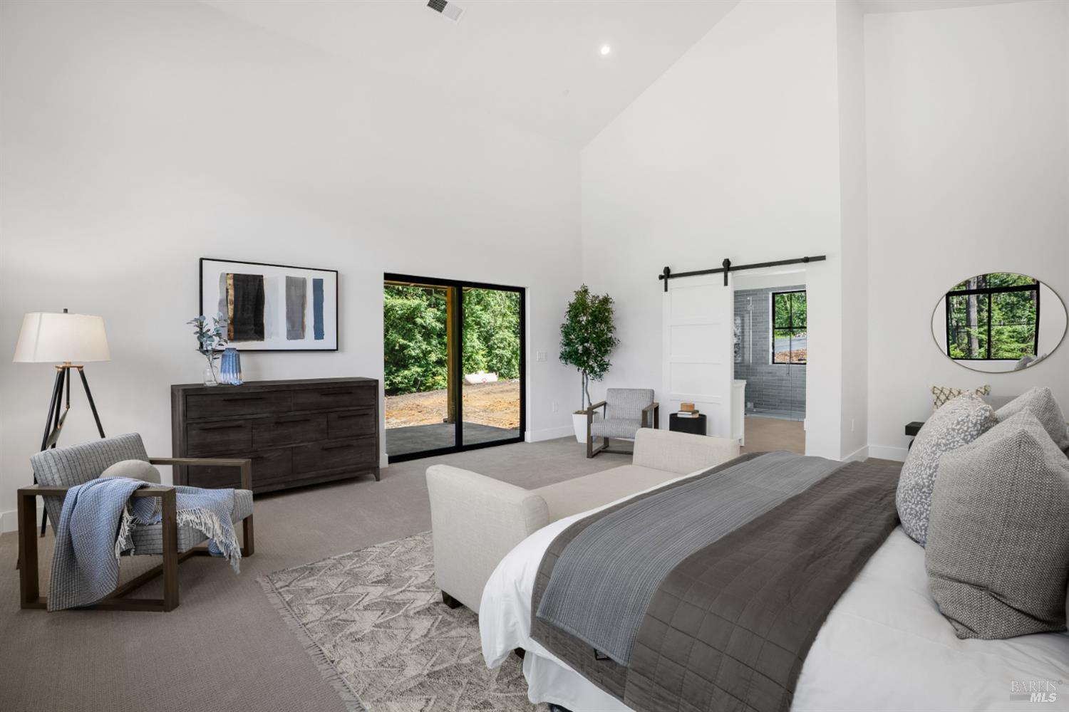 Contemporary craftsman estate on 2 private view acres in Sebastopol's scenic countryside offering single-level living with luxury finishes, abundant natural light, and seamless indoor-outdoor flow. 3BD + office, 3.5BA home features an open-concept great room with engineered wood floors, gas fireplace with stone surround, and large sliding doors opening to an expansive view deck. Chef's kitchen includes quartzite slab countertops, farmhouse sink, undercabinet lighting, premium Thermador appliances, and a walk-in pantry with sink, cabinetry, and windows. Primary suite retreat with vaulted ceilings (14-21 ft), private patio access, and serene views. Spa-inspired bath with freestanding soaking tub, curbless walk-in shower, dual vanities, walk-in closet, and separate water closet. Two additional ensuite bedrooms with walk-in closets plus a dedicated office with beautiful natural light. Additional features include elegant powder room, laundry room with exterior access, sink and quartzite counters, engineered wood flooring, and thoughtful modern design throughout. Unconditioned lower level with plumbing and electrical in place offers potential for a 1200 sf 2 bedroom additional dwelling unit, guest suite, or studio. Lower level is 2994 sf as well as 336 sf of deck and 332 sf of covered porches. 5 bedroom septic installed and ready for ADU. 3.28 kW solar photovoltaic system. Terraced landscaping with irrigation and lighting, open meadow, shared well with 5,000-gallon holding tank, solar panels, and 6-car garage. Private, peaceful setting just minutes from downtown Sebastopol and the Sonoma Coast.