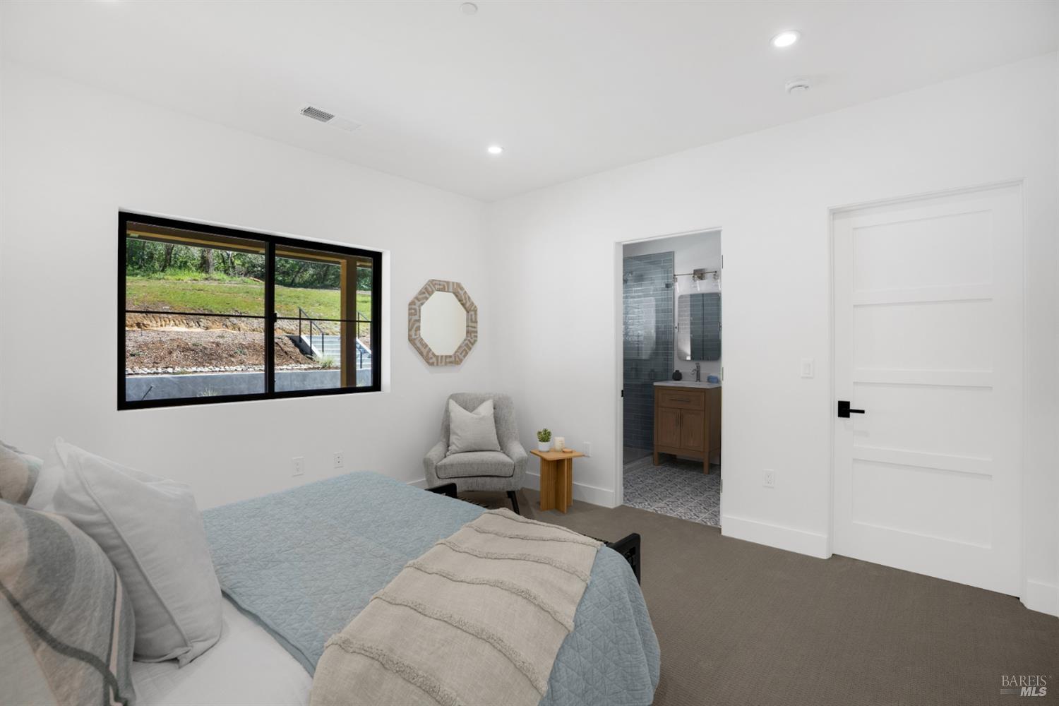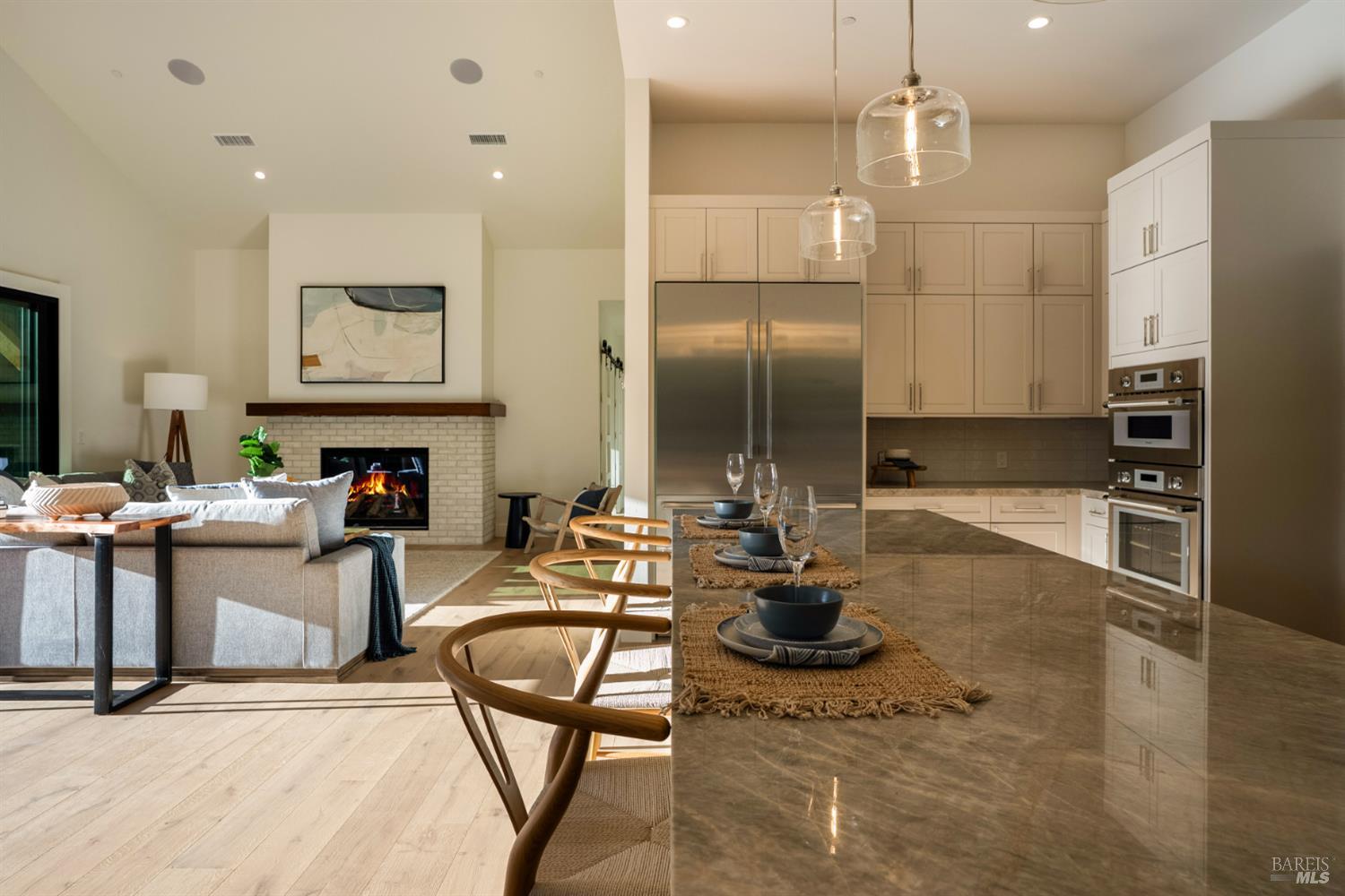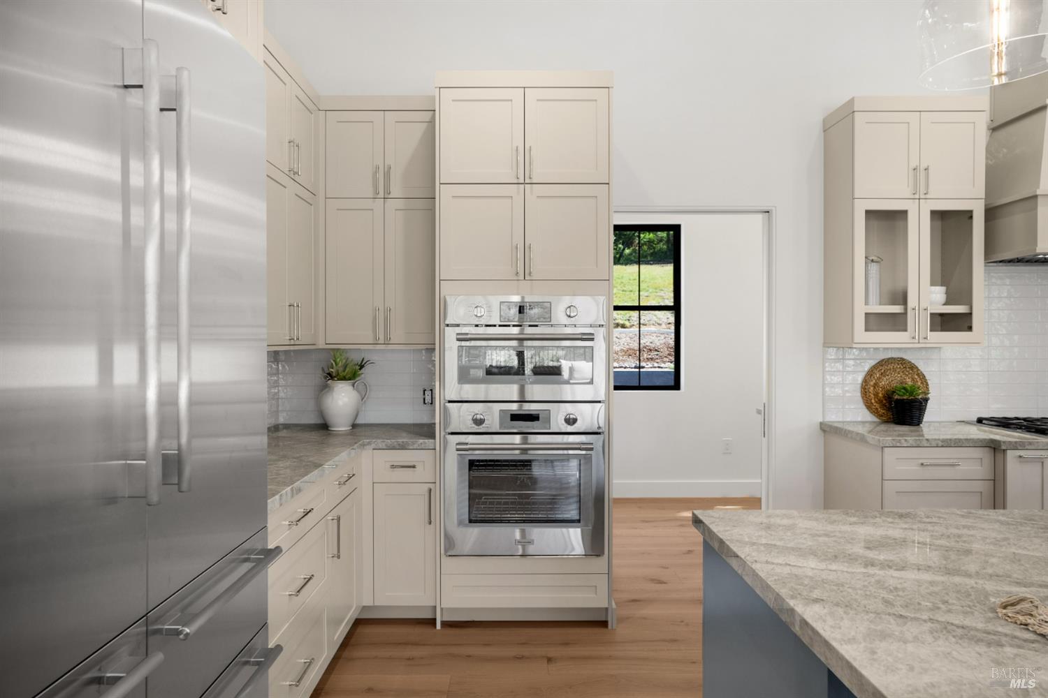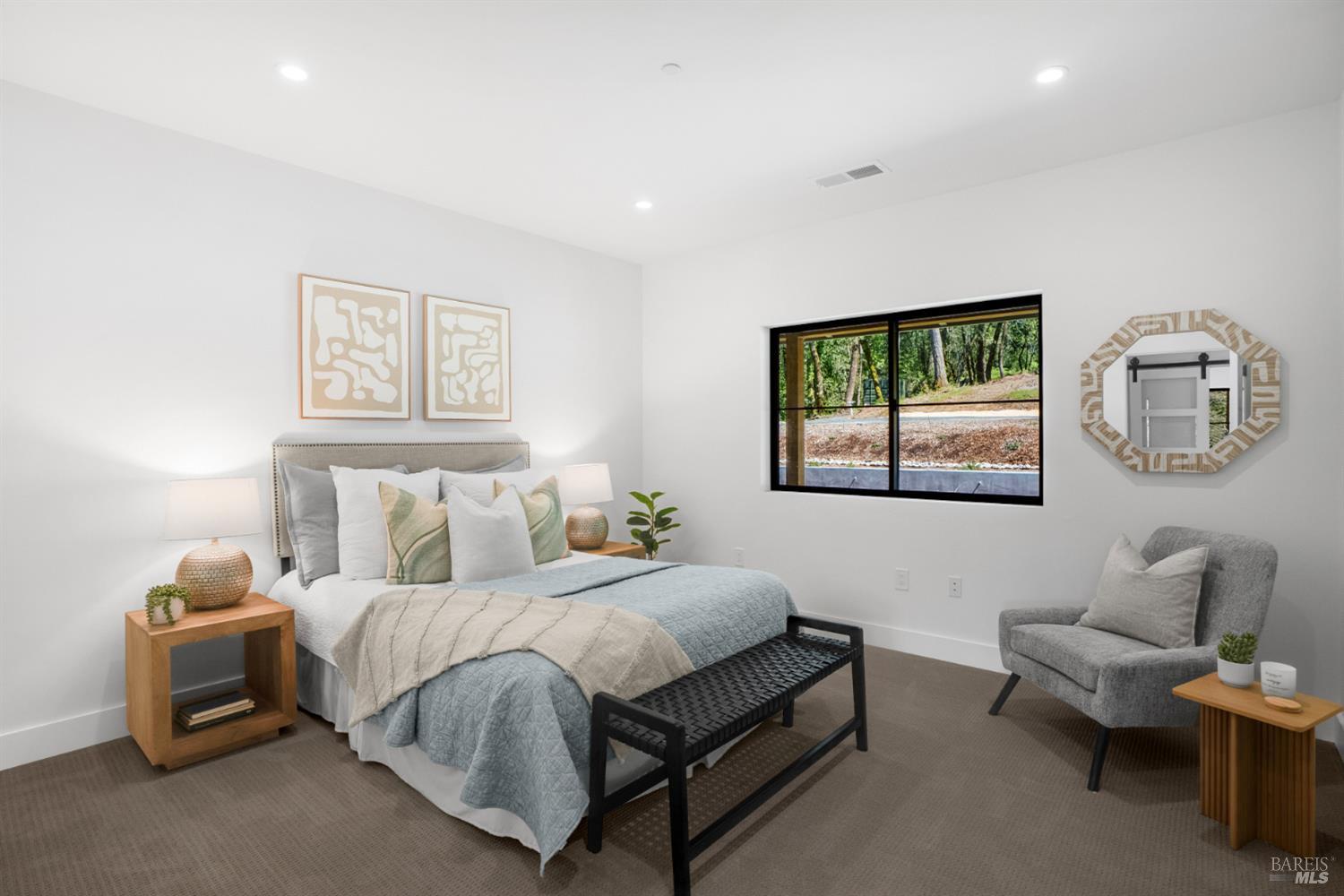 Contemporary craftsman estate on 2 private view acres in Sebastopol's scenic countryside offering single-level living with luxury finishes, abundant natural light, and seamless indoor-outdoor flow. 3BD + office, 3.5BA home features an open-concept great room with engineered wood floors, gas fireplace with stone surround, and large sliding doors opening to an expansive view deck. Chef's kitchen includes quartzite slab countertops, farmhouse sink, undercabinet lighting, premium Thermador appliances, and a walk-in pantry with sink, cabinetry, and windows. Primary suite retreat with vaulted ceilings (14-21 ft), private patio access, and serene views. Spa-inspired bath with freestanding soaking tub, curbless walk-in shower, dual vanities, walk-in closet, and separate water closet. Two additional ensuite bedrooms with walk-in closets plus a dedicated office with beautiful natural light. Additional features include elegant powder room, laundry room with exterior access, sink and quartzite counters, engineered wood flooring, and thoughtful modern design throughout. Unconditioned lower level with plumbing and electrical in place offers potential for a 1200 sf 2 bedroom additional dwelling unit, guest suite, or studio. Lower level is 2994 sf as well as 336 sf of deck and 332 sf of covered porches. 5 bedroom septic installed and ready for ADU. 3.28 kW solar photovoltaic system. Terraced landscaping with irrigation and lighting, open meadow, shared well with 5,000-gallon holding tank, solar panels, and 6-car garage. Private, peaceful setting just minutes from downtown Sebastopol and the Sonoma Coast.