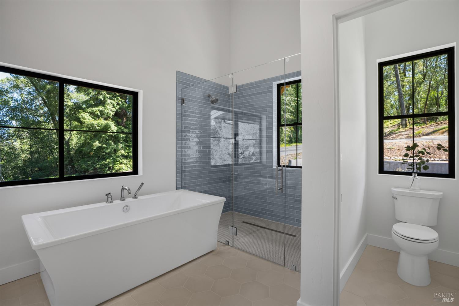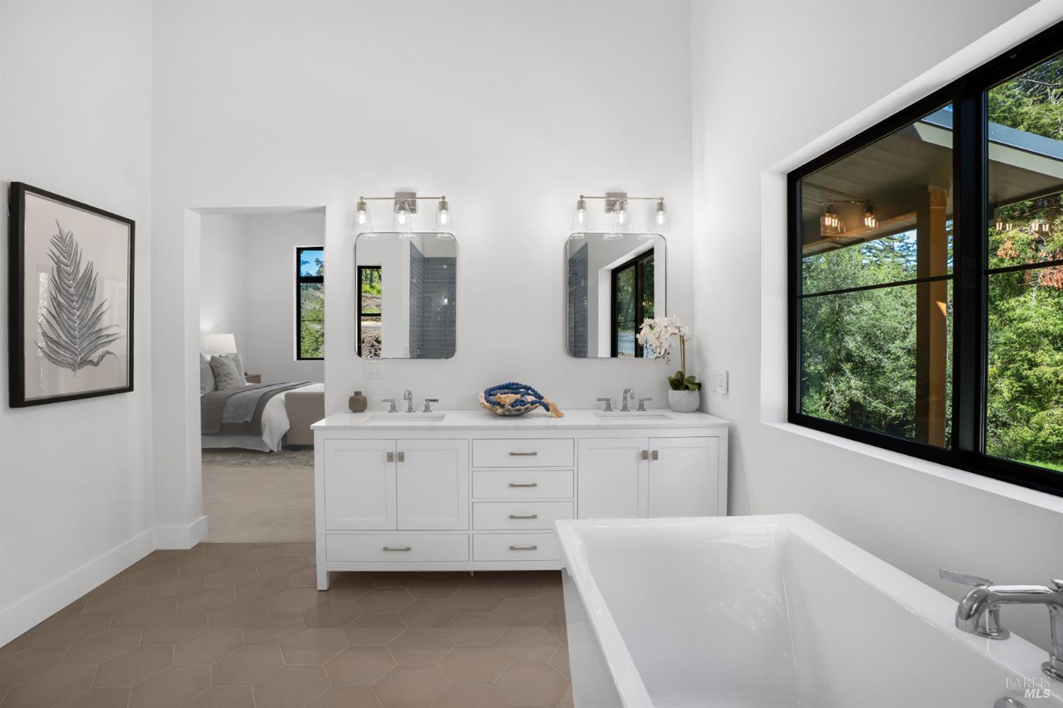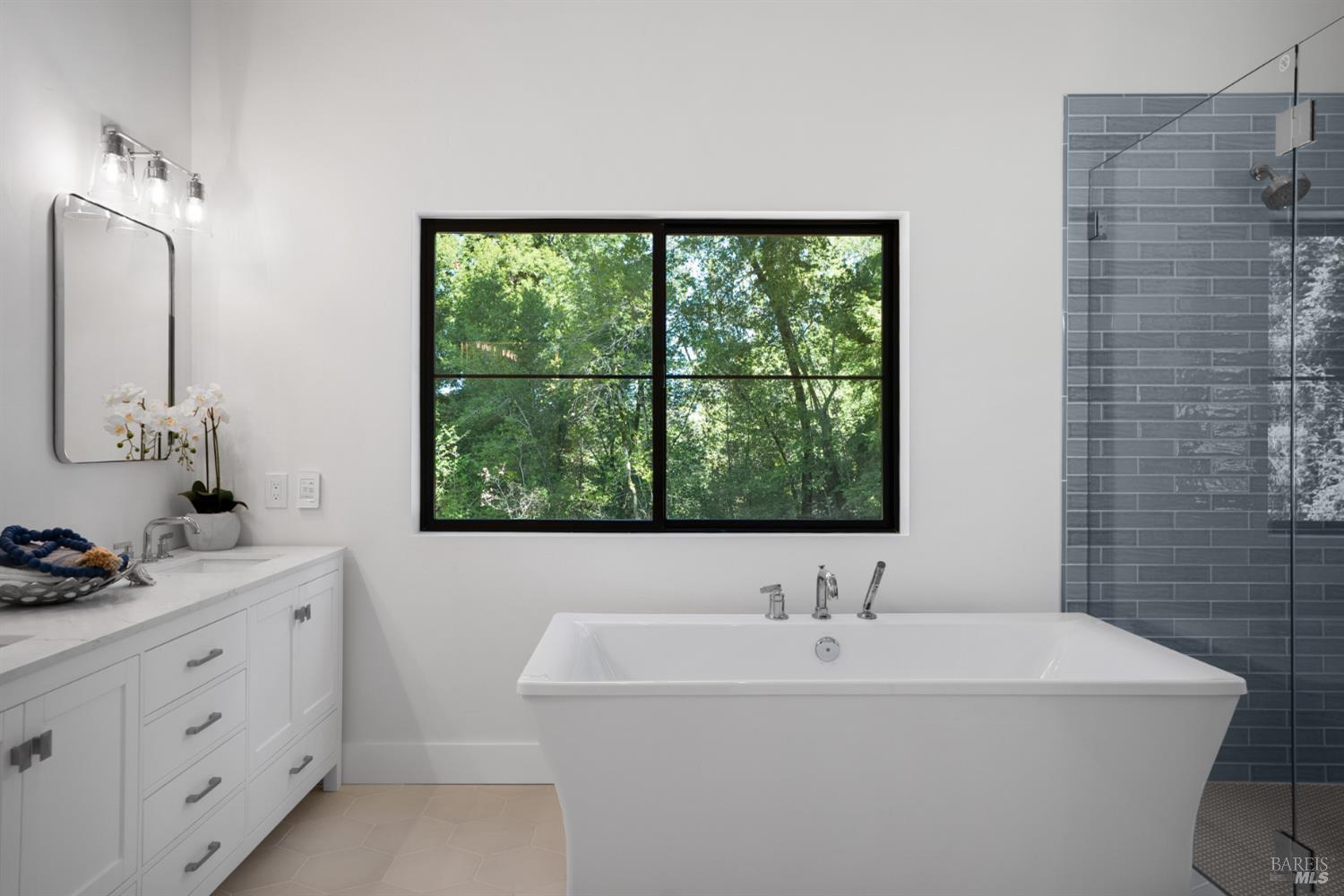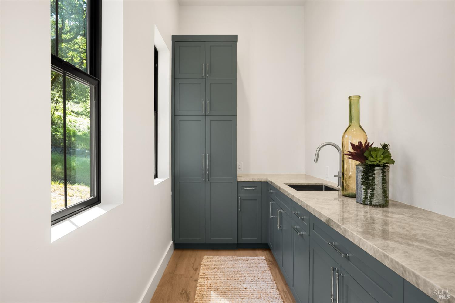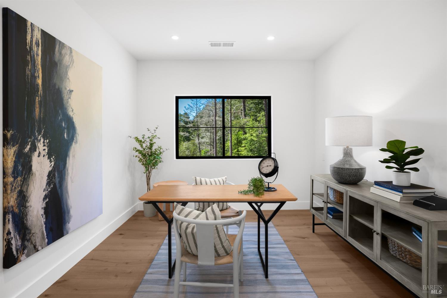 Contemporary craftsman estate on 2 private view acres in Sebastopol's scenic countryside offering single-level living with luxury finishes, abundant natural light, and seamless indoor-outdoor flow. 3BD + office, 3.5BA home features an open-concept great room with engineered wood floors, gas fireplace with stone surround, and large sliding doors opening to an expansive view deck. Chef's kitchen includes quartzite slab countertops, farmhouse sink, undercabinet lighting, premium Thermador appliances, and a walk-in pantry with sink, cabinetry, and windows. Primary suite retreat with vaulted ceilings (14-21 ft), private patio access, and serene views. Spa-inspired bath with freestanding soaking tub, curbless walk-in shower, dual vanities, walk-in closet, and separate water closet. Two additional ensuite bedrooms with walk-in closets plus a dedicated office with beautiful natural light. Additional features include elegant powder room, laundry room with exterior access, sink and quartzite counters, engineered wood flooring, and thoughtful modern design throughout. Unconditioned lower level with plumbing and electrical in place offers potential for a 1200 sf 2 bedroom additional dwelling unit, guest suite, or studio. Lower level is 2994 sf as well as 336 sf of deck and 332 sf of covered porches. 5 bedroom septic installed and ready for ADU. 3.28 kW solar photovoltaic system. Terraced landscaping with irrigation and lighting, open meadow, shared well with 5,000-gallon holding tank, solar panels, and 6-car garage. Private, peaceful setting just minutes from downtown Sebastopol and the Sonoma Coast.