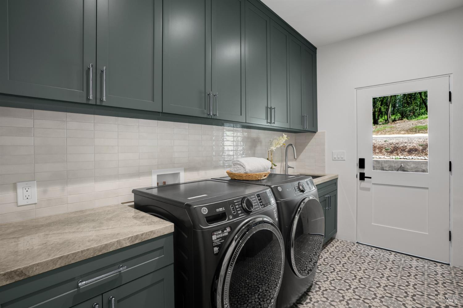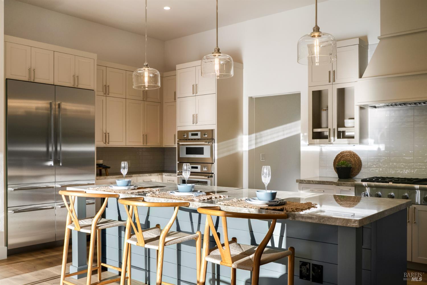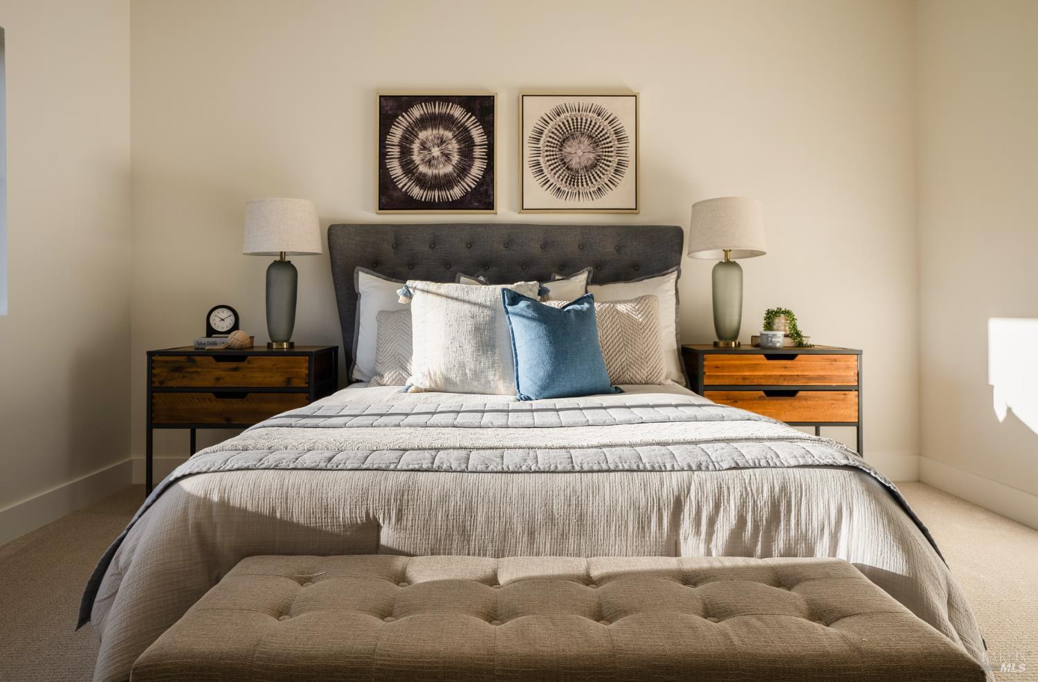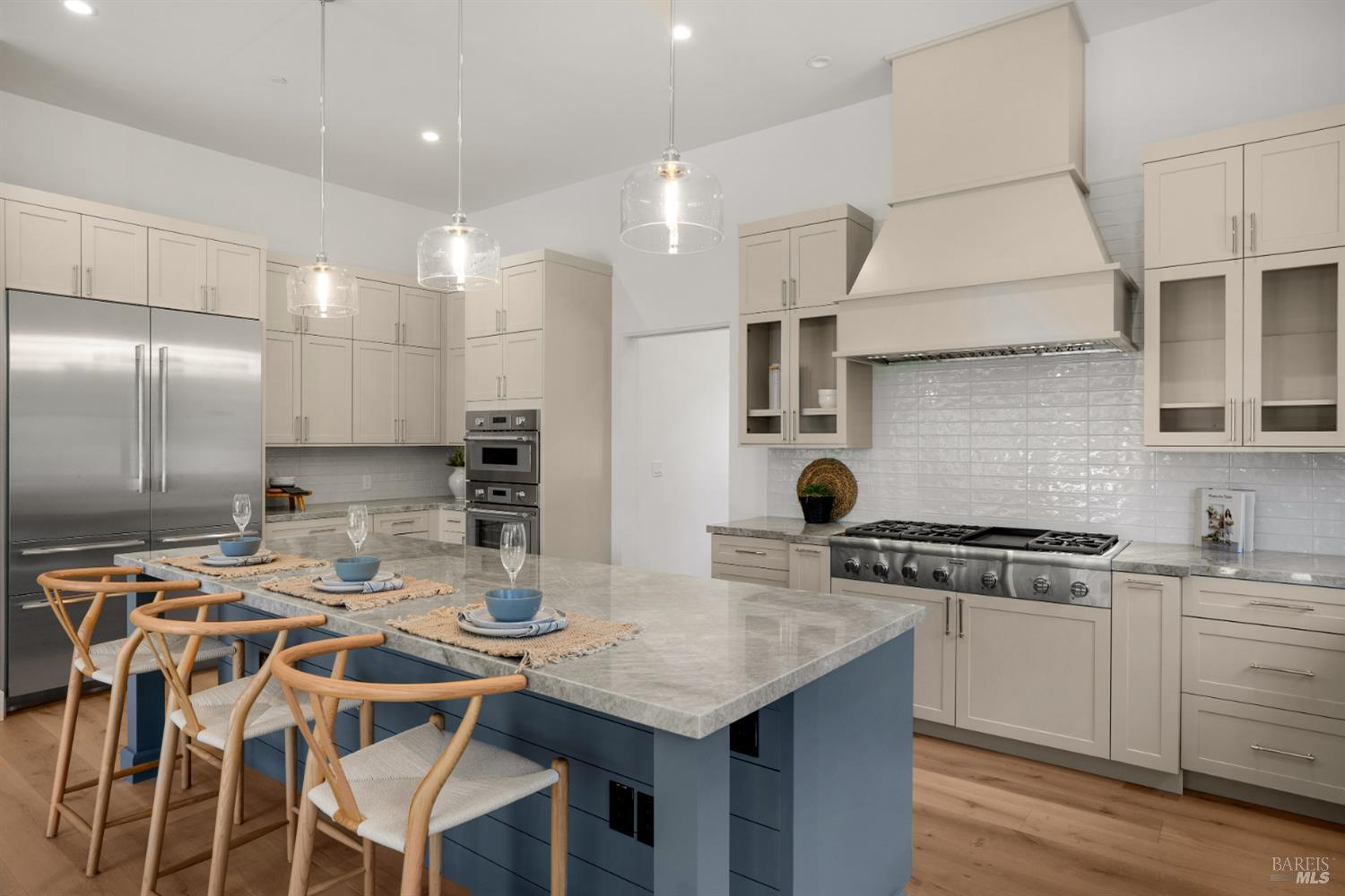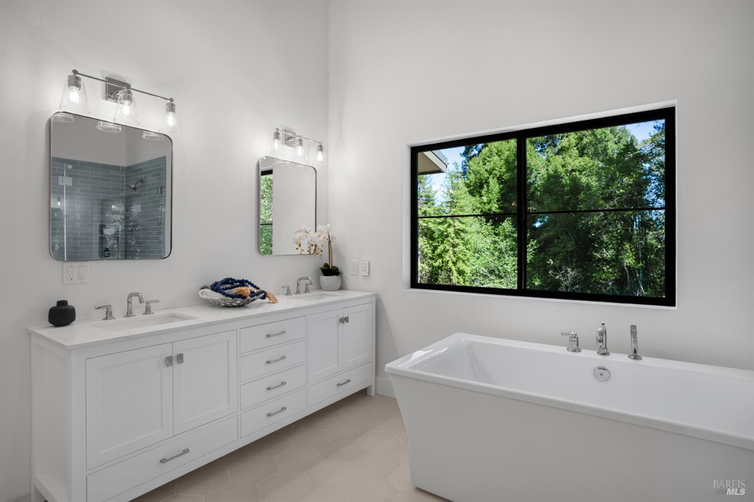 Contemporary craftsman estate on 2 private view acres in Sebastopol's scenic countryside offering single-level living with luxury finishes, abundant natural light, and seamless indoor-outdoor flow. 3BD + office, 3.5BA home features an open-concept great room with engineered wood floors, gas fireplace with stone surround, and large sliding doors opening to an expansive view deck. Chef's kitchen includes quartzite slab countertops, farmhouse sink, undercabinet lighting, premium Thermador appliances, and a walk-in pantry with sink, cabinetry, and windows. Primary suite retreat with vaulted ceilings (14-21 ft), private patio access, and serene views. Spa-inspired bath with freestanding soaking tub, curbless walk-in shower, dual vanities, walk-in closet, and separate water closet. Two additional ensuite bedrooms with walk-in closets plus a dedicated office with beautiful natural light. Additional features include elegant powder room, laundry room with exterior access, sink and quartzite counters, engineered wood flooring, and thoughtful modern design throughout. Unconditioned lower level with plumbing and electrical in place offers potential for a 1200 sf 2 bedroom additional dwelling unit, guest suite, or studio. Lower level is 2994 sf as well as 336 sf of deck and 332 sf of covered porches. 5 bedroom septic installed and ready for ADU. 3.28 kW solar photovoltaic system. Terraced landscaping with irrigation and lighting, open meadow, shared well with 5,000-gallon holding tank, solar panels, and 6-car garage. Private, peaceful setting just minutes from downtown Sebastopol and the Sonoma Coast.