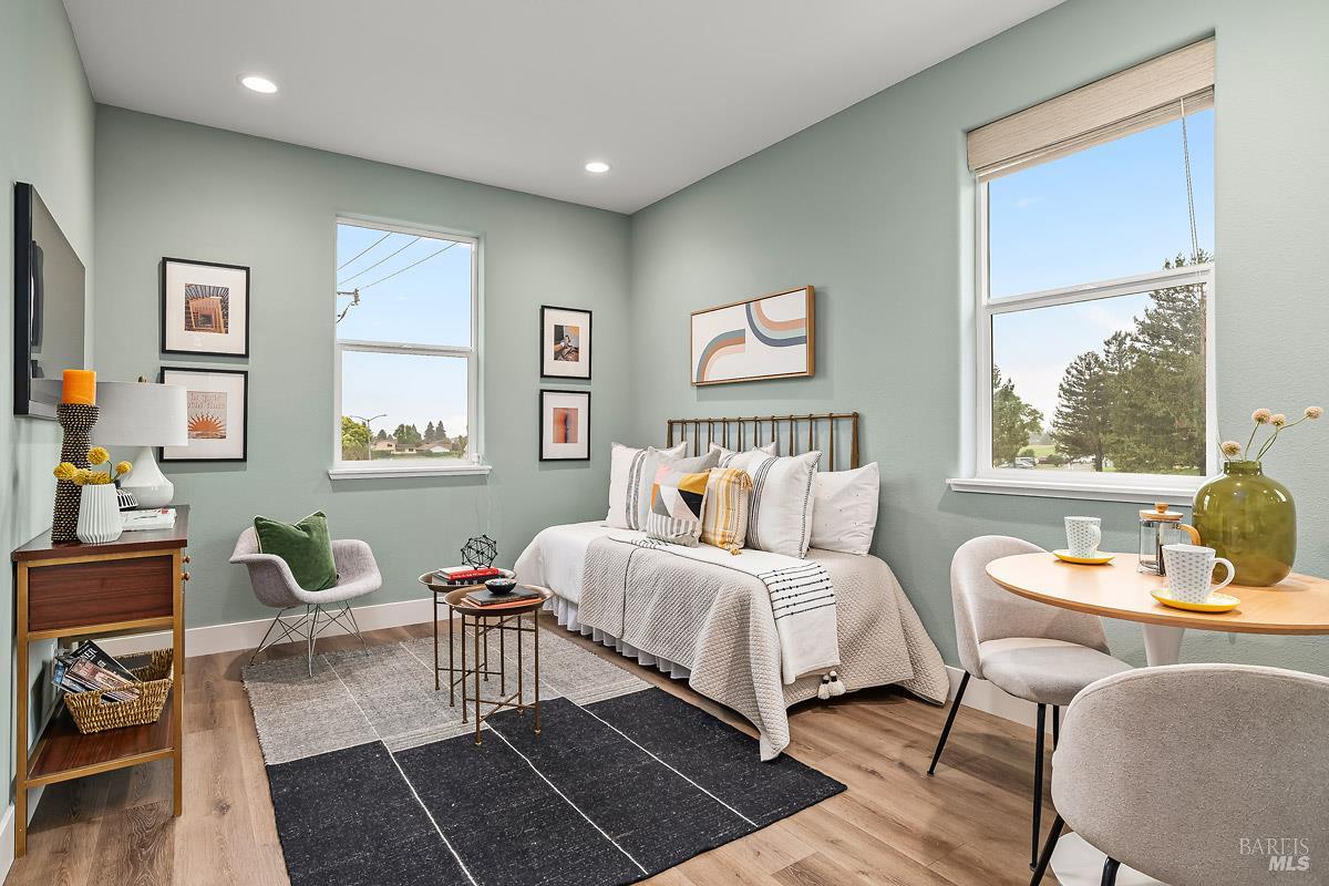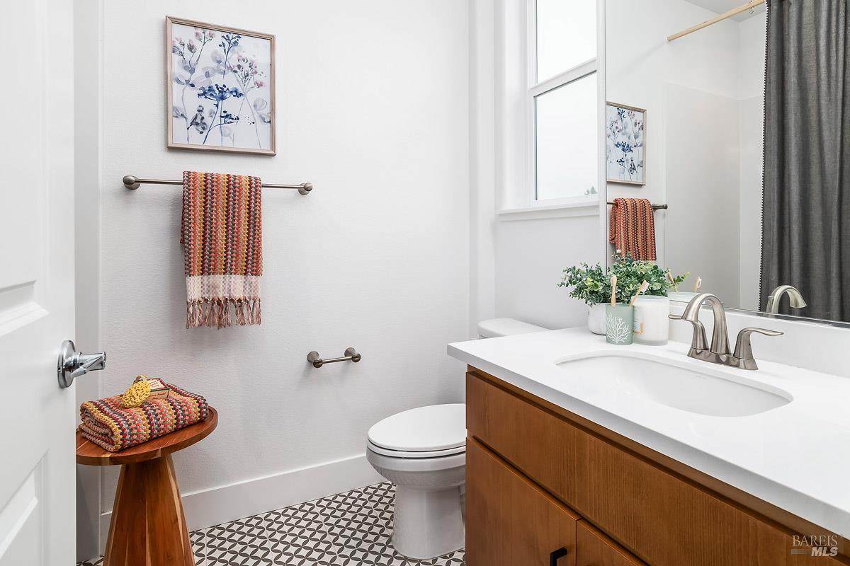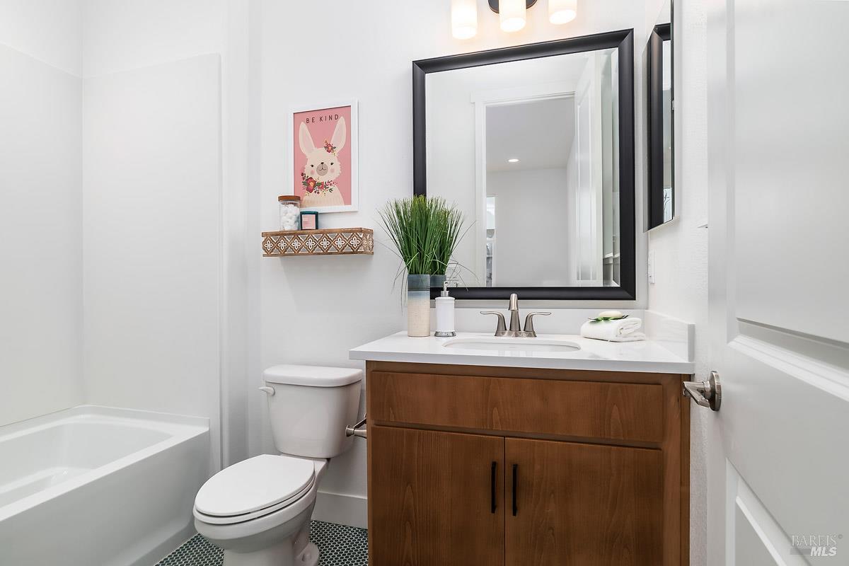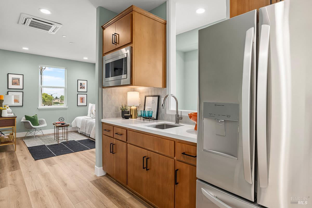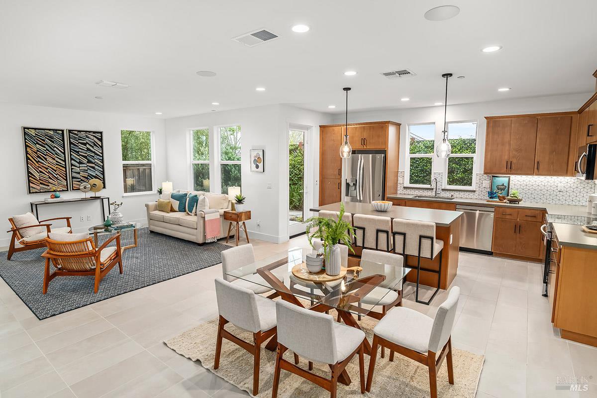 This beautifully upgraded, move-in-ready model home offers modern style, energy efficiency, and exceptional flexibility. Built in 2022 with 3 bedrooms and 3.5 baths, the standout feature is the 317 sq ft Jr. ADU ideal for extended family, a private office, or rental income. Designed with its own entrance, bathroom, and a sleek kitchenette with quartz counters, tile backsplash, refrigerator, microwave, and upgraded flooring, it can function as a separate apartment or seamlessly connect to the main home. The interior showcases French Walnut cabinetry, LG stainless appliances, washer and dryer, upgraded fixtures, pendant lighting, framed vanity mirrors, and premium flooring. The spacious primary suite includes a large walk-in closet and a spa-inspired bathroom with dual vanities, quartz counters, upgraded tile shower surround, quartz bench, and a brushed-nickel clear-glass enclosure. Smart home features include keyless entry, smart thermostats, a video doorbell, dual-zone A/C, an EV-ready 2-car garage, and an 11-panel 3.85 kWh solar system all included. Near shops, transportation and restaurants.