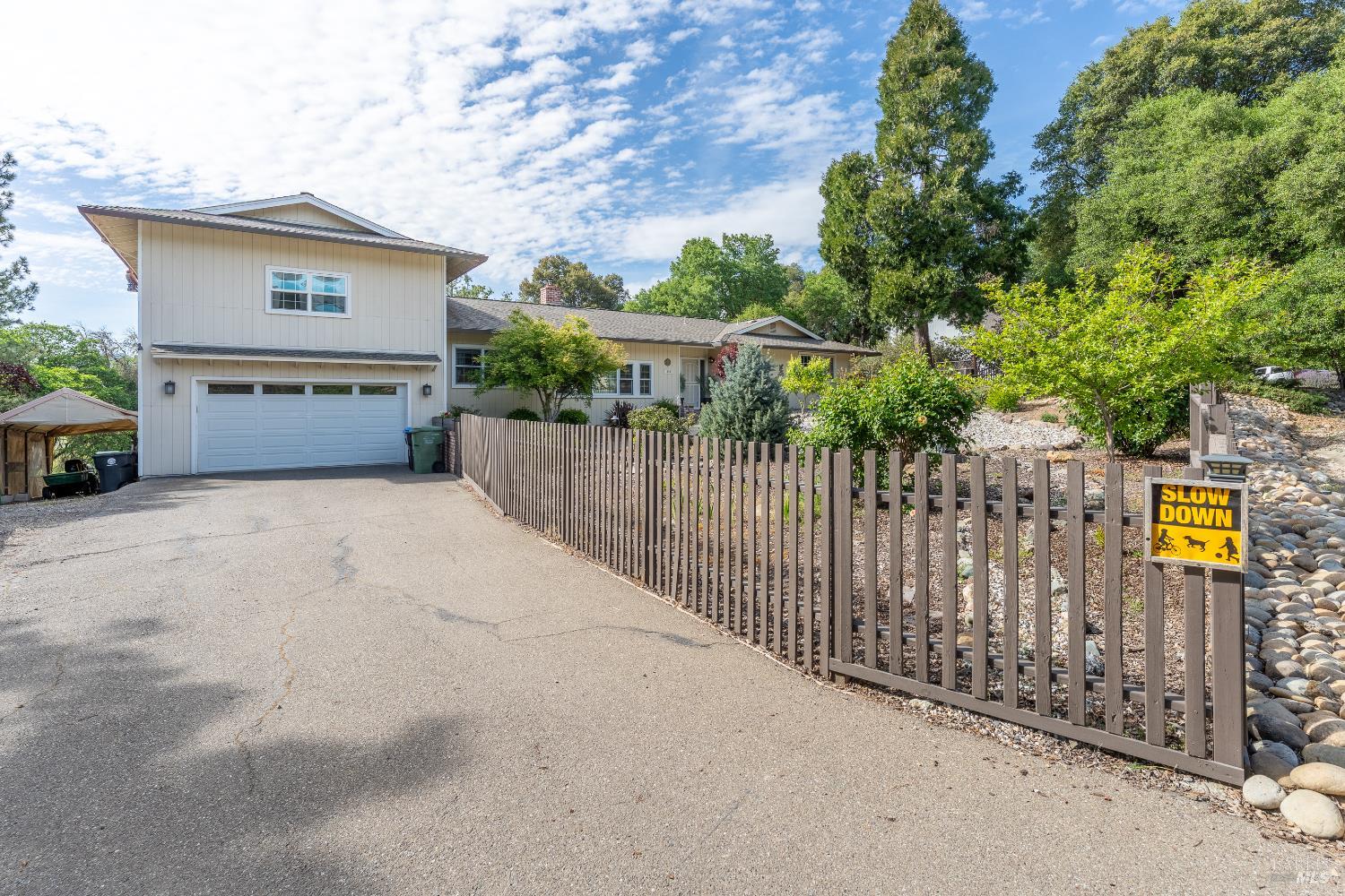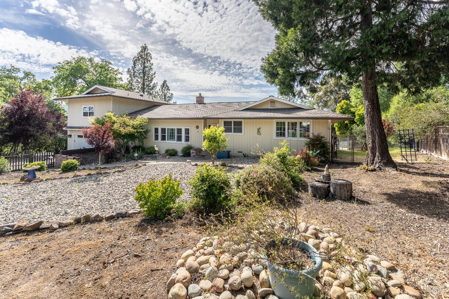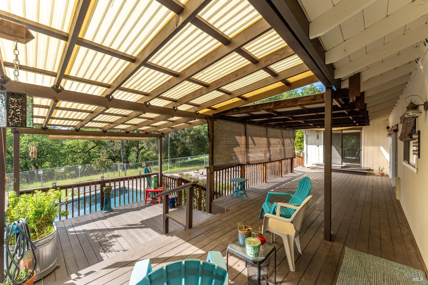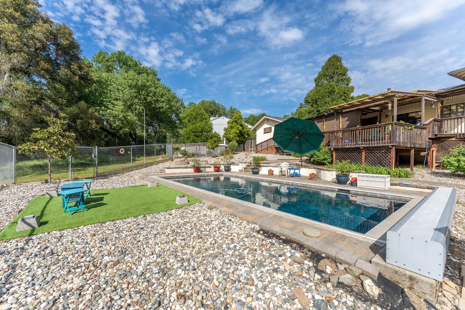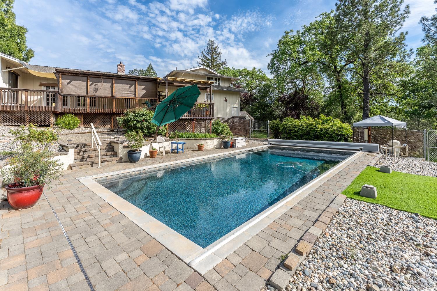 Elegant and spacious residence in El Dorado Estates, situated on a secluded 1.78-acre lot with expansive views of the Western Hills and valley lights. This 4-bedroom, 3-bathroom home offers approximately 2,500 sq. ft. of versatile living space, including a large second-story bedroom and a separate family room. The interior features a spacious kitchen and bathrooms with quartz countertops and tile flooring. The functional floor plan includes a formal dining room with solid oak floors, a sunken living room with cathedral ceilings, and a classic brick fireplace. French doors throughout the home lead to an extensive back deck, seamlessly connecting the indoor space to the private outdoor areas. The exterior is designed for entertaining and utility, featuring a saltwater pool, a workshop/shop area, and a two-car attached garage. Modern updates include a newer roof and HVAC system.