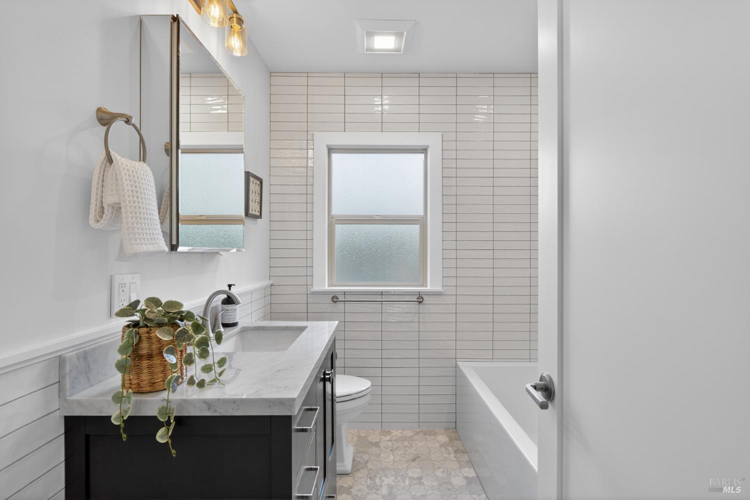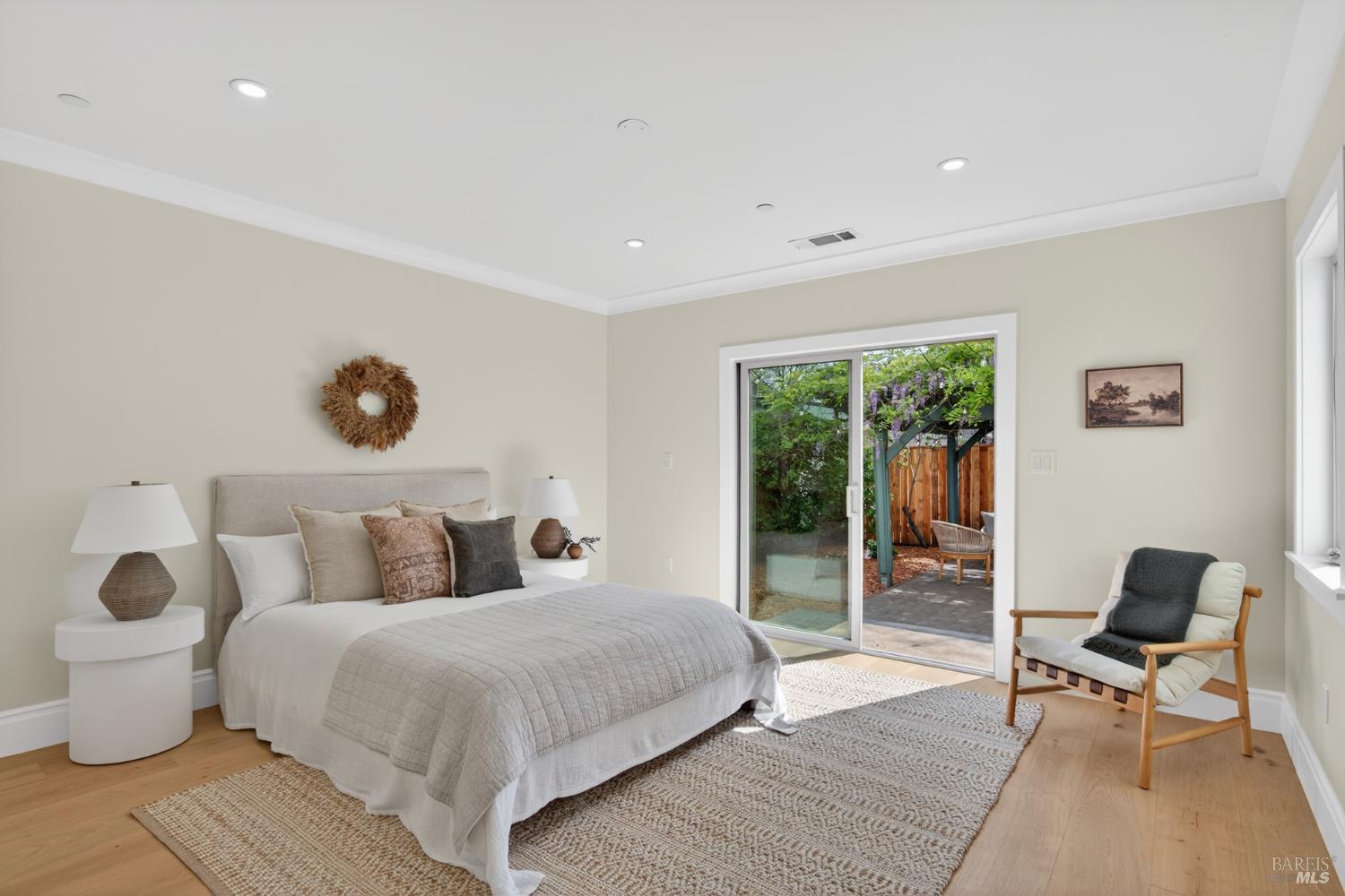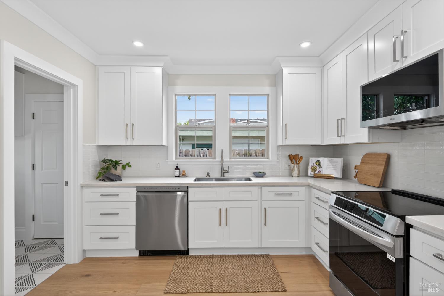 Located in the coveted alphabet streets neighborhood of Petaluma, in the heart of the Golden Triangle, this cute 1940's bungalow plus ADU is remodeled down to the studs. Brand new primary suite has been added to create 3 bedrooms and 2 full baths plus finished attic room for a total of 1630 square feet. Studio ADU with full kitchen and bath adds 353 sf. Seller opened up the main house kitchen to create a spacious great room. Upgrades include new plumbing, new electrical, new insulation, fire sprinkler, new roofing, new real wood flooring throughout, crown molding, wine cooler, spacious primary bath. Backyard with paver stone patio features a gracious trellis with wisteria. One block from McNear Park; two blocks from Wickersham Park. This house is a must see; it will not last long.