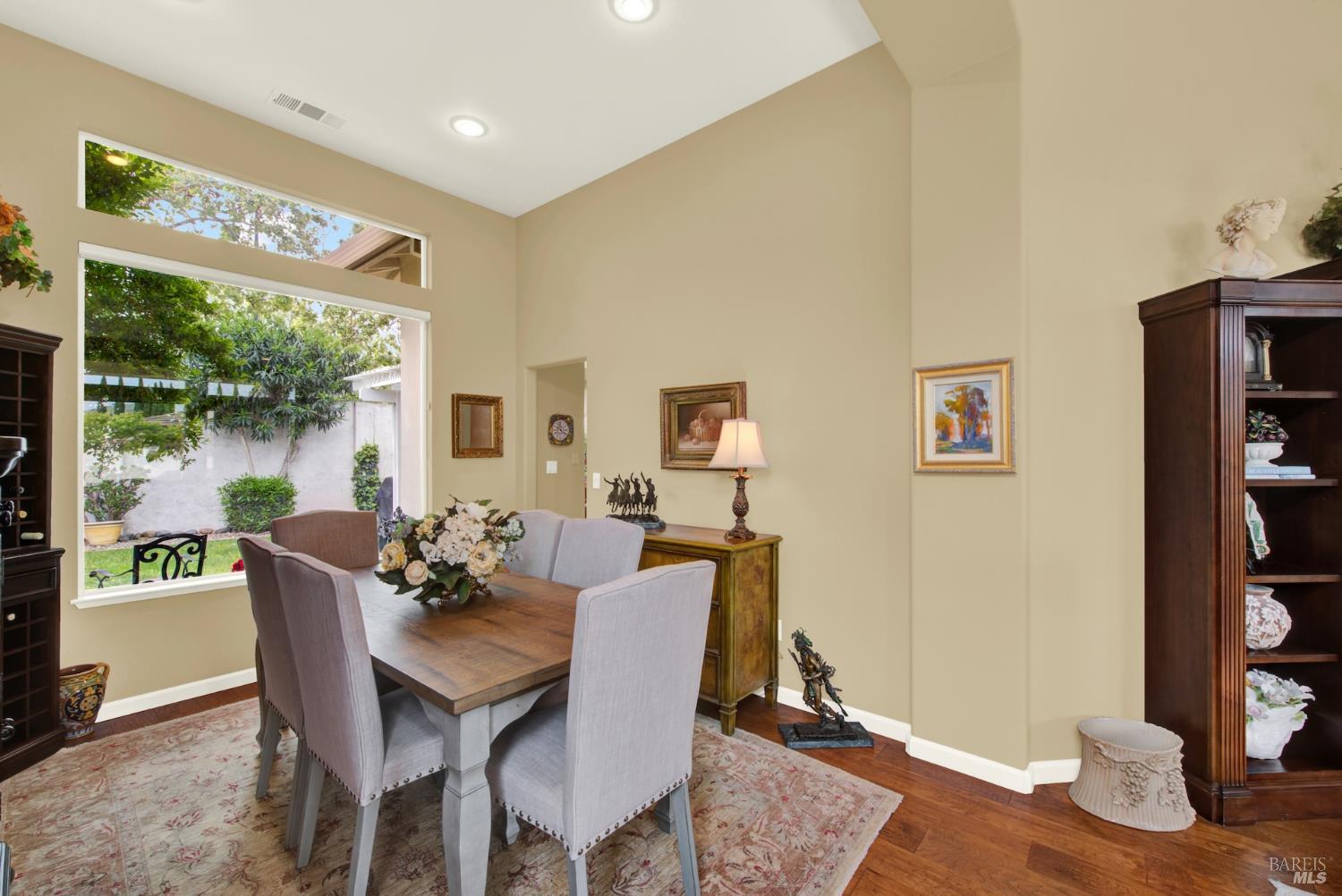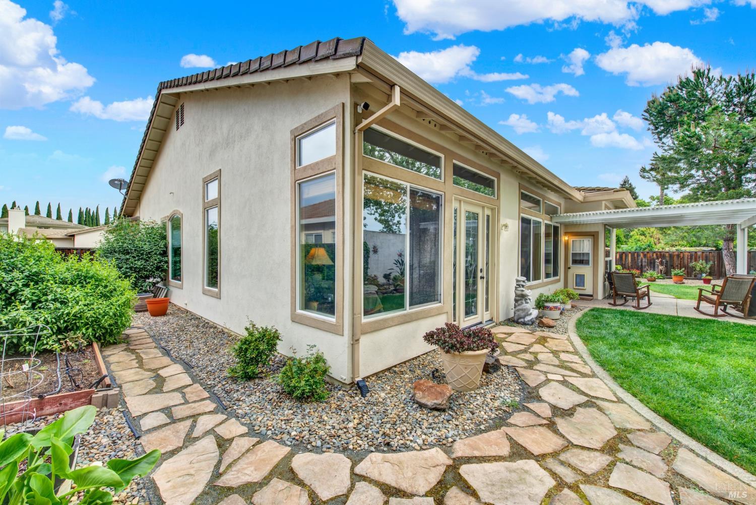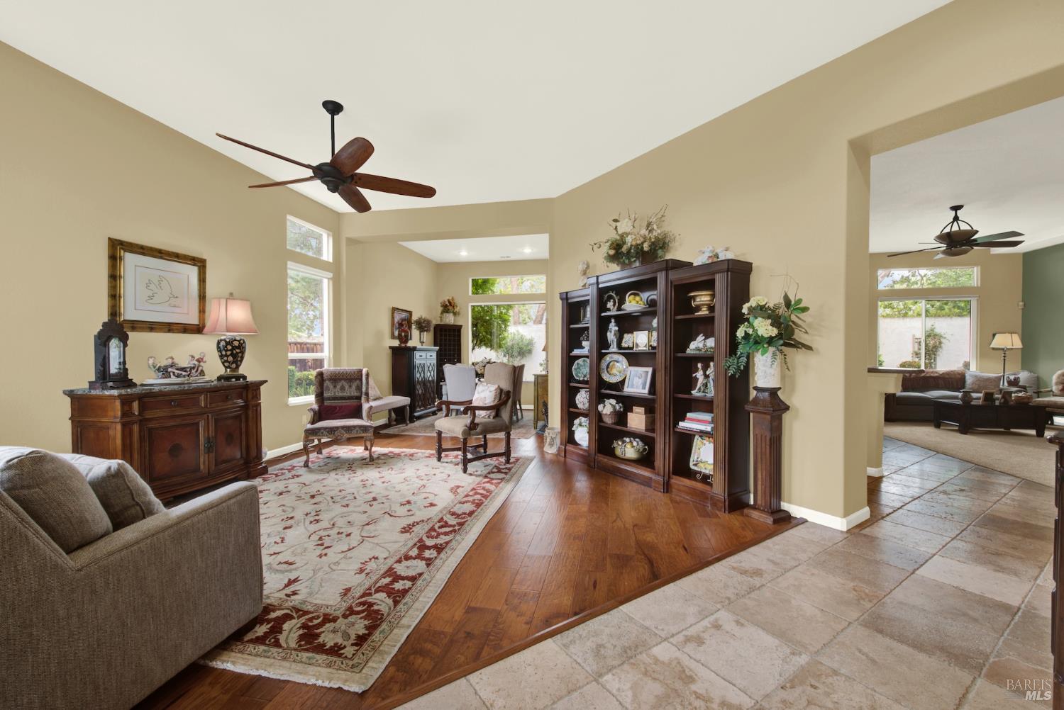 Welcome to this beautifully maintained single-story home in the desirable Paradise Valley community. From the moment you step inside, you're greeted by stunning wood flooring that flows through the family room, creating a warm and inviting atmosphere. Travertine tile guides you into the heart of the home, the kitchen, featuring modern cabinetry, a spacious island, and an open layout that seamlessly connects to a cozy breakfast nook overlooking the perfectly landscaped backyard. Just off the kitchen, the family room is filled with natural light from large windows and anchored by a charming fireplace, making it the perfect space to relax or entertain. The versatile fourth bedroom is currently set up as a home office but can easily serve as a guest room or additional bedroom to fit your needs. The primary suite offers a private retreat with glass doors that open directly to the backyard, blending indoor and outdoor living. The en suite bathroom feels like a spa, complete with a large walk in shower designed for comfort and relaxation. This move in ready home combines style, functionality, and comfort. Don't miss your opportunity to make it yours!
