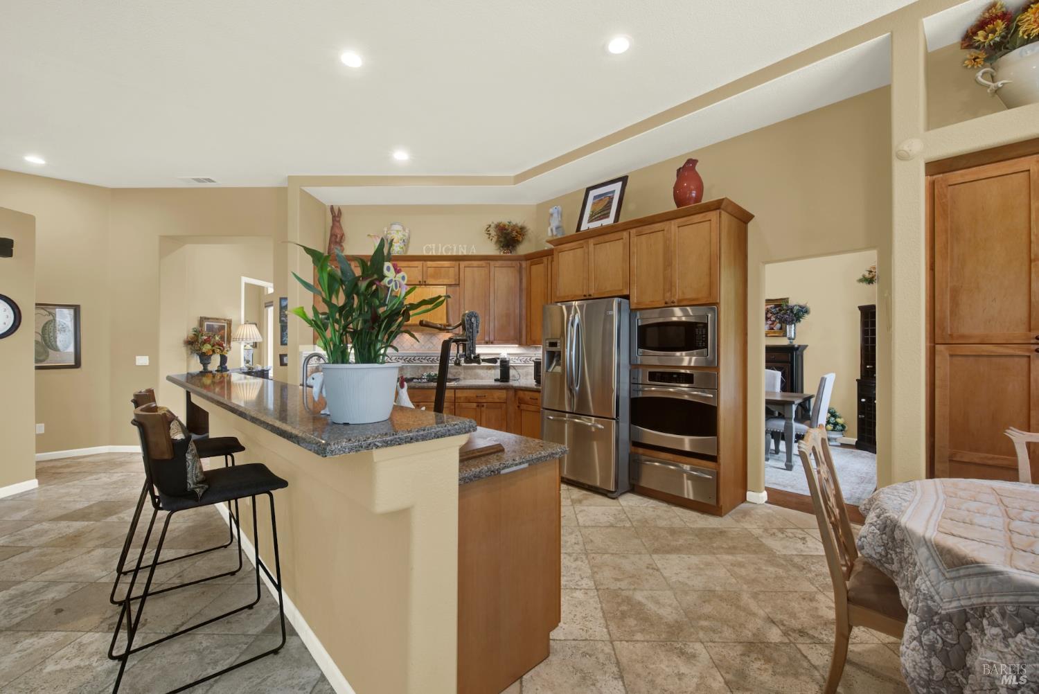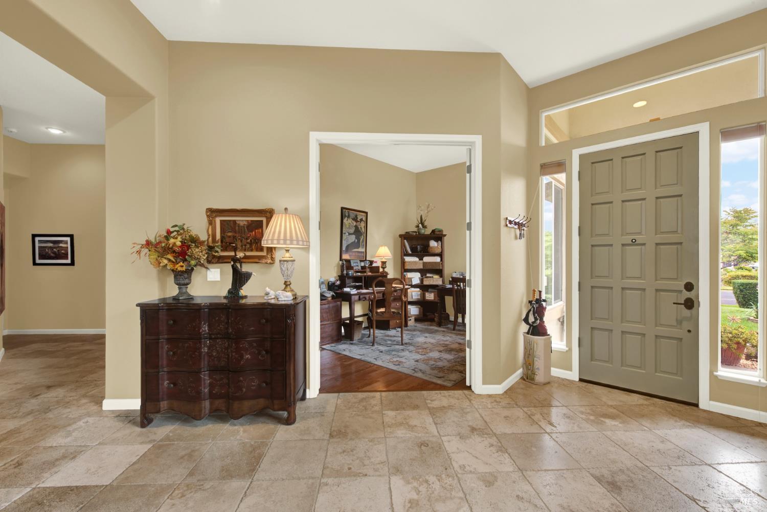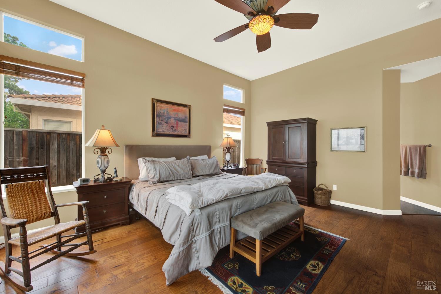Welcome to this beautifully maintained single-story home in the desirable Paradise Valley community. From the moment you step inside, you're greeted by stunning wood flooring that flows through the family room, creating a warm and inviting atmosphere. Travertine tile guides you into the heart of the home, the kitchen, featuring modern cabinetry, a spacious island, and an open layout that seamlessly connects to a cozy breakfast nook overlooking the perfectly landscaped backyard. Just off the kitchen, the family room is filled with natural light from large windows and anchored by a charming fireplace, making it the perfect space to relax or entertain. The versatile fourth bedroom is currently set up as a home office but can easily serve as a guest room or additional bedroom to fit your needs. The primary suite offers a private retreat with glass doors that open directly to the backyard, blending indoor and outdoor living. The en suite bathroom feels like a spa, complete with a large walk in shower designed for comfort and relaxation. This move in ready home combines style, functionality, and comfort. Don't miss your opportunity to make it yours!