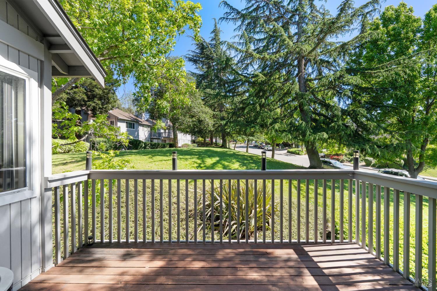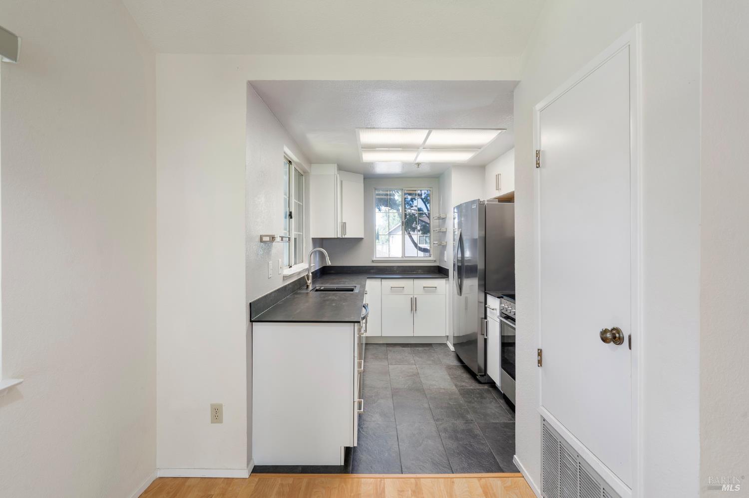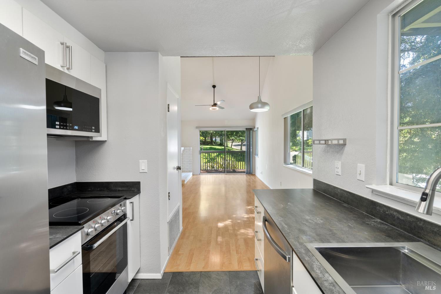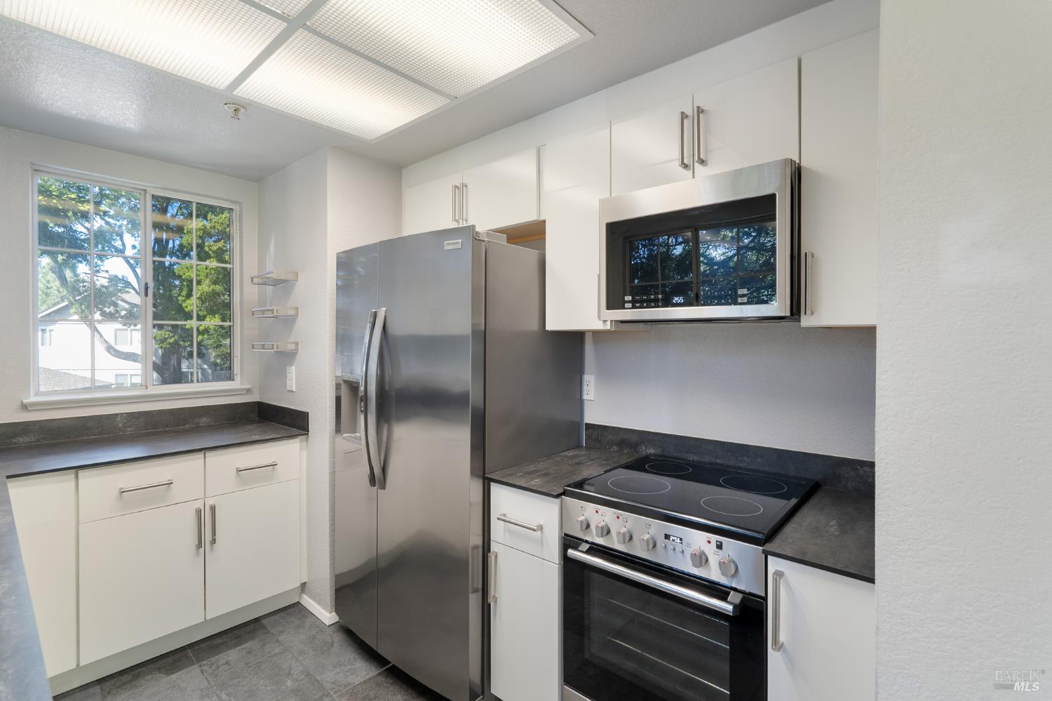 Step into this thoughtfully remodeled end-unit condo in desirable Benicia, ideally situated at the end of the street for added privacy. Sunlight fills the home, reflecting beautifully off the light, laminate flooring as you enter the spacious living room, highlighted by a white brick fireplace and high ceilings complemented with dark wood beams. The kitchen is compact yet highly functional, featuring stainless steel appliances, newer white gloss cabinetry, and Dekton tile surfaces. Enjoy modern touches like a touchless kitchen faucet and smart storage solutions, including double lazy Susans in the corner cabinet to maximize space. Just off the living room, step onto the private balcony overlooking a peaceful greenbelt perfect for relaxing or enjoying your morning coffee. Down the hallway, you'll find the bedrooms and bathrooms. Closets are equipped with built-in storage systems for easy organization and maximum efficiency. A convenient hallway laundry closet includes a stackable washer and dryer. Additional highlights include central heating and air conditioning controlled by an Ecobee smart thermostat. Don't miss the the detached garage which offers extra storage cabinets and two parking spaces. Enjoy neighboring Bridgeview Park and the Southampton Shopping center just five minutes away. With thoughtful upgrades, private setting, and convenient location this unit is is an opportunity not to be missed.