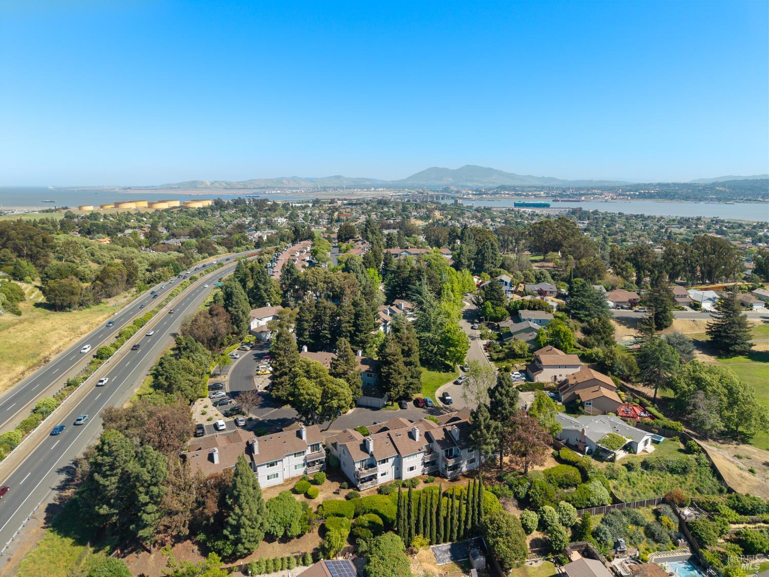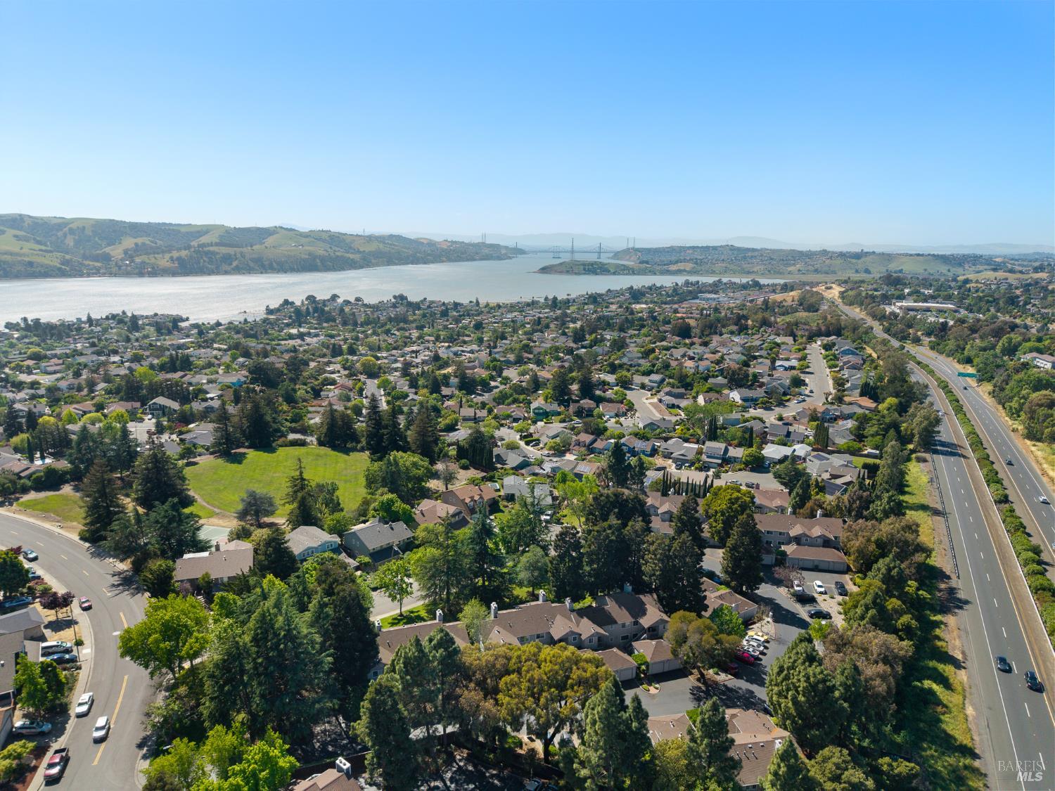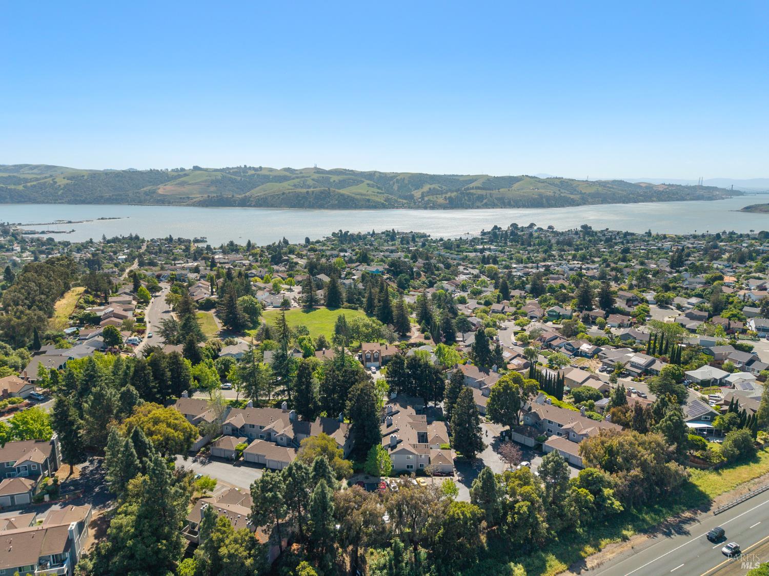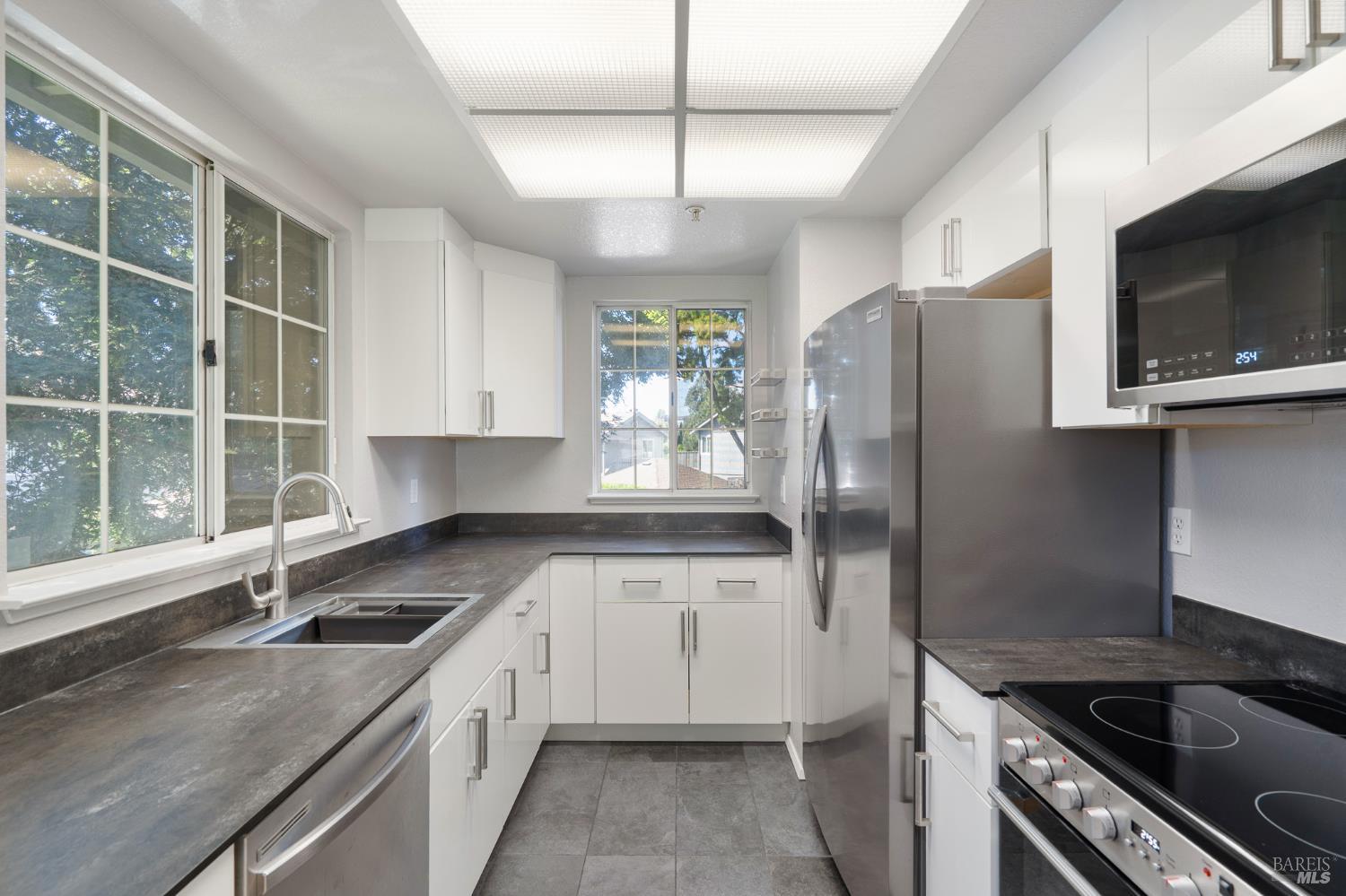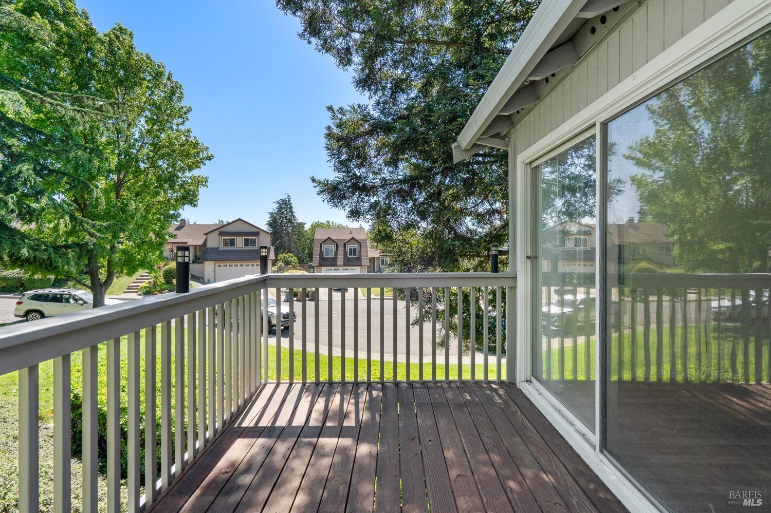 Step into this thoughtfully remodeled end-unit condo in desirable Benicia, ideally situated at the end of the street for added privacy. Sunlight fills the home, reflecting beautifully off the light, laminate flooring as you enter the spacious living room, highlighted by a white brick fireplace and high ceilings complemented with dark wood beams. The kitchen is compact yet highly functional, featuring stainless steel appliances, newer white gloss cabinetry, and Dekton tile surfaces. Enjoy modern touches like a touchless kitchen faucet and smart storage solutions, including double lazy Susans in the corner cabinet to maximize space. Just off the living room, step onto the private balcony overlooking a peaceful greenbelt perfect for relaxing or enjoying your morning coffee. Down the hallway, you'll find the bedrooms and bathrooms. Closets are equipped with built-in storage systems for easy organization and maximum efficiency. A convenient hallway laundry closet includes a stackable washer and dryer. Additional highlights include central heating and air conditioning controlled by an Ecobee smart thermostat. Don't miss the the detached garage which offers extra storage cabinets and two parking spaces. Enjoy neighboring Bridgeview Park and the Southampton Shopping center just five minutes away. With thoughtful upgrades, private setting, and convenient location this unit is is an opportunity not to be missed.