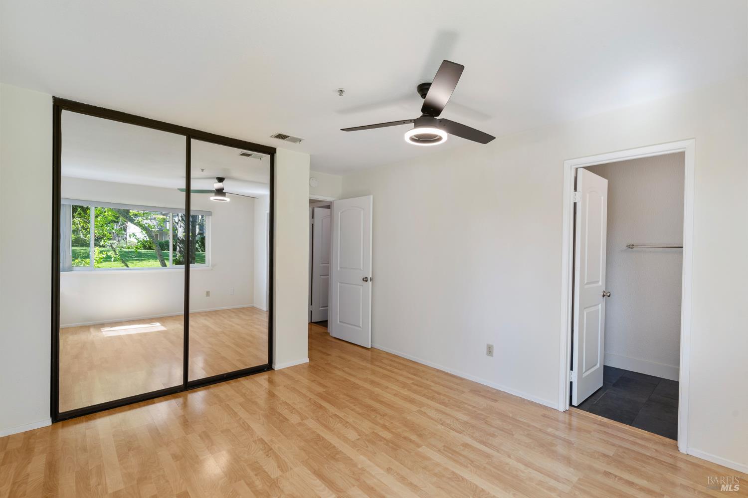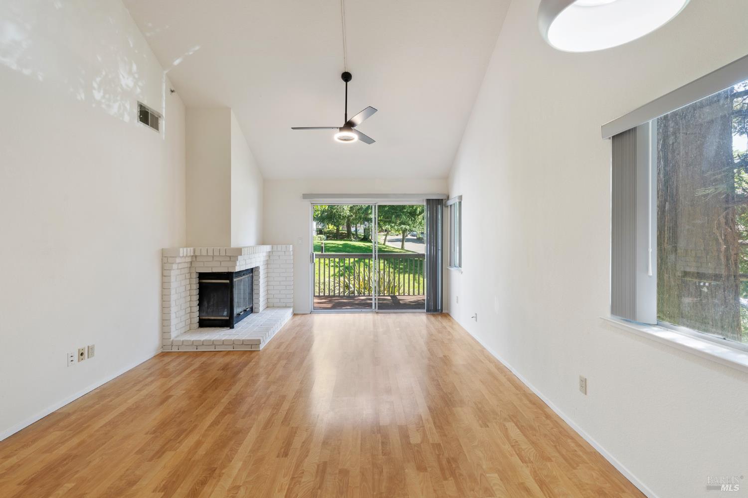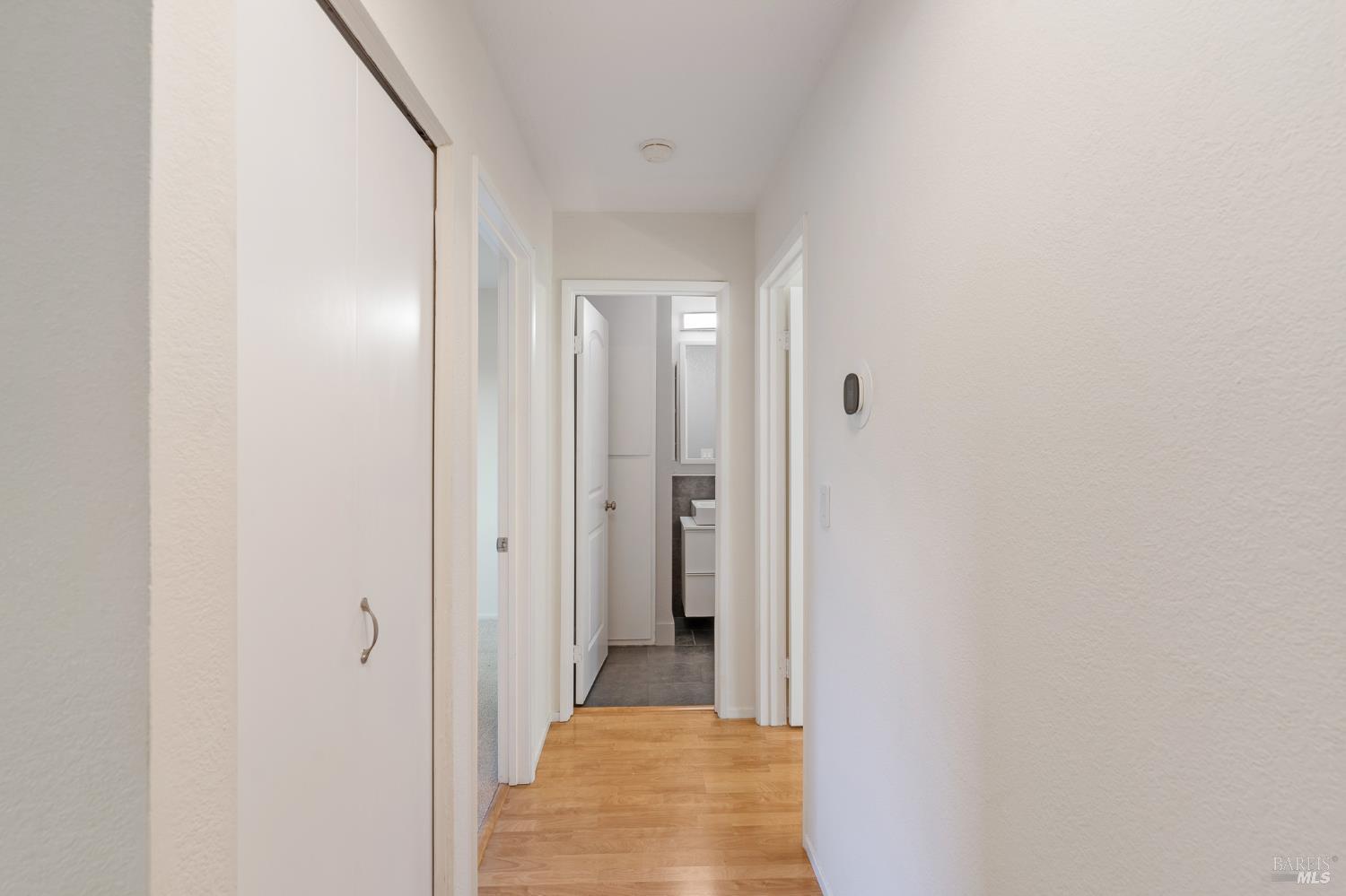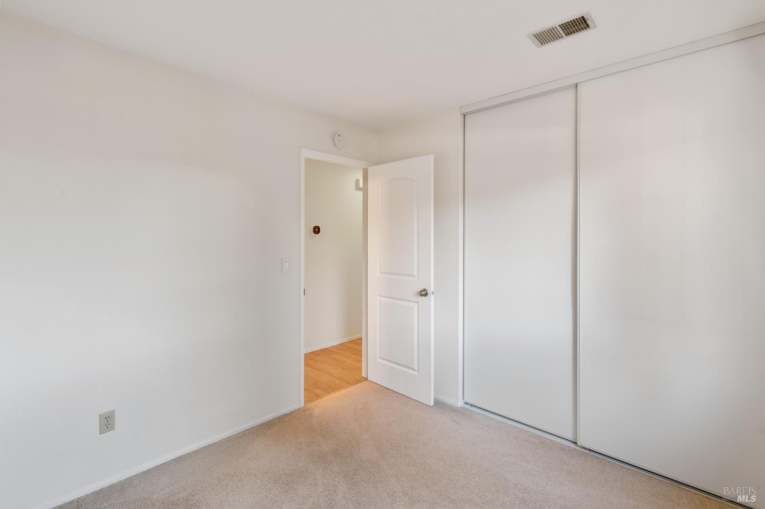 Step into this thoughtfully remodeled end-unit condo in desirable Benicia, ideally situated at the end of the street for added privacy. Sunlight fills the home, reflecting beautifully off the light, laminate flooring as you enter the spacious living room, highlighted by a white brick fireplace and high ceilings complemented with dark wood beams. The kitchen is compact yet highly functional, featuring stainless steel appliances, newer white gloss cabinetry, and Dekton tile surfaces. Enjoy modern touches like a touchless kitchen faucet and smart storage solutions, including double lazy Susans in the corner cabinet to maximize space. Just off the living room, step onto the private balcony overlooking a peaceful greenbelt perfect for relaxing or enjoying your morning coffee. Down the hallway, you'll find the bedrooms and bathrooms. Closets are equipped with built-in storage systems for easy organization and maximum efficiency. A convenient hallway laundry closet includes a stackable washer and dryer. Additional highlights include central heating and air conditioning controlled by an Ecobee smart thermostat. Don't miss the the detached garage which offers extra storage cabinets and two parking spaces. Enjoy neighboring Bridgeview Park and the Southampton Shopping center just five minutes away. With thoughtful upgrades, private setting, and convenient location this unit is is an opportunity not to be missed.
