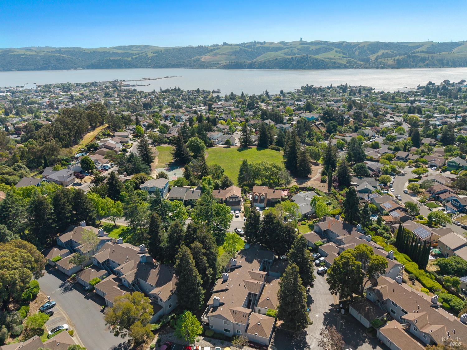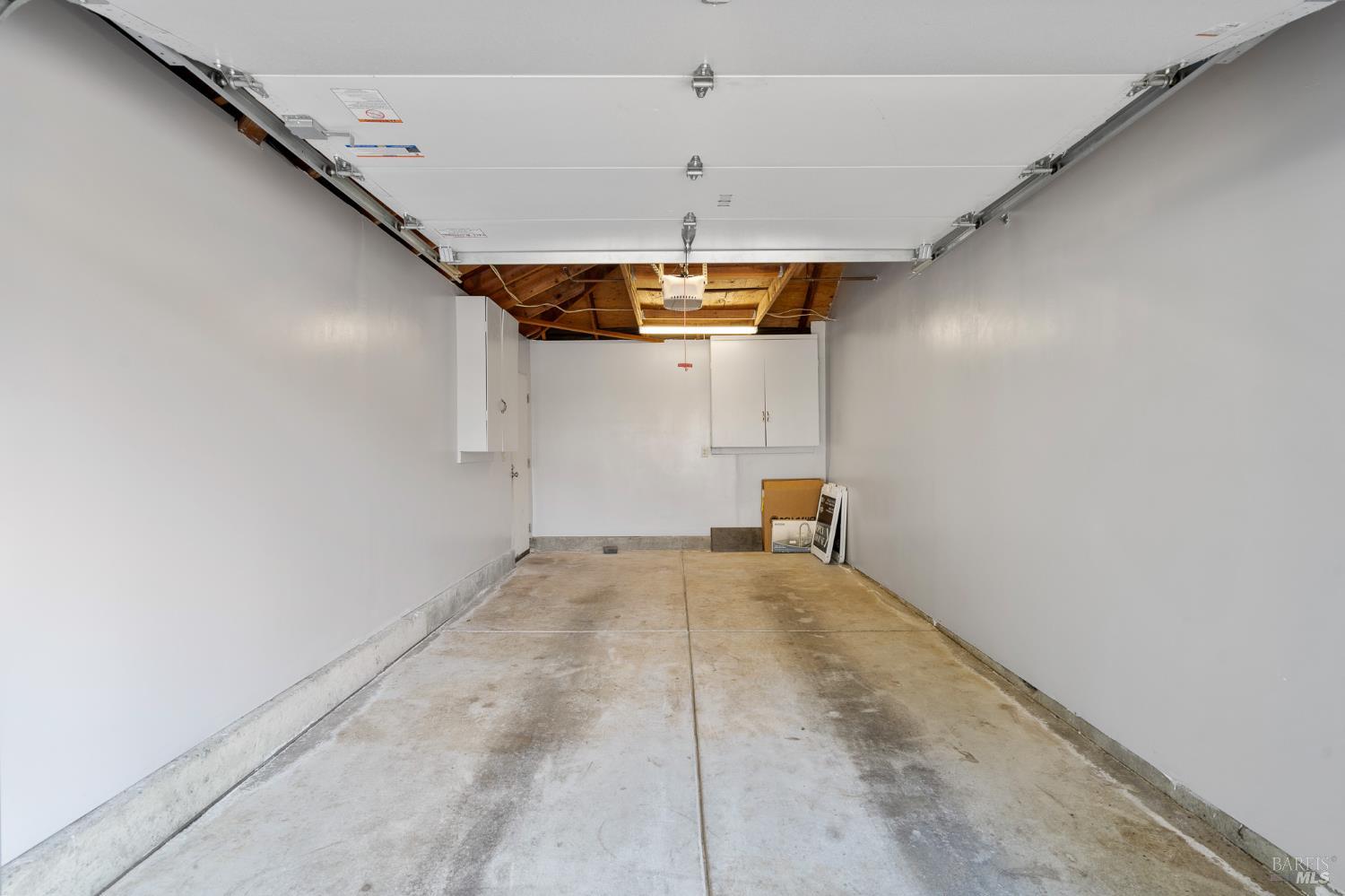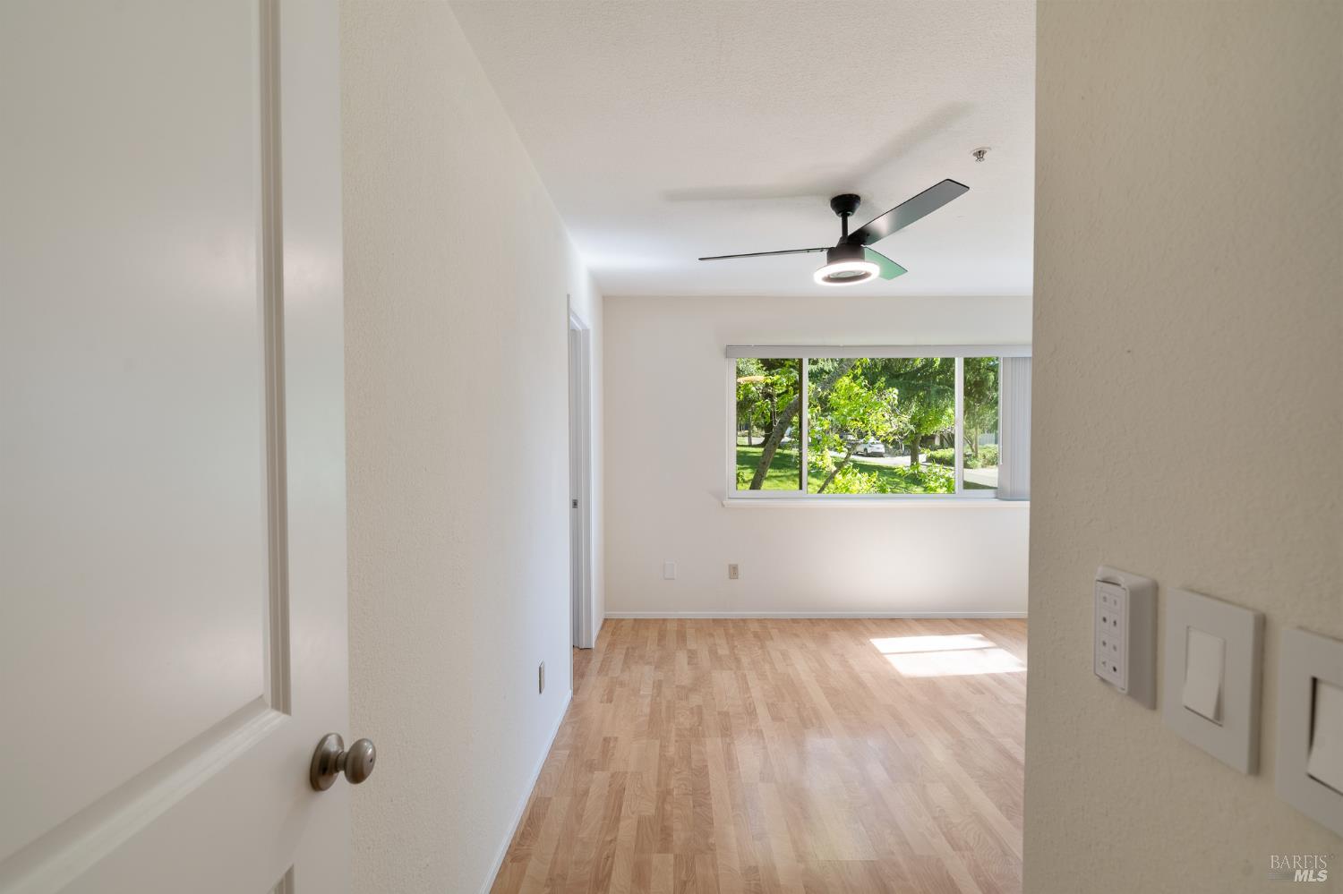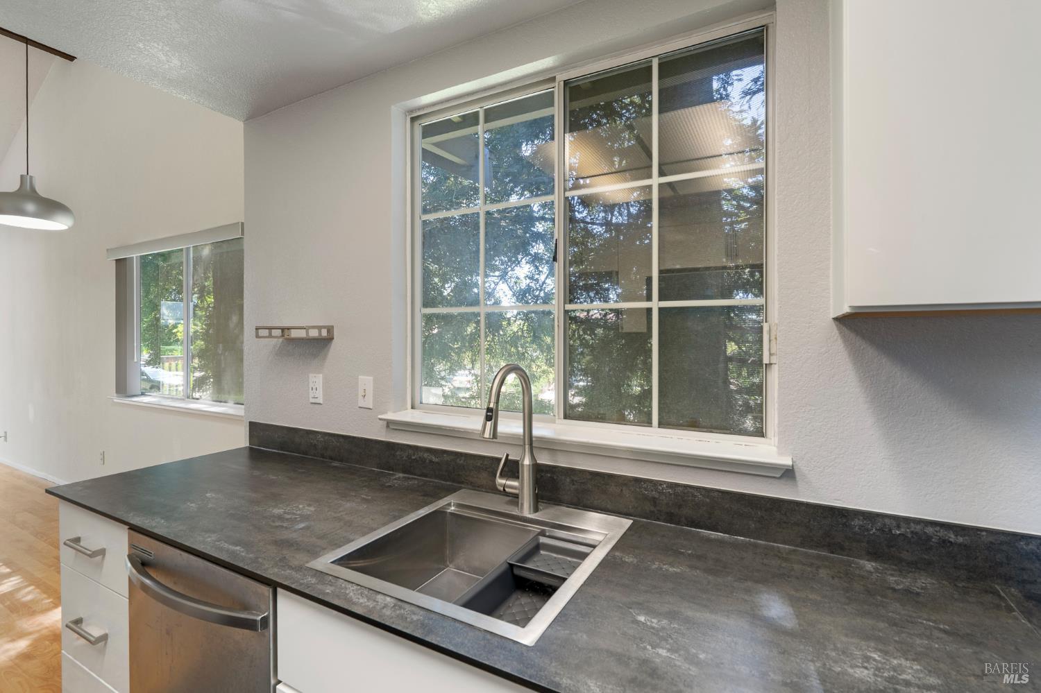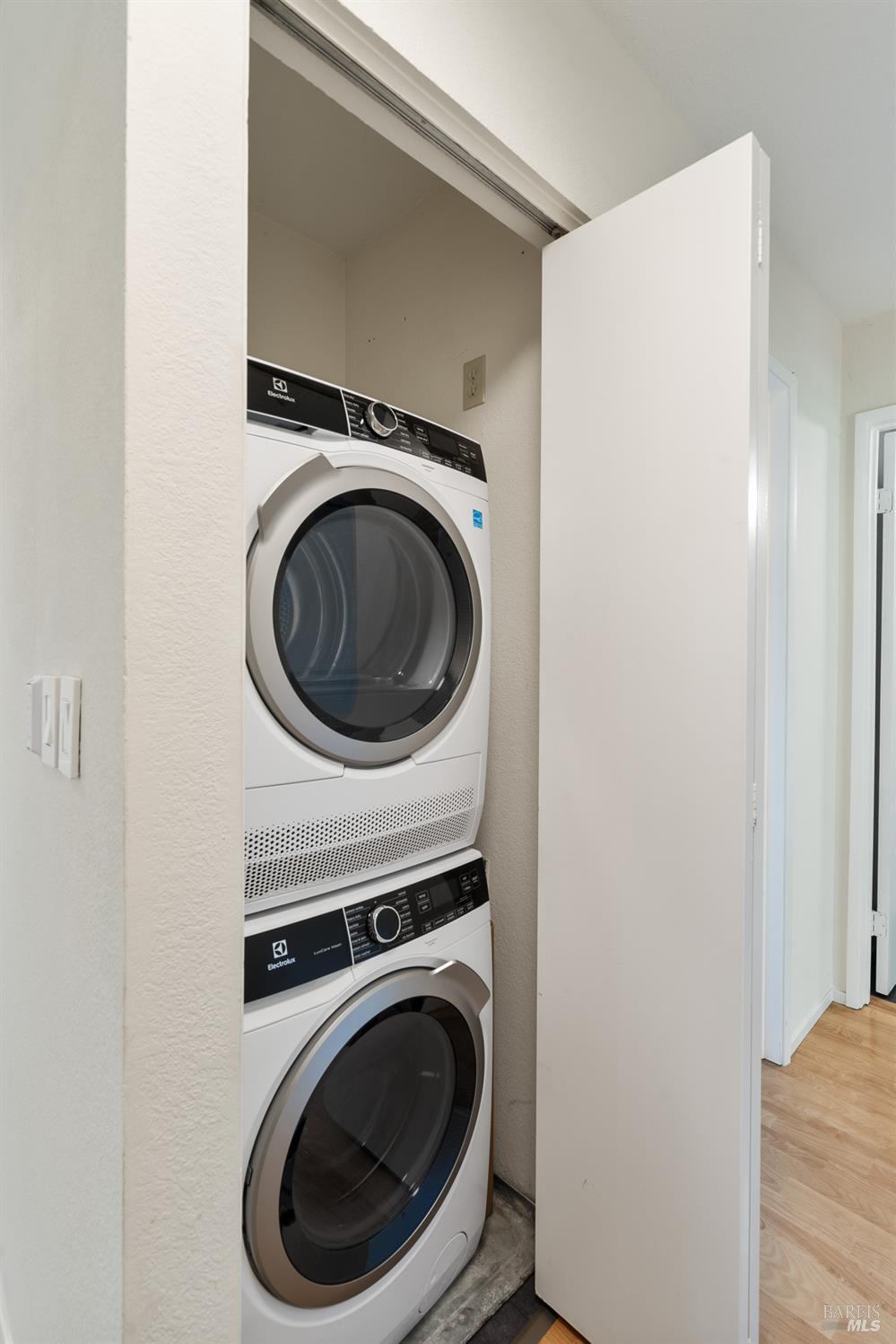 Step into this thoughtfully remodeled end-unit condo in desirable Benicia, ideally situated at the end of the street for added privacy. Sunlight fills the home, reflecting beautifully off the light, laminate flooring as you enter the spacious living room, highlighted by a white brick fireplace and high ceilings complemented with dark wood beams. The kitchen is compact yet highly functional, featuring stainless steel appliances, newer white gloss cabinetry, and Dekton tile surfaces. Enjoy modern touches like a touchless kitchen faucet and smart storage solutions, including double lazy Susans in the corner cabinet to maximize space. Just off the living room, step onto the private balcony overlooking a peaceful greenbelt perfect for relaxing or enjoying your morning coffee. Down the hallway, you'll find the bedrooms and bathrooms. Closets are equipped with built-in storage systems for easy organization and maximum efficiency. A convenient hallway laundry closet includes a stackable washer and dryer. Additional highlights include central heating and air conditioning controlled by an Ecobee smart thermostat. Don't miss the the detached garage which offers extra storage cabinets and two parking spaces. Enjoy neighboring Bridgeview Park and the Southampton Shopping center just five minutes away. With thoughtful upgrades, private setting, and convenient location this unit is is an opportunity not to be missed.