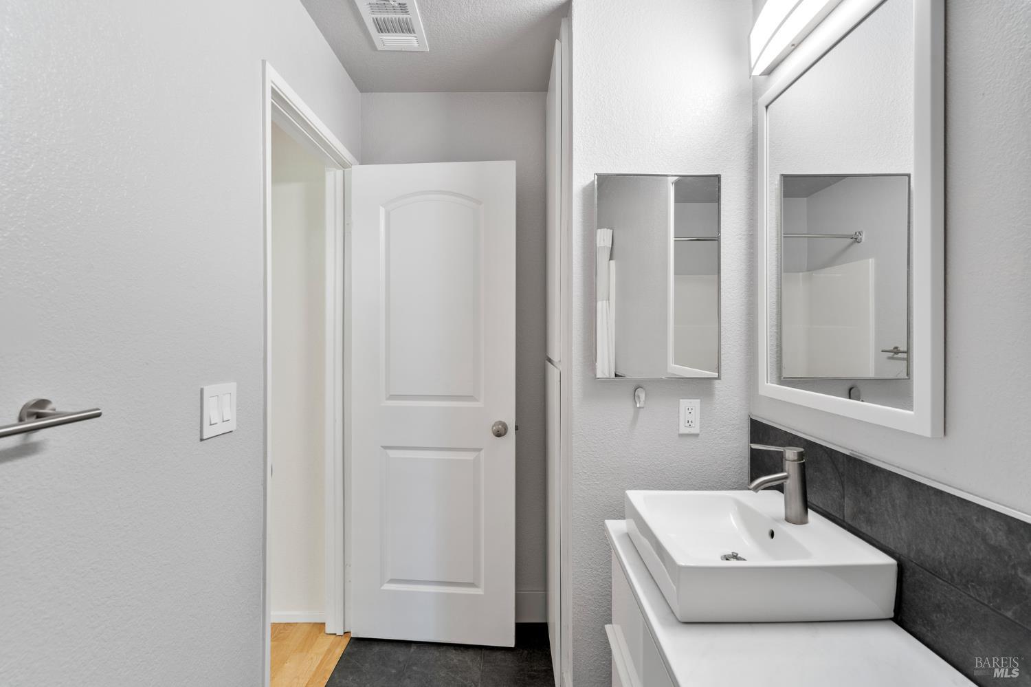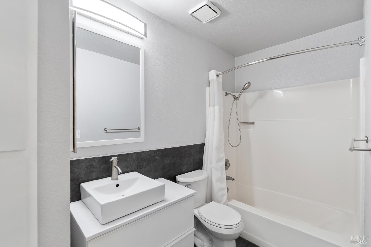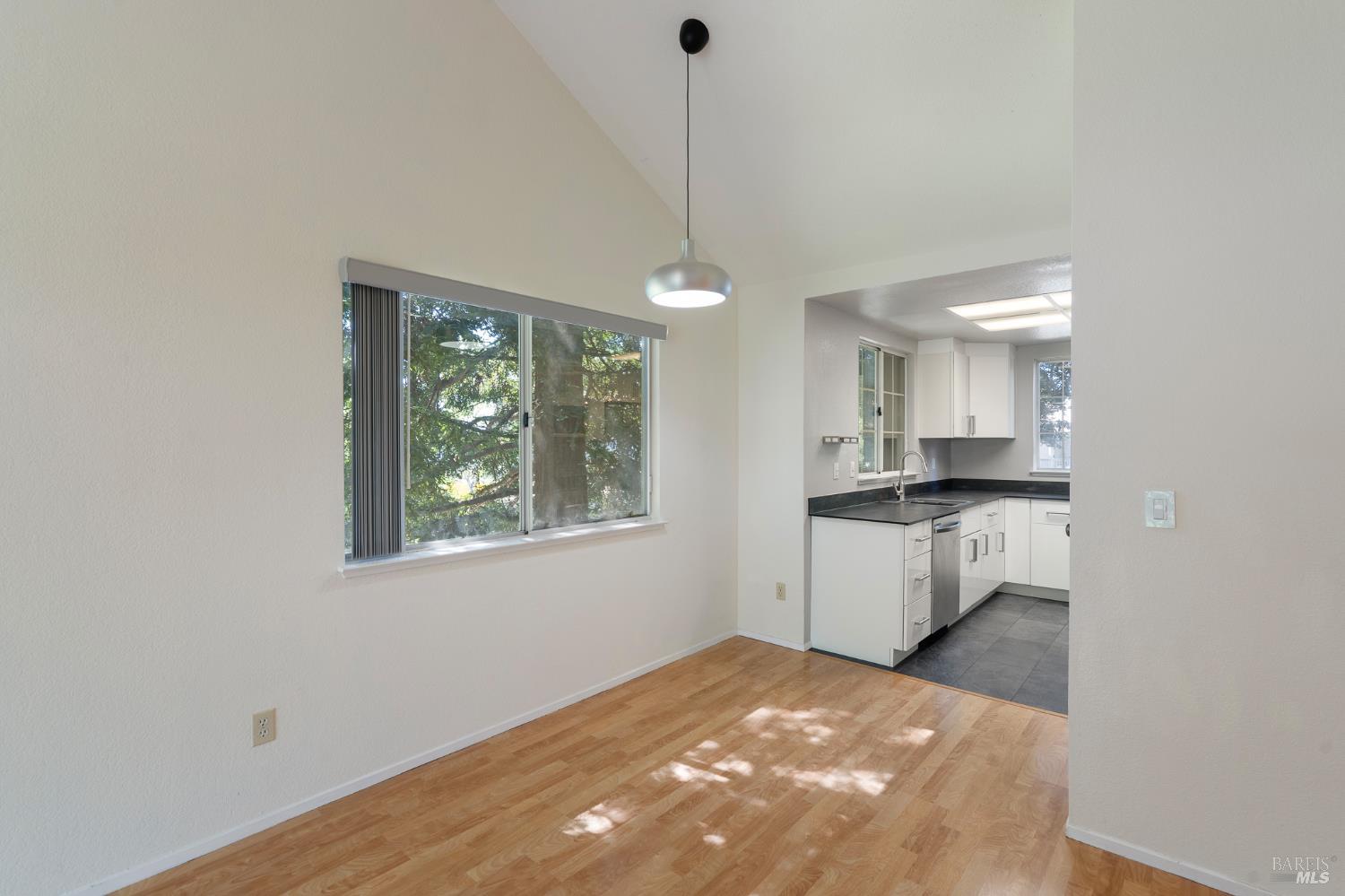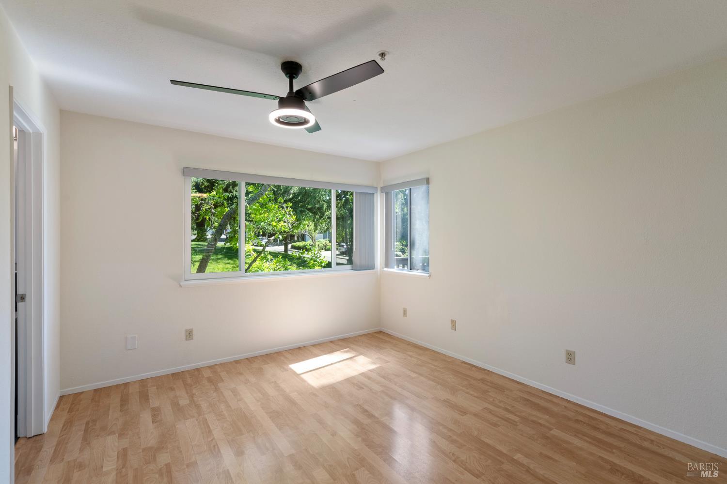 Step into this thoughtfully remodeled end-unit condo in desirable Benicia, ideally situated at the end of the street for added privacy. Sunlight fills the home, reflecting beautifully off the light, laminate flooring as you enter the spacious living room, highlighted by a white brick fireplace and high ceilings complemented with dark wood beams. The kitchen is compact yet highly functional, featuring stainless steel appliances, newer white gloss cabinetry, and Dekton tile surfaces. Enjoy modern touches like a touchless kitchen faucet and smart storage solutions, including double lazy Susans in the corner cabinet to maximize space. Just off the living room, step onto the private balcony overlooking a peaceful greenbelt perfect for relaxing or enjoying your morning coffee. Down the hallway, you'll find the bedrooms and bathrooms. Closets are equipped with built-in storage systems for easy organization and maximum efficiency. A convenient hallway laundry closet includes a stackable washer and dryer. Additional highlights include central heating and air conditioning controlled by an Ecobee smart thermostat. Don't miss the the detached garage which offers extra storage cabinets and two parking spaces. Enjoy neighboring Bridgeview Park and the Southampton Shopping center just five minutes away. With thoughtful upgrades, private setting, and convenient location this unit is is an opportunity not to be missed.