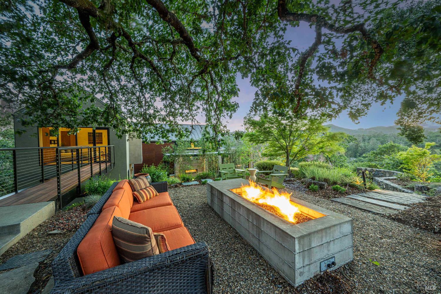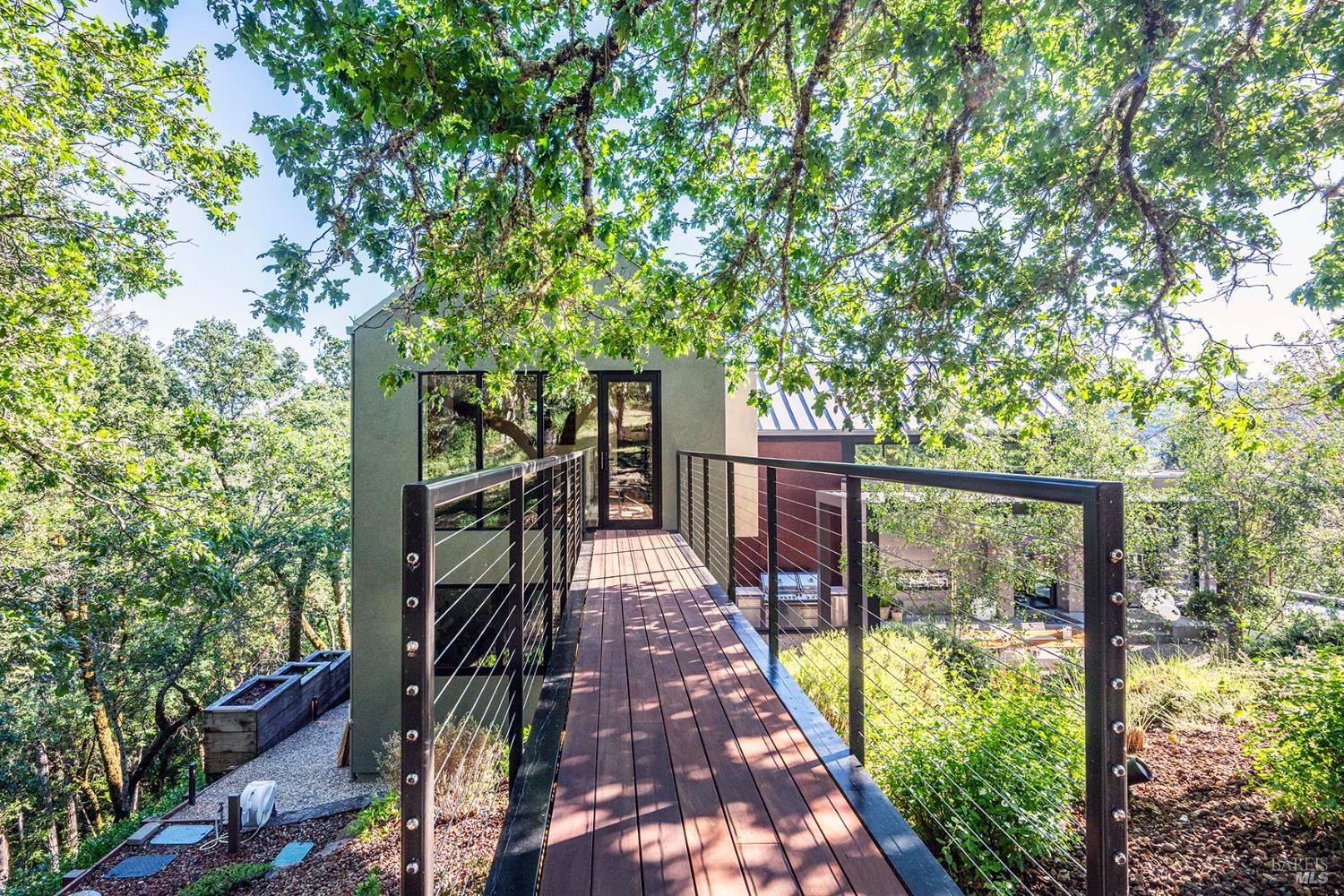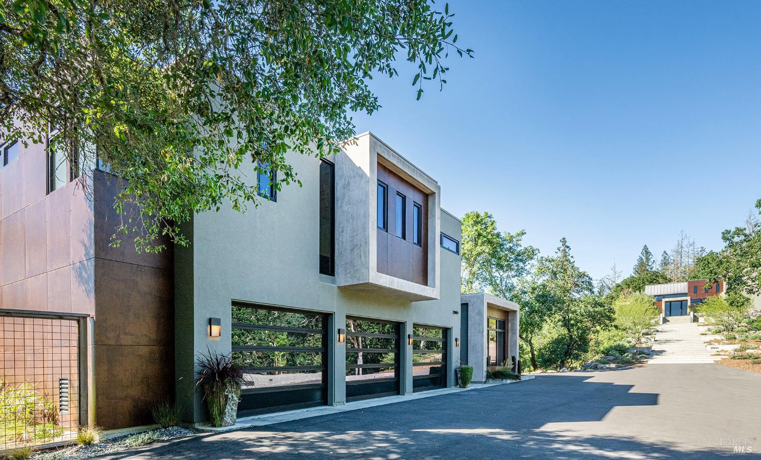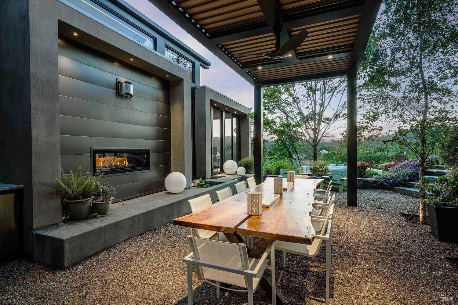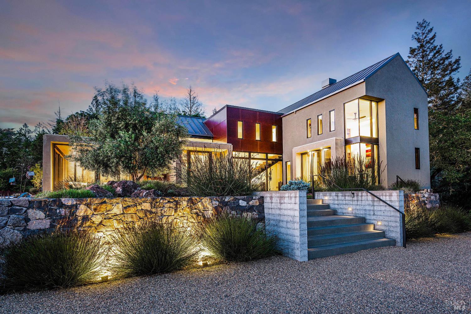 Thoughtfully designed & extensively reimagined, this striking contemporary home blends architectural precision w/warm modern materials & refined livability. A tiered approach creates a dramatic sense of reveal of the residence, framed by curated landscaping and soft, integrated lighting. An earthen-hued stucco facade pairs with natural wood panels and expansive glass, forming a timeless interplay of geometry, scale, and light. A sun-filled great room with 14' ceilings anchors the home, centered around a striking see-through fireplace set against a book-matched granite wall. Expansive folding doors create seamless indoor-outdoor flow, while a sculptural floating staircase with thick wood treads and glass railings serves as a functional work of art. Custom interiors feature quarter-sawn white oak floors and curated walnut casework. Integrated technology includes Control4 automation, Lutron lighting, electric shades, and Sonos sound throughout. The kitchen delivers serious performance; outfitted with Miele appliances, including induction cooktop, multiple ovens, and coffee system, along with Thermador refrigeration, Leicht cabinetry, and quartz surfaces, all complemented by a generous pantry and workspace. A den and media room with 20' ceilings and wood-burning fireplace adds versatility, while the private primary suite displays exposed ceiling trusses, with integrated LED uplighting, custom walnut built-ins, and a tailored closet system. Outdoor living unfolds across a heated three-season screened porch, resort-style lap pool and Caldera spa, and an enclosed dining terrace with built-in grill, pizza oven, and pergola. Fire pit, fountain, and curated landscaping create an immersive setting for relaxation and entertainment. A companion structure, beautifully finished to the same standard as the main residence, offers a 2BR/2BA ADU with private deck and views. The lower level includes a private office, gym with full bath & laundry, and a 3-car garage with storage. Completing the property is a modern agricultural barn with workshop, loft, additional home office and rainwater collection, set among an olive orchard producing estate oil, fruit and citrus groves, raised garden beds, greenhouse, & walking trails. With PV solar, backup generator, private wells and entire property automation, the estate performs equally as a full-time or a lock-and-leave retreat. Ultimate in wine country living...elevated, intentional, and deeply connected to the land.