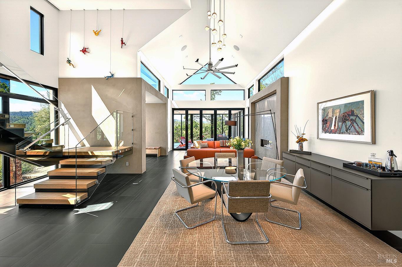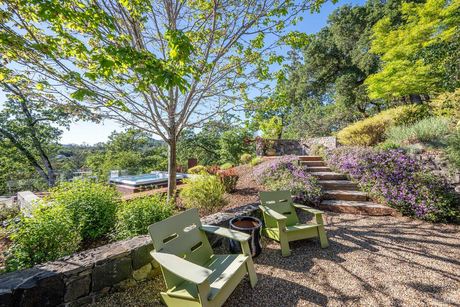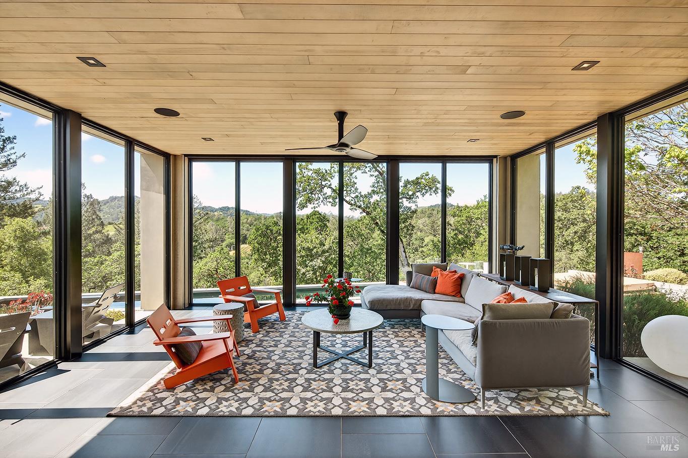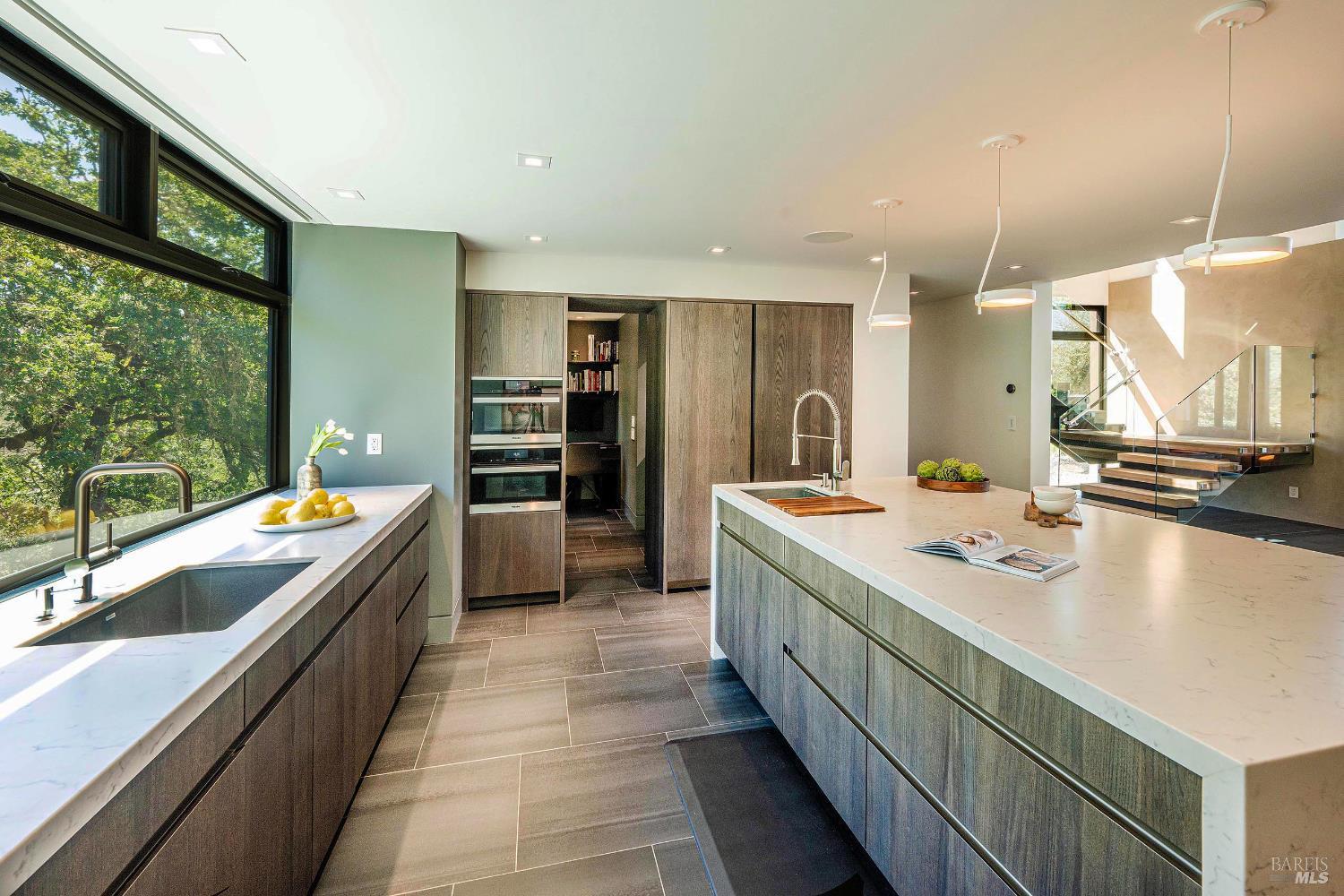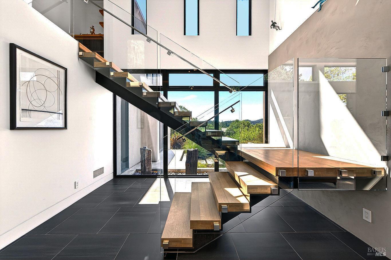 Thoughtfully designed & extensively reimagined, this striking contemporary home blends architectural precision w/warm modern materials & refined livability. A tiered approach creates a dramatic sense of reveal of the residence, framed by curated landscaping and soft, integrated lighting. An earthen-hued stucco facade pairs with natural wood panels and expansive glass, forming a timeless interplay of geometry, scale, and light. A sun-filled great room with 14' ceilings anchors the home, centered around a striking see-through fireplace set against a book-matched granite wall. Expansive folding doors create seamless indoor-outdoor flow, while a sculptural floating staircase with thick wood treads and glass railings serves as a functional work of art. Custom interiors feature quarter-sawn white oak floors and curated walnut casework. Integrated technology includes Control4 automation, Lutron lighting, electric shades, and Sonos sound throughout. The kitchen delivers serious performance; outfitted with Miele appliances, including induction cooktop, multiple ovens, and coffee system, along with Thermador refrigeration, Leicht cabinetry, and quartz surfaces, all complemented by a generous pantry and workspace. A den and media room with 20' ceilings and wood-burning fireplace adds versatility, while the private primary suite displays exposed ceiling trusses, with integrated LED uplighting, custom walnut built-ins, and a tailored closet system. Outdoor living unfolds across a heated three-season screened porch, resort-style lap pool and Caldera spa, and an enclosed dining terrace with built-in grill, pizza oven, and pergola. Fire pit, fountain, and curated landscaping create an immersive setting for relaxation and entertainment. A companion structure, beautifully finished to the same standard as the main residence, offers a 2BR/2BA ADU with private deck and views. The lower level includes a private office, gym with full bath & laundry, and a 3-car garage with storage. Completing the property is a modern agricultural barn with workshop, loft, additional home office and rainwater collection, set among an olive orchard producing estate oil, fruit and citrus groves, raised garden beds, greenhouse, & walking trails. With PV solar, backup generator, private wells and entire property automation, the estate performs equally as a full-time or a lock-and-leave retreat. Ultimate in wine country living...elevated, intentional, and deeply connected to the land.