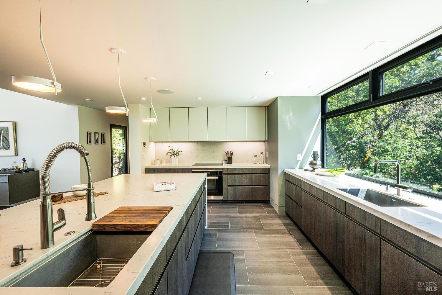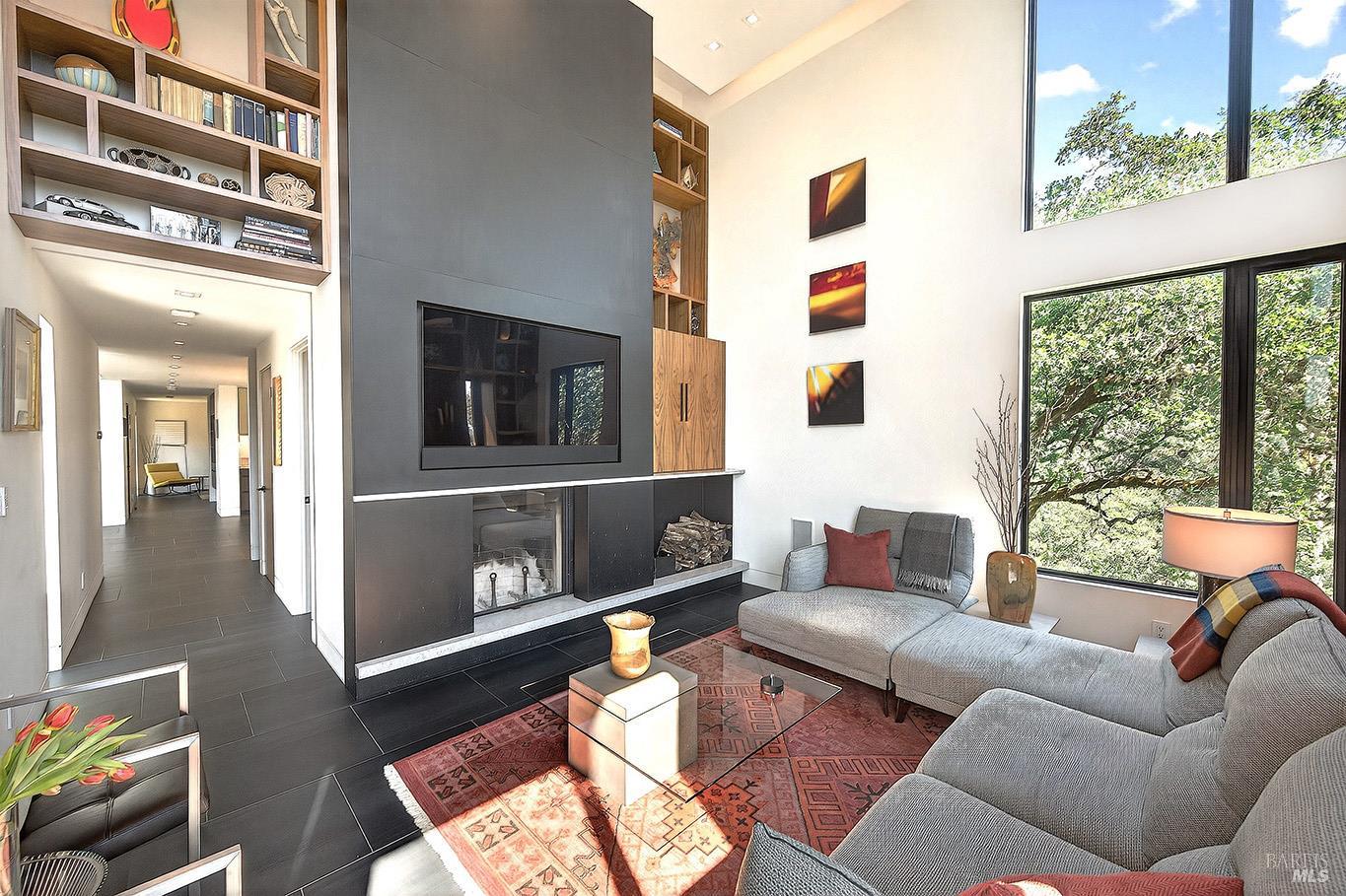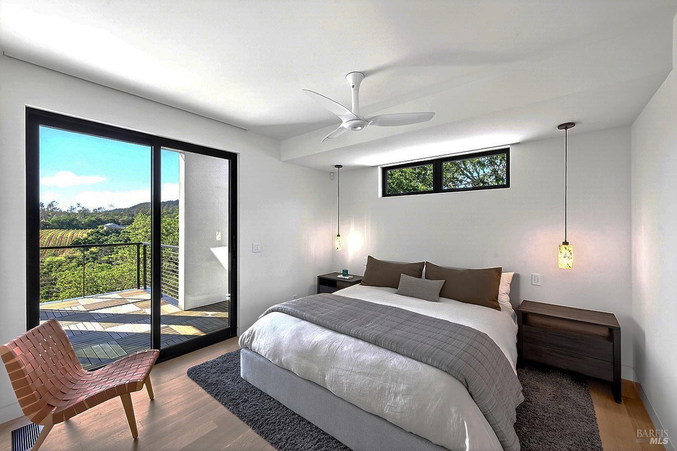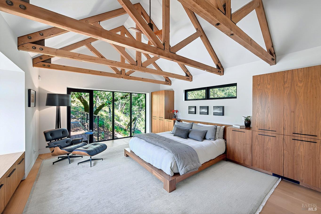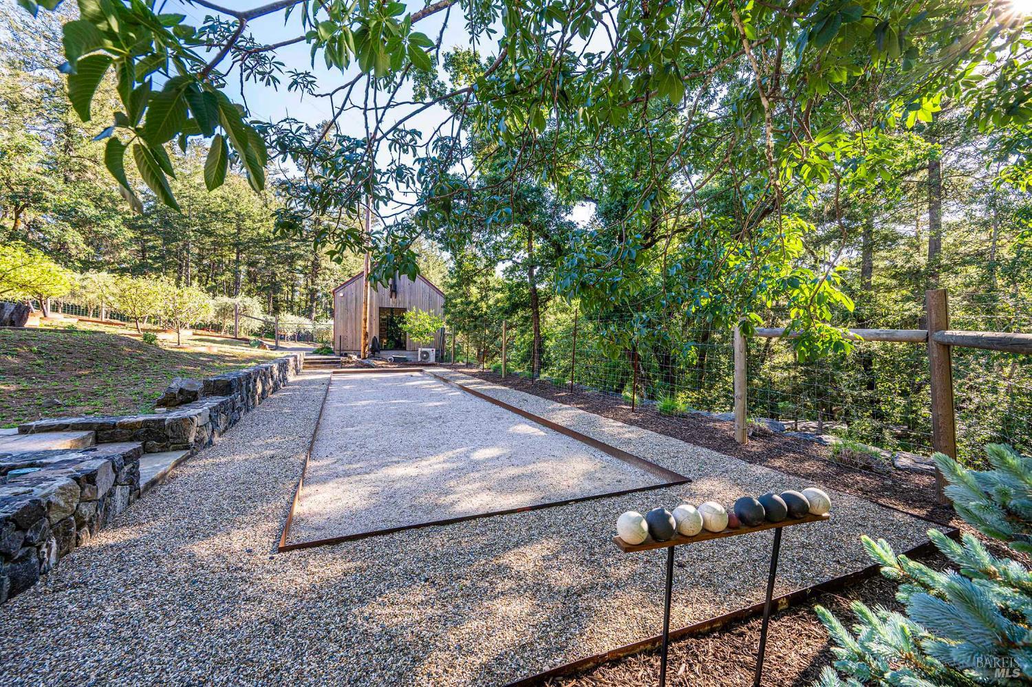 Thoughtfully designed & extensively reimagined, this striking contemporary home blends architectural precision w/warm modern materials & refined livability. A tiered approach creates a dramatic sense of reveal of the residence, framed by curated landscaping and soft, integrated lighting. An earthen-hued stucco facade pairs with natural wood panels and expansive glass, forming a timeless interplay of geometry, scale, and light. A sun-filled great room with 14' ceilings anchors the home, centered around a striking see-through fireplace set against a book-matched granite wall. Expansive folding doors create seamless indoor-outdoor flow, while a sculptural floating staircase with thick wood treads and glass railings serves as a functional work of art. Custom interiors feature quarter-sawn white oak floors and curated walnut casework. Integrated technology includes Control4 automation, Lutron lighting, electric shades, and Sonos sound throughout. The kitchen delivers serious performance; outfitted with Miele appliances, including induction cooktop, multiple ovens, and coffee system, along with Thermador refrigeration, Leicht cabinetry, and quartz surfaces, all complemented by a generous pantry and workspace. A den and media room with 20' ceilings and wood-burning fireplace adds versatility, while the private primary suite displays exposed ceiling trusses, with integrated LED uplighting, custom walnut built-ins, and a tailored closet system. Outdoor living unfolds across a heated three-season screened porch, resort-style lap pool and Caldera spa, and an enclosed dining terrace with built-in grill, pizza oven, and pergola. Fire pit, fountain, and curated landscaping create an immersive setting for relaxation and entertainment. A companion structure, beautifully finished to the same standard as the main residence, offers a 2BR/2BA ADU with private deck and views. The lower level includes a private office, gym with full bath & laundry, and a 3-car garage with storage. Completing the property is a modern agricultural barn with workshop, loft, additional home office and rainwater collection, set among an olive orchard producing estate oil, fruit and citrus groves, raised garden beds, greenhouse, & walking trails. With PV solar, backup generator, private wells and entire property automation, the estate performs equally as a full-time or a lock-and-leave retreat. Ultimate in wine country living...elevated, intentional, and deeply connected to the land.
