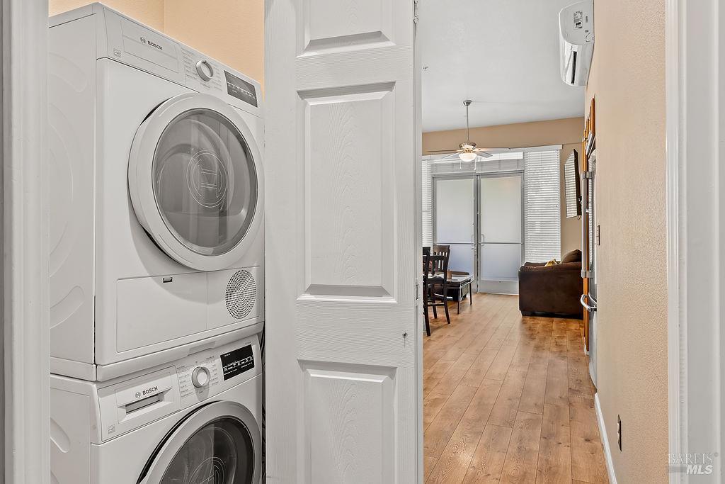 Welcome to this beautifully maintained condo offering modern comfort in a highly convenient location. With soaring 12-foot ceilings and an interior built in 2018, the home feels fresh, open, and thoughtfully designed. Immaculately clean and in excellent condition, this home has been meticulously cared for and is truly move-in ready. The kitchen is both functional and stylish, featuring granite countertops, beautiful cabinetry, and a full suite of stainless steel appliances, including a Maytag refrigerator, Bosch washer and dryer, dishwasher, and microwave. Luxury vinyl plank flooring runs throughout, complemented by air conditioning and an on-demand hot water heater for everyday comfort and efficiency. A clean, well-cared-for home with modern finishes in all the right placesideal for those seeking ease, style, and a convenient lifestyle.