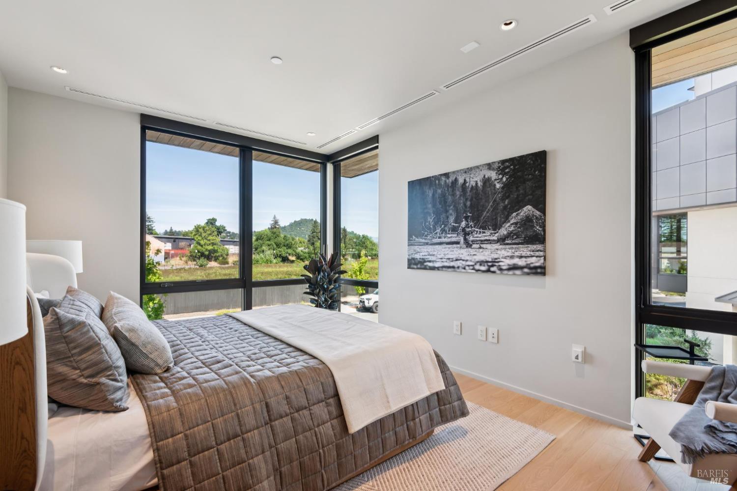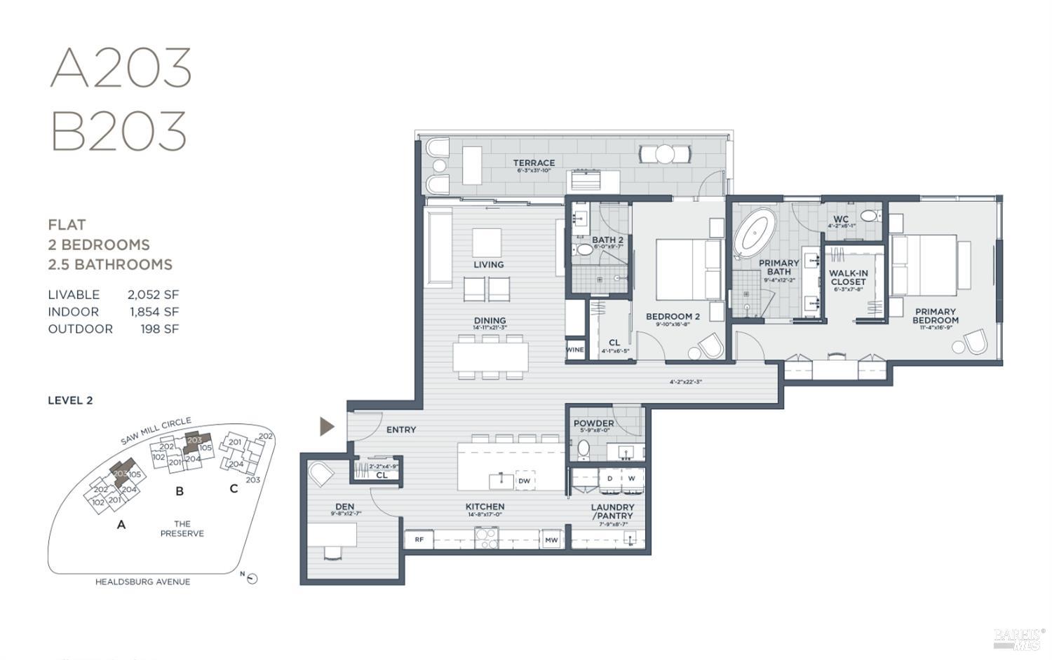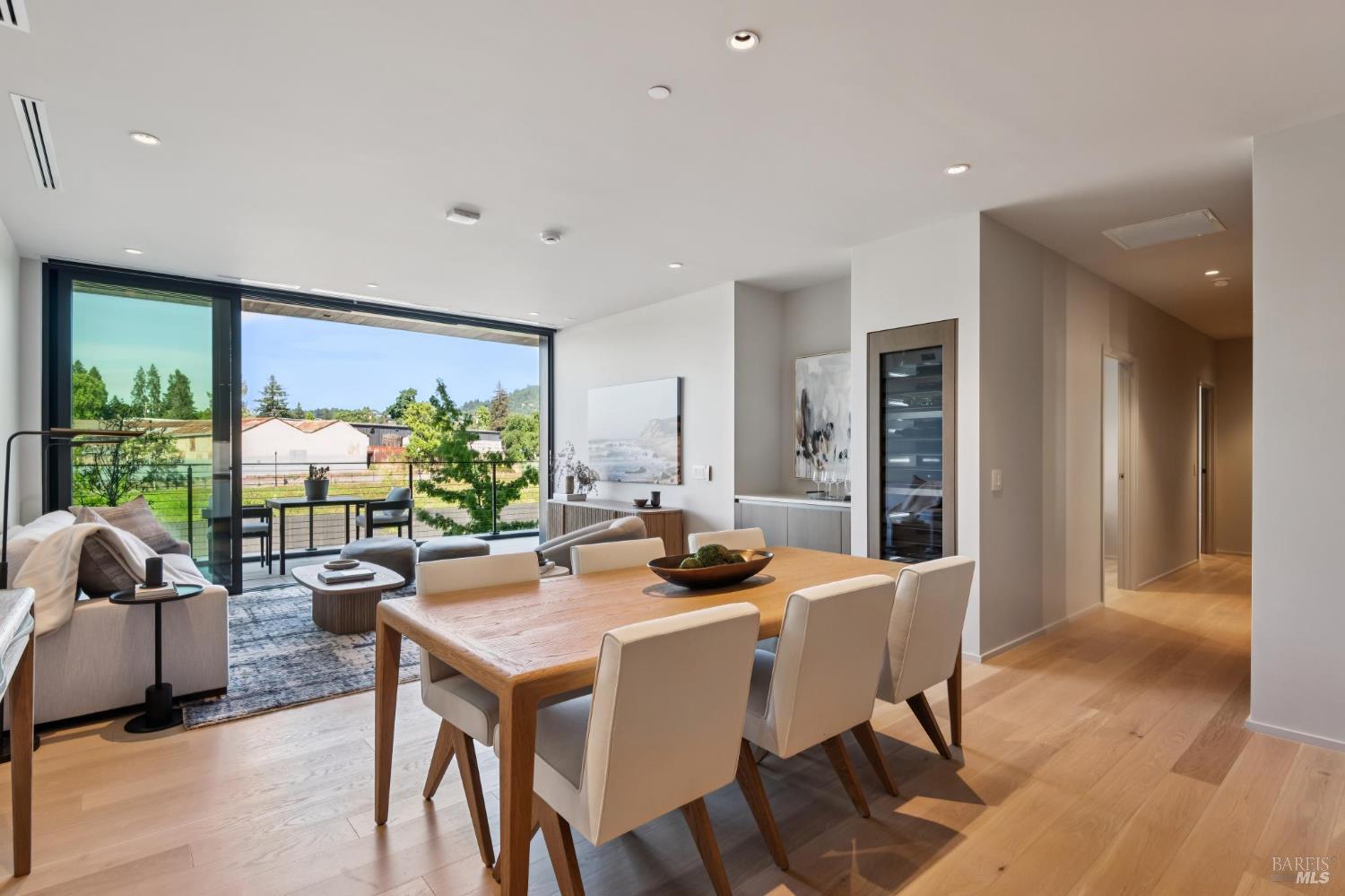 Canopy at Mill District offers a serene sanctuary designed by world-renowned AD100 architect Olson Kundig. Residence A203 is a brand-new home featuring two bedrooms, two-and-a-half bathrooms, and a versatile den, all perfectly perched on the second floor. The heart of the home is an open floor plan, with a gourmet kitchen flowing seamlessly into the living and dining areas. Large floor-to-ceiling sliding doors lead to the private balcony equipped with a built-in BBQ, making it the perfect place for morning sunrises and effortless indoor-outdoor living. The interior is defined by rustic sophistication and luxurious finishes, including Italian-made cabinetry, Miele appliances, stone countertops, and temperature-controlled wine storage. The primary suite serves as a true retreat, featuring a large walk-in closet, a spa-like bathroom with a soaking tub, and a dedicated desk area. The second bedroom also offers a walk-in closet and an ensuite bathroom with a walk-in shower. For added flexibility, the den is perfect for a home office, a fitness space, or a cozy second seating area, while a pantry and laundry room off the kitchen provide additional functionality. Canopy represents a rare opportunity to enjoy a meticulously designed home in the most desirable location in wine country. The 10- acre Mill District community will also include a boutique hotel, a swimming pool, and a fitness center. Located in the heart of Healdsburg, this home blends urban vibrancy with resort-like amenities. You are just a short walk from the charming plaza, Michelin-starred restaurants, and world-class tasting rooms.