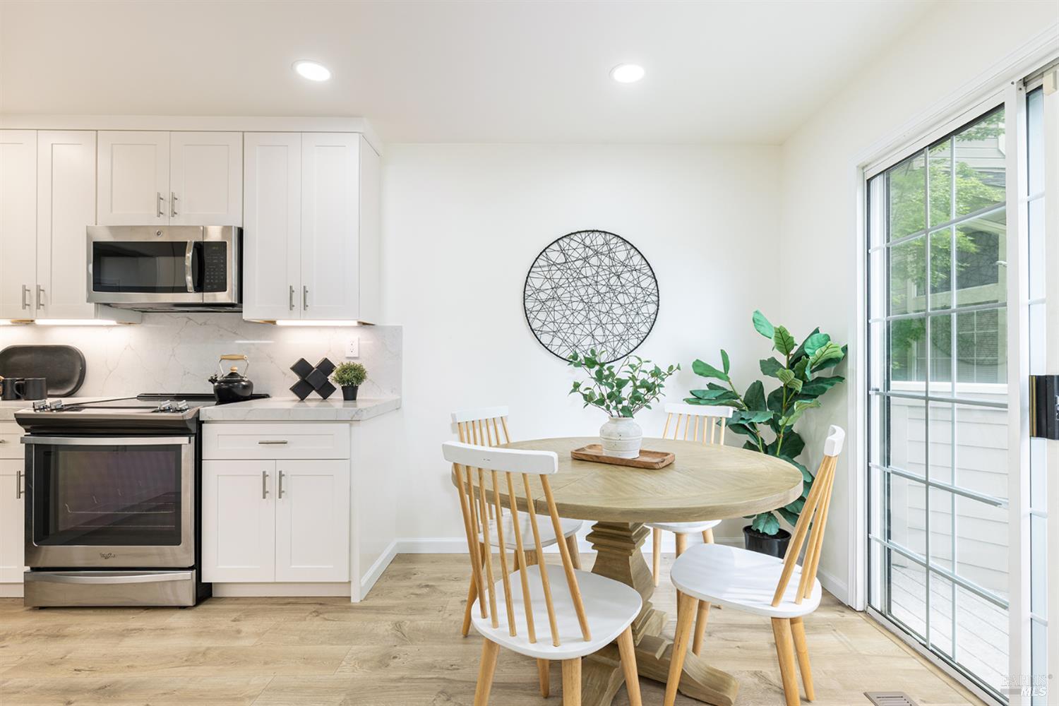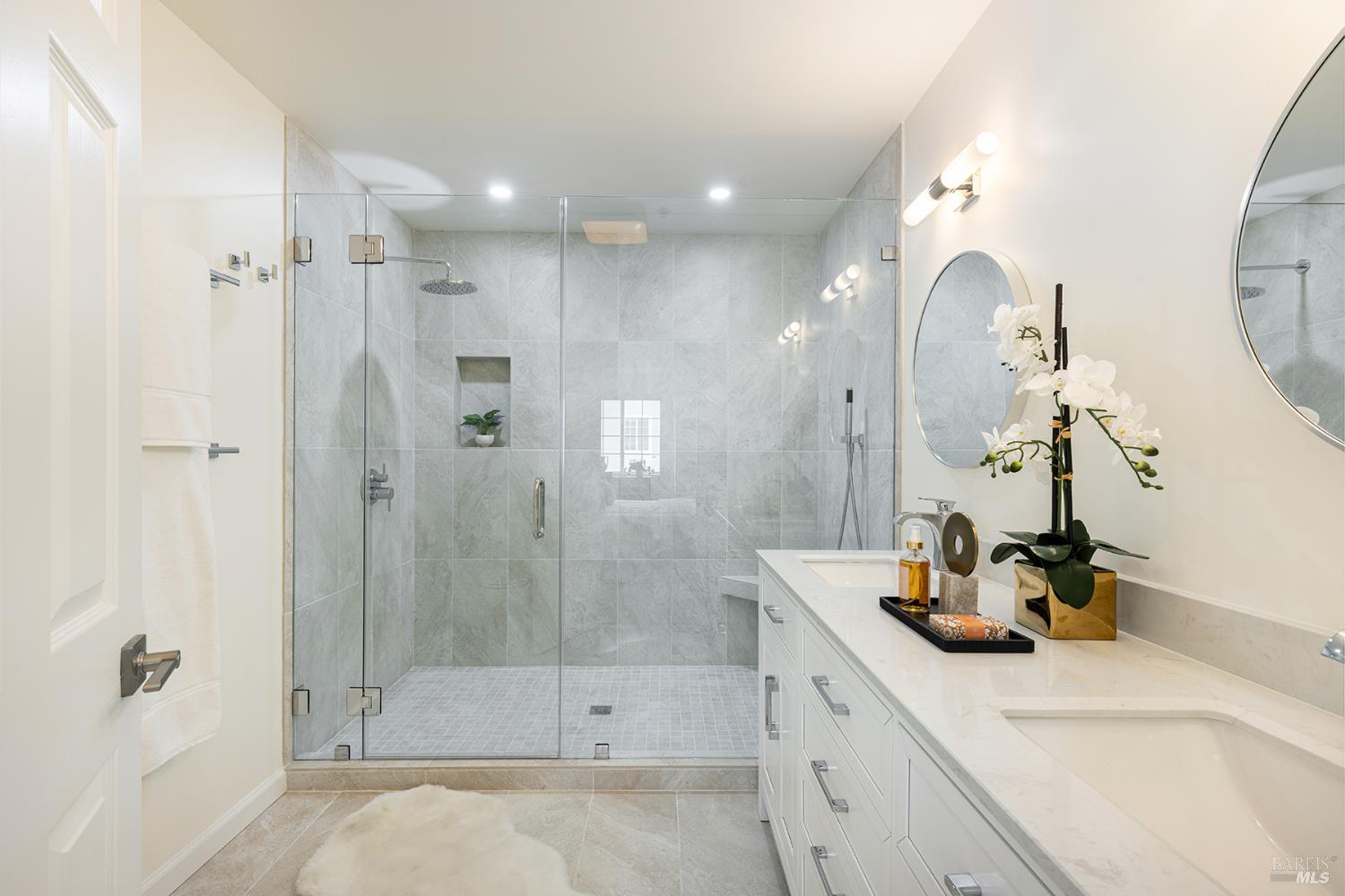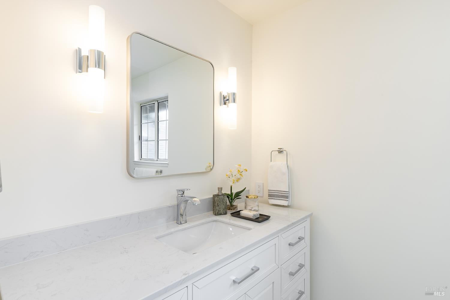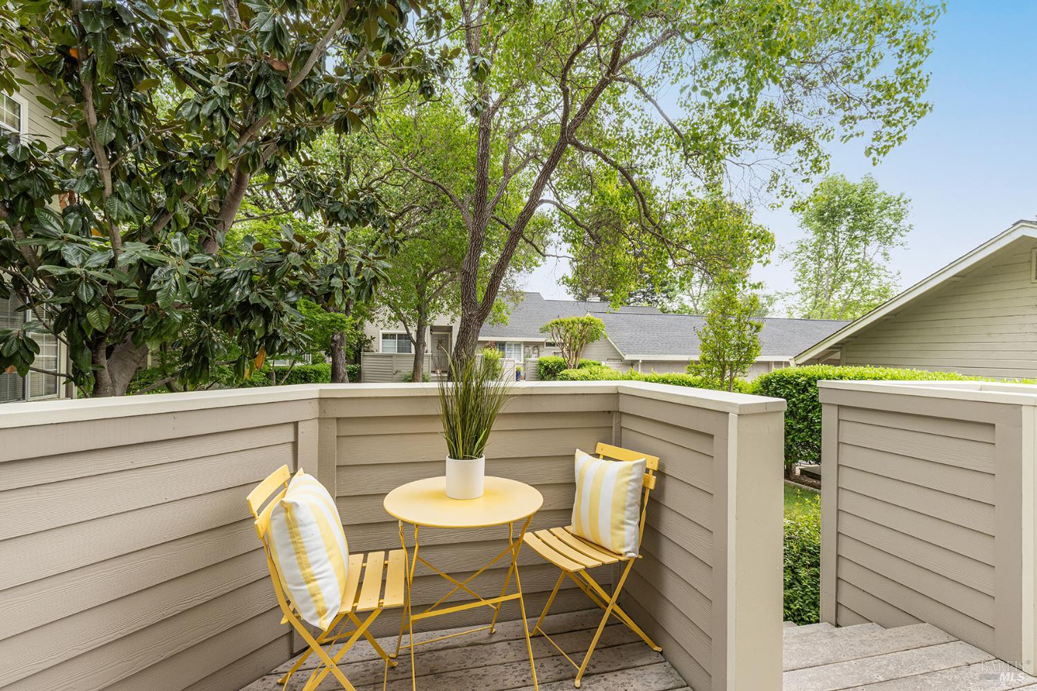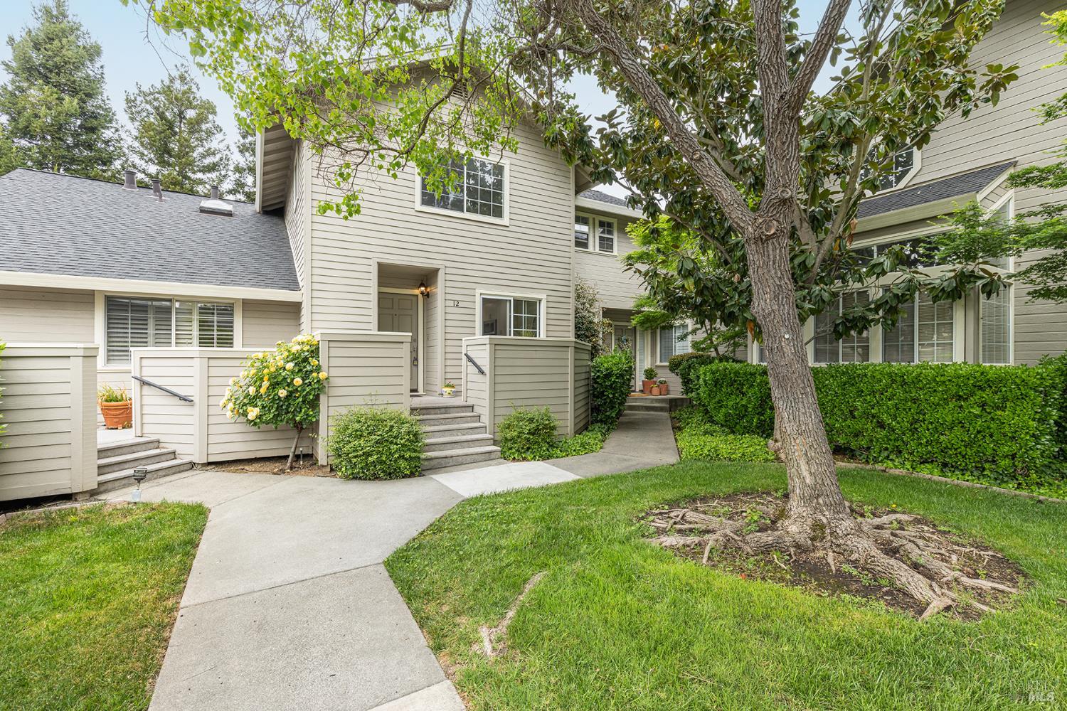 Experience refined resort living at Napa Valley Club, a luxurious 21-acre gated community off Big Ranch Road in North Napa. Enjoy amenities like a stunning pool, clubhouse, spa, walking trails, and lighted tennis and pickleball courts. This spacious 1,542 SF townhome features two large primary ensuite bedrooms and a half bath. The open-concept living space is bright and inviting, with serene views from each ensuite. Benefit from a private entertaining patio, a front porch off the kitchen, and an enclosed detached garage just steps away. The luxuriously updated primary bathroom boasts an extra-large shower adorned with Lumino glazed porcelain tile, an oversized rain head shower with a wand, and a custom glass door. The beautiful double vanity features modern mirrors with chrome trim and Restoration Hardware-style sconces. The second bedroom also includes an ensuite bathroom with custom featuresa large vanity with a marble top, modern chrome fixtures, mirror, and lighting, complemented by an expanded shower with Lumino porcelain tile. The completely renovated kitchen is a chef's dream, showcasing new white shaker-style cabinets, gorgeous quartz countertops and backsplash, a Blanco stainless steel sink, Moen pull-down faucet, and stylish appliances. Special touches include hard-wired under-cabinet lighting, recessed LED ceiling lighting in all rooms, continuous luxury wide plank flooring, and a generously sized eat-in area for casual dining in this light-filled kitchen. This home seamlessly blends comfort and elegance, offering a prime opportunity for wine country living. Embrace the exclusive Napa Valley Club lifestyle, where luxury and serenity converge.