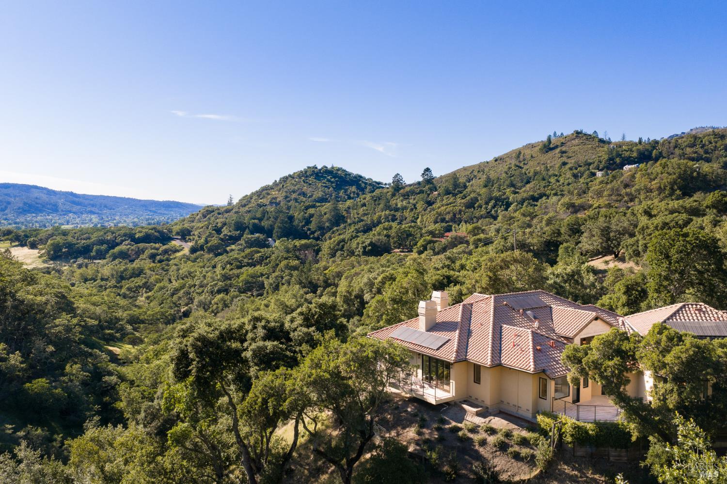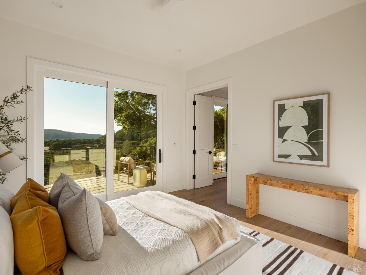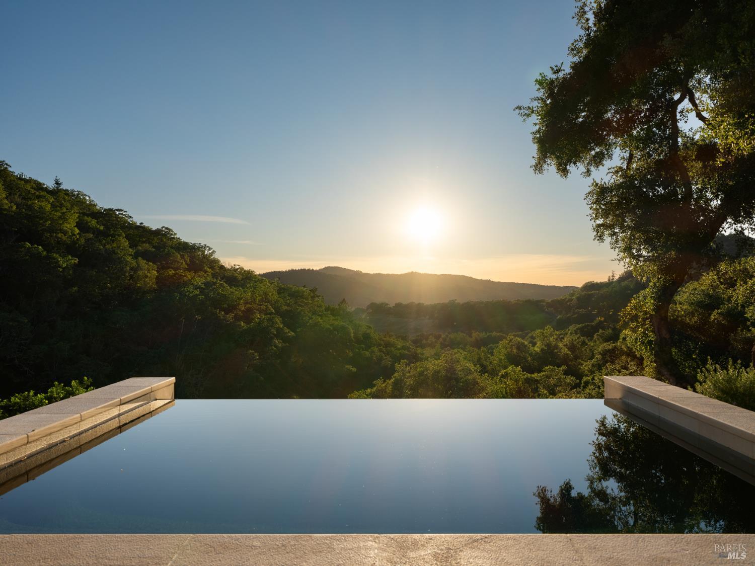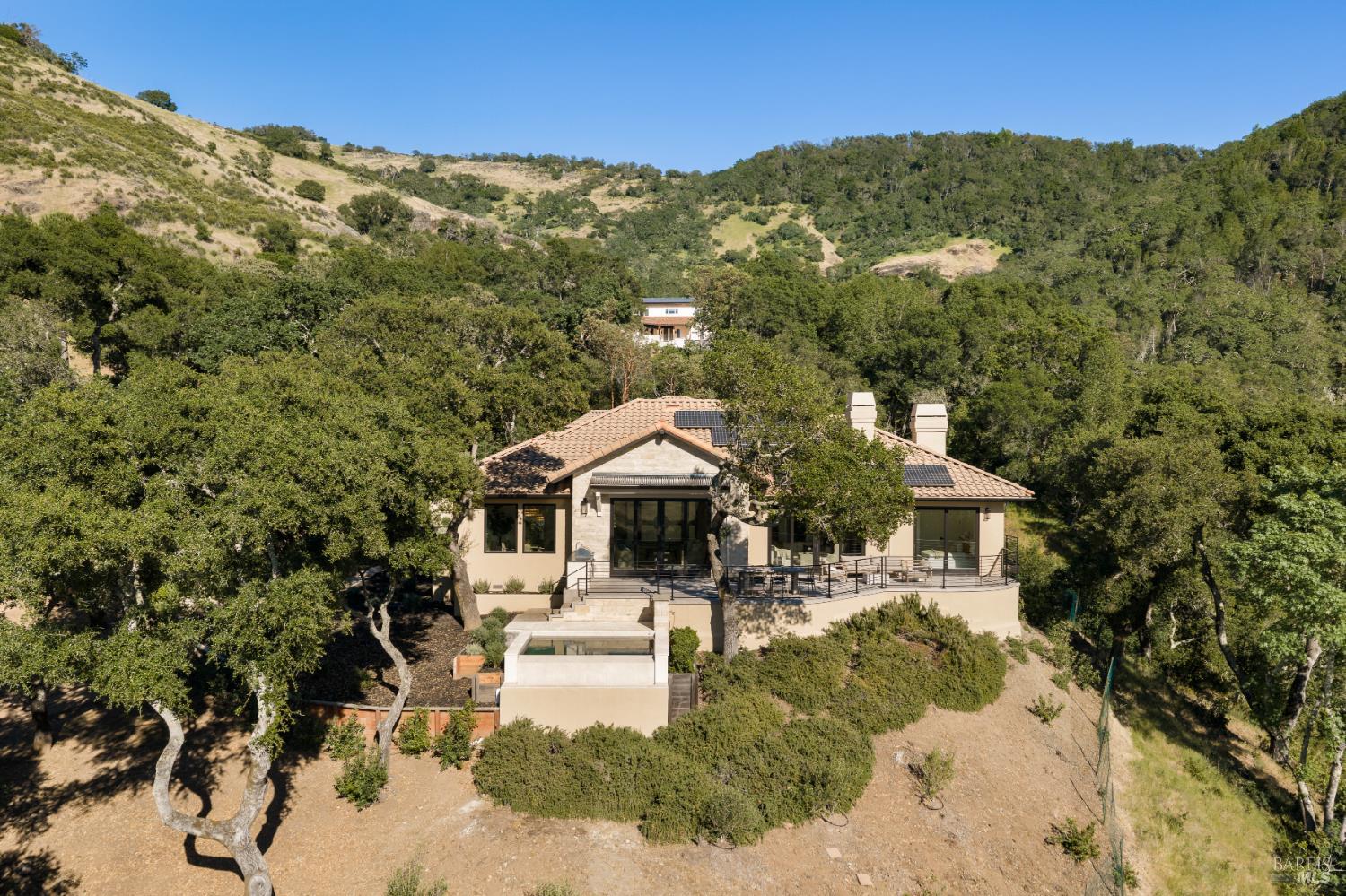Set on approximately 6.74 acres, this 3,807 +/- sq ft home offers expansive views, privacy, and a strong indoor-outdoor connection. Reimagined by MG Taylor Design, the residence features tall ceilings, a 12-foot entry, and a layout designed for flow and entertaining. Interiors include walnut cabinetry, rift white oak vanities, antique oak beams, Thermador appliances, and a wet bar. The home includes a total of 3 bedrooms, 3 bathrooms split between the main house and guest house. Outdoor spaces include a large rear patio, plunge pool, BBQ island, private primary balcony and patio, plus a flagstone patio among the trees. The landscape incorporates drought-resistant plantings aligned with the natural surroundings. Solar system with Tesla Powerwalls and a 3-car garage complete the property.