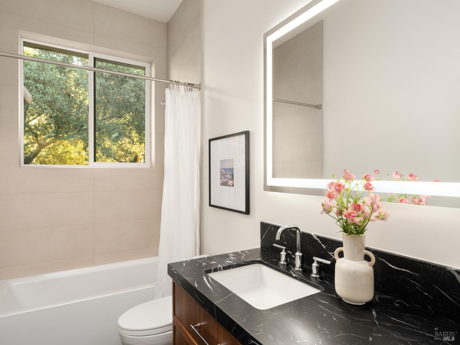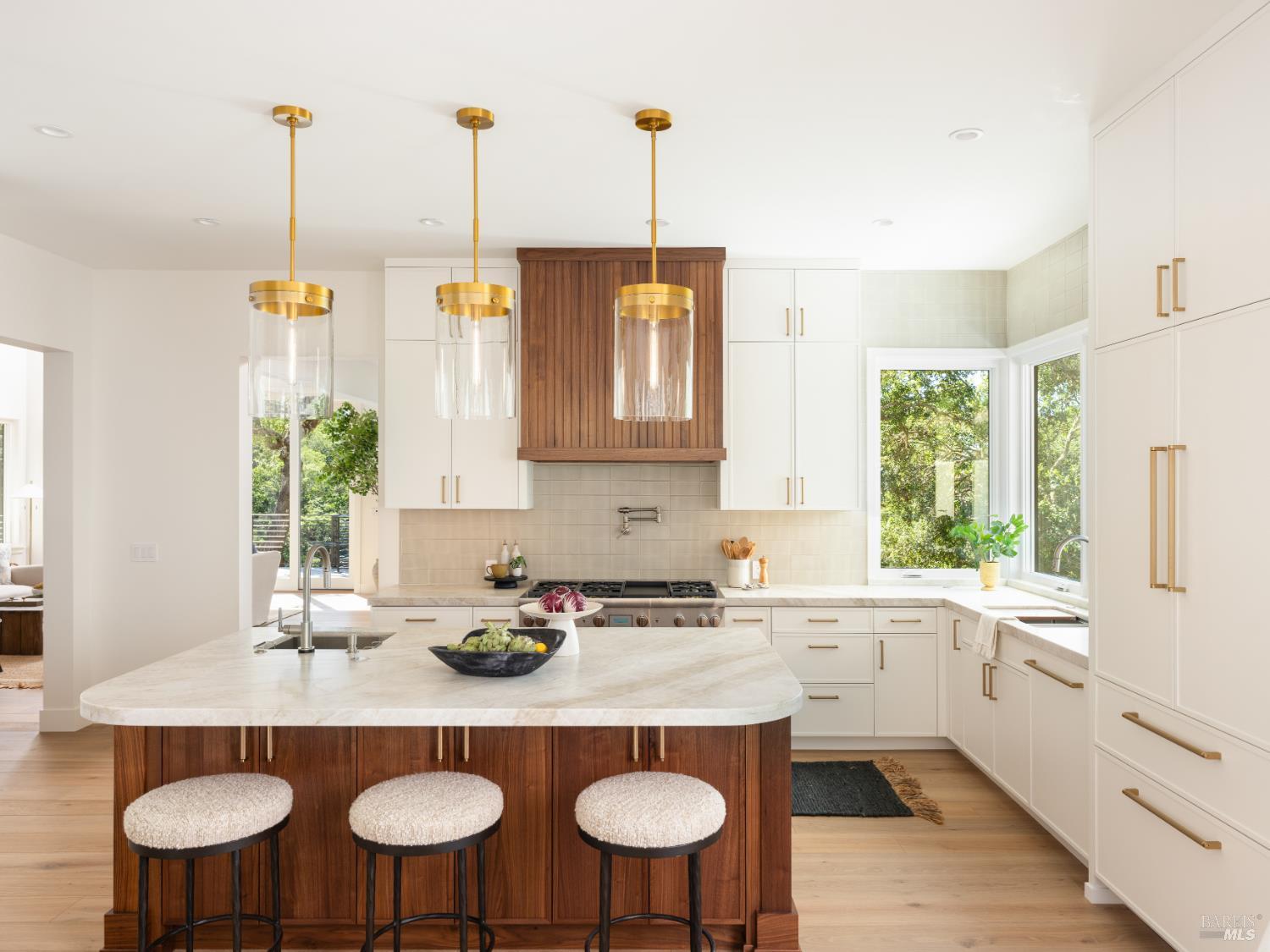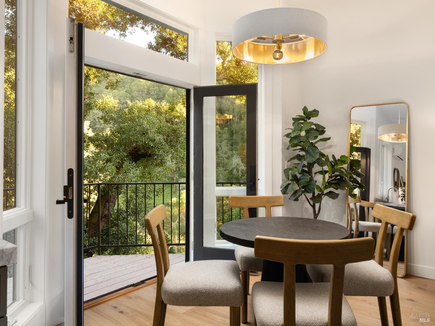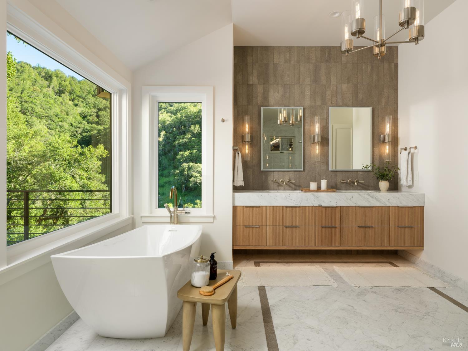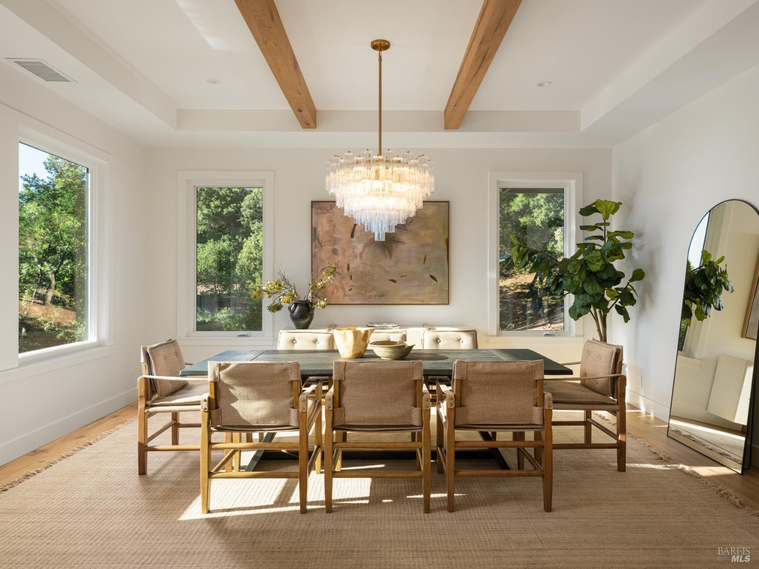 Set on approximately 6.74 acres, this 3,807 +/- sq ft home offers expansive views, privacy, and a strong indoor-outdoor connection. Reimagined by MG Taylor Design, the residence features tall ceilings, a 12-foot entry, and a layout designed for flow and entertaining. Interiors include walnut cabinetry, rift white oak vanities, antique oak beams, Thermador appliances, and a wet bar. The home includes a total of 3 bedrooms, 3 bathrooms split between the main house and guest house. Outdoor spaces include a large rear patio, plunge pool, BBQ island, private primary balcony and patio, plus a flagstone patio among the trees. The landscape incorporates drought-resistant plantings aligned with the natural surroundings. Solar system with Tesla Powerwalls and a 3-car garage complete the property.