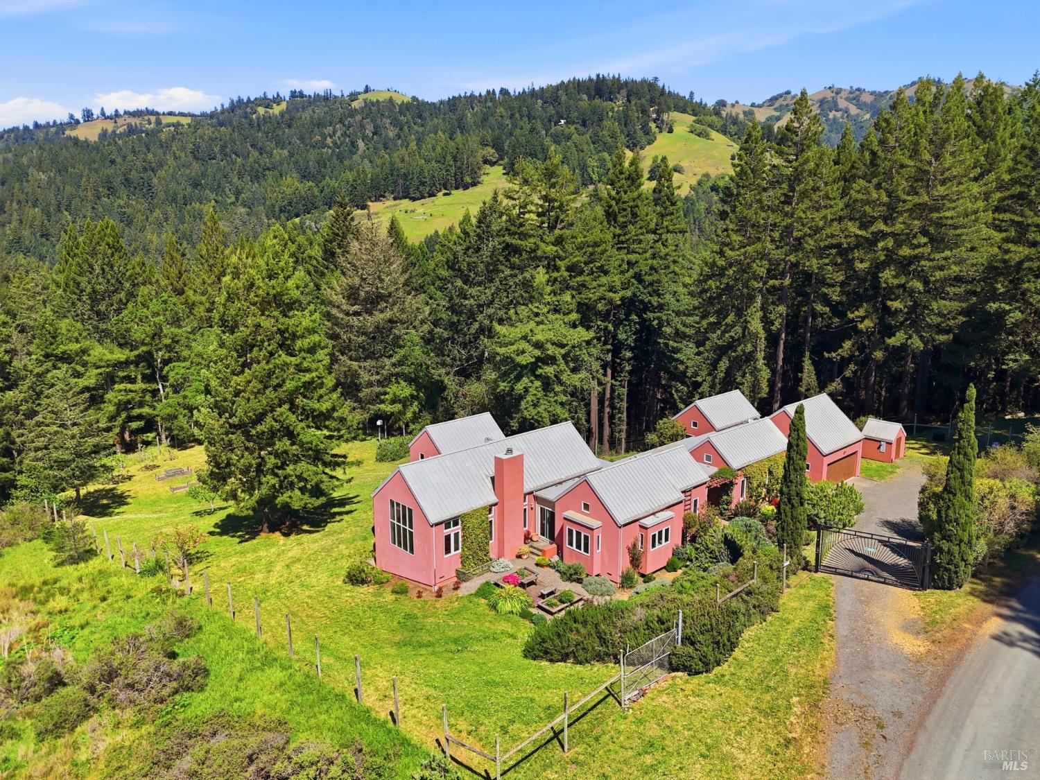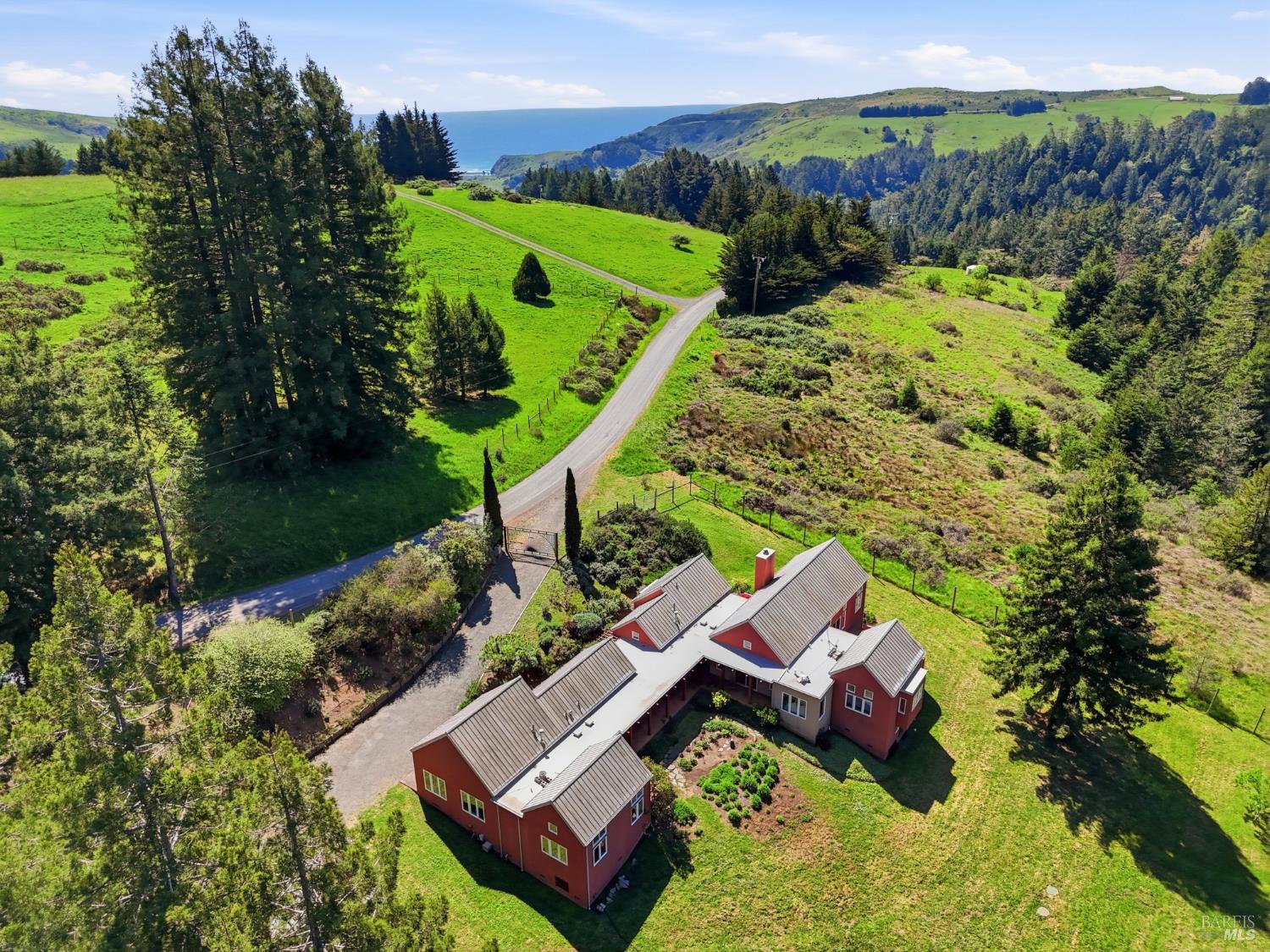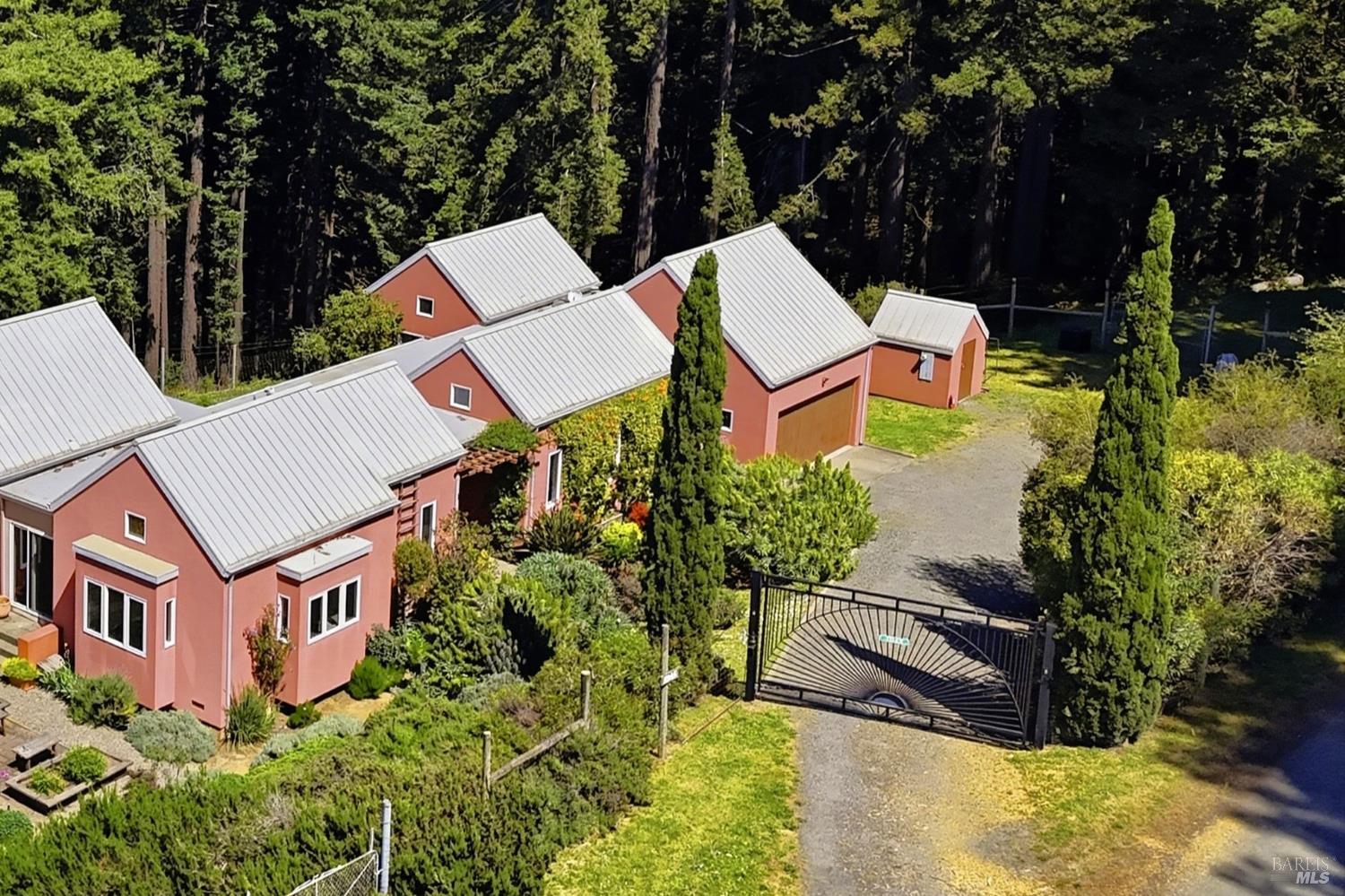 Deep Springs Ranch embodies the finest aspects of coastal living: set upon over 11 tranquil acres, with ocean, meadow and redwood forest views, is this gorgeous single-story home designed by architect Thomas Ballard. Impressive wooden double doors open to a garden oasis and a covered breezeway connecting the generous and private 2-bedroom guest suite with the main house and its spacious kitchen, dining room, living room and well laid out primary bedroom suite. The home has been meticulously maintained and is graced with beautiful details such as dramatic vaulted ceilings and flooring of exquisite Brazilian cherry wood and Italian terra cotta tiles. Large windows and glass doors throughout frame incredible views of nature, and starry skies at night. The living room, kitchen, primary bedroom, and outdoor deck all face west for spectacular sunsets over the ocean. At a more than 700-foot elevation, the home enjoys a wonderful temperate climate, often above any fog that might linger along the ocean. This remarkable property is part of the Muniz Ranches, a collection of multiacre parcels created in the 1970s. Muniz Ranches adjoins, and has private access to, the 5,600-acre Jenner Headlands Preserve with its miles and miles of hiking trails. One of many local beaches, Russian Gulch Beach, is conveniently located near the gated entrance at Highway 1. This rare and extraordinary getaway or permanent home is less than 18-miles to downtown Guerneville, less than 35-miles to Santa Rosa, and only 80-miles north of the Golden Gate.