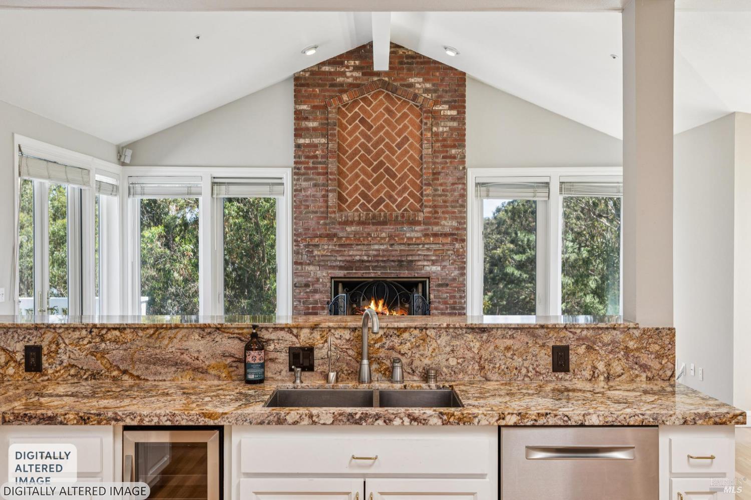 Perched above the sparkling waters of San Francisco Bay in San Rafael, this magnificent multi-level Marin home delivers the ultimate California living experience. A dramatic pergola-covered entry walkway sets the tone the moment you arrive, leading to grand double doors that open into a soaring interior where vaulted ceilings, exposed beams, and walls of white-framed windows frame jaw-dropping Bay and treetop views from nearly every room. The sun-drenched great room stuns with gleaming hardwood floors, a sleek modern fireplace, and a whimsical cascade of colorful glass pendant lights. The chef's kitchen is a showpiece: white cabinetry, dramatic gold-veined granite countertops and a matching full-height backsplash, dual skylights, a center island with gas cooktop, built-in stainless refrigerator, double ovens, wine refrigerator, and a charming bay-windowed breakfast nook overlooking the trees. A second brick fireplace anchors the lower-level family room, which opens directly to one of several outdoor decks. The primary suite is wrapped in windows with a generous built-in dressing area and a luxurious marble bathroom featuring a soaking tub, separate shower, and double vanity. Additional bedrooms are bright and well-sized, with ample closet storage and garden views. A dedicated home office with floor-to-ceiling built-in cabinetry, a full laundry room with sink, and a spacious pantry with wine rack complete the package. Outside, the grounds are simply extraordinary: terraced gardens bursting with roses, rhododendrons, agaves, and succulents wind along stone pathways past an artificial turf lawn with peeking Bay views. A dramatic exterior spiral staircase connects the levels. Three-car garage completes this rare Marin gem.