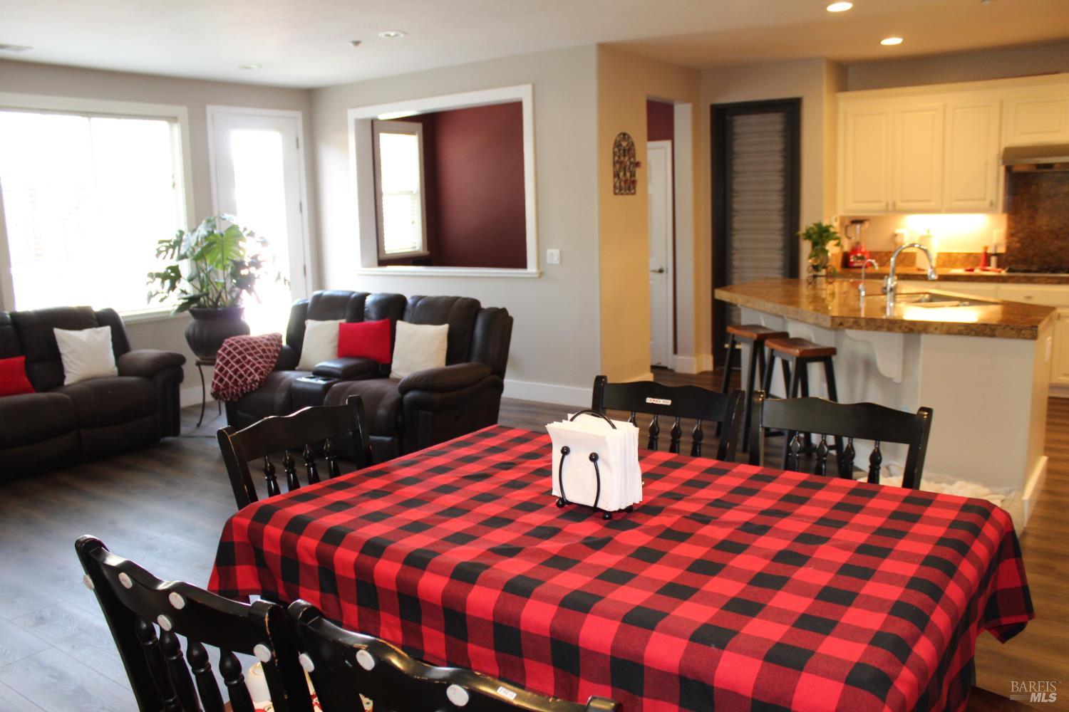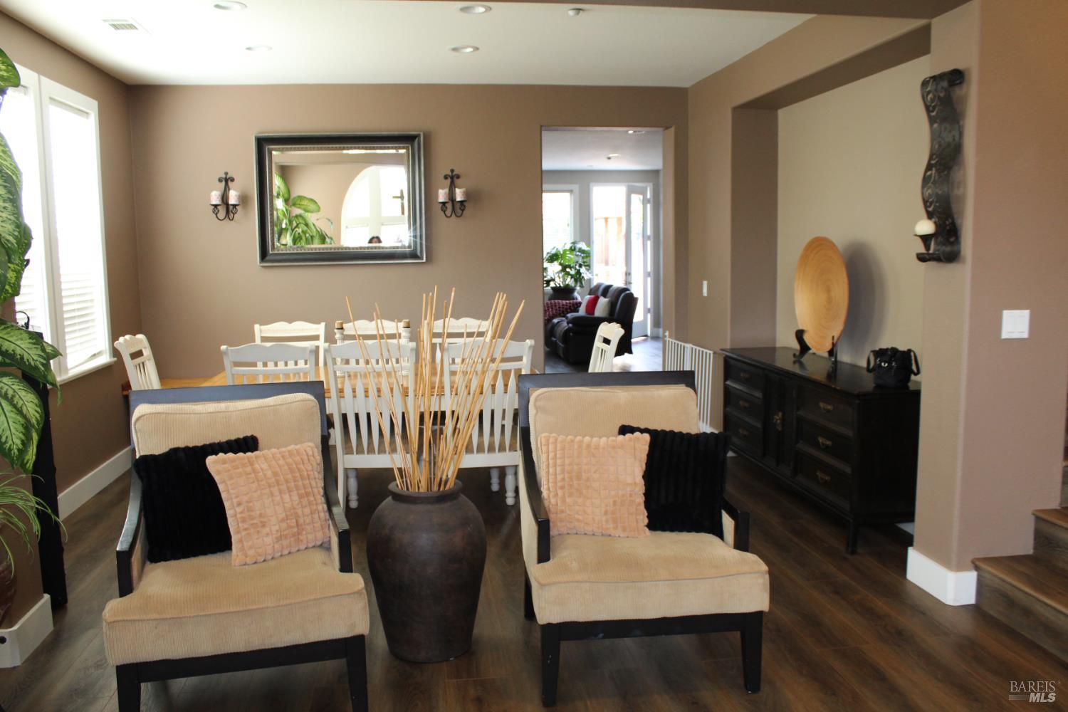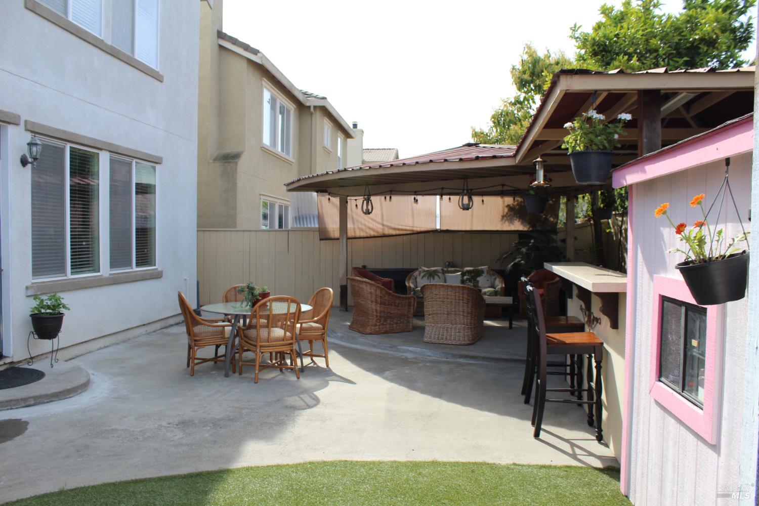 Six bedroom/three full bath beautiful, well-maintained family home in desirable location in American Canyon. Home features open lighting and open floor plan for family entertaining. There is a living room, family room w/fireplace, a formal dining area and family dining. Near kitchen area, there is a specific space for an office area. There is a section of the downstairs portion of the home, which has been sectioned off by a wood panel which can easily be removed. The private sectioned-off area includes a separate and private entrance from the outside, a kitchenette, full bathroom, and a bedroom. Main home includes the remaining four bedrooms, which are all upstairs. The primary bedroom is open and includes two walk-in closets, a sunken tub and shower. The laundry room is also located upstairs and is spacious. Home has PVC flooring throughout. The back yard features a full outside kitchen/barbeque area. There is a shed for storage and a child's playhouse. This home is in a ready-to-move-in condition.