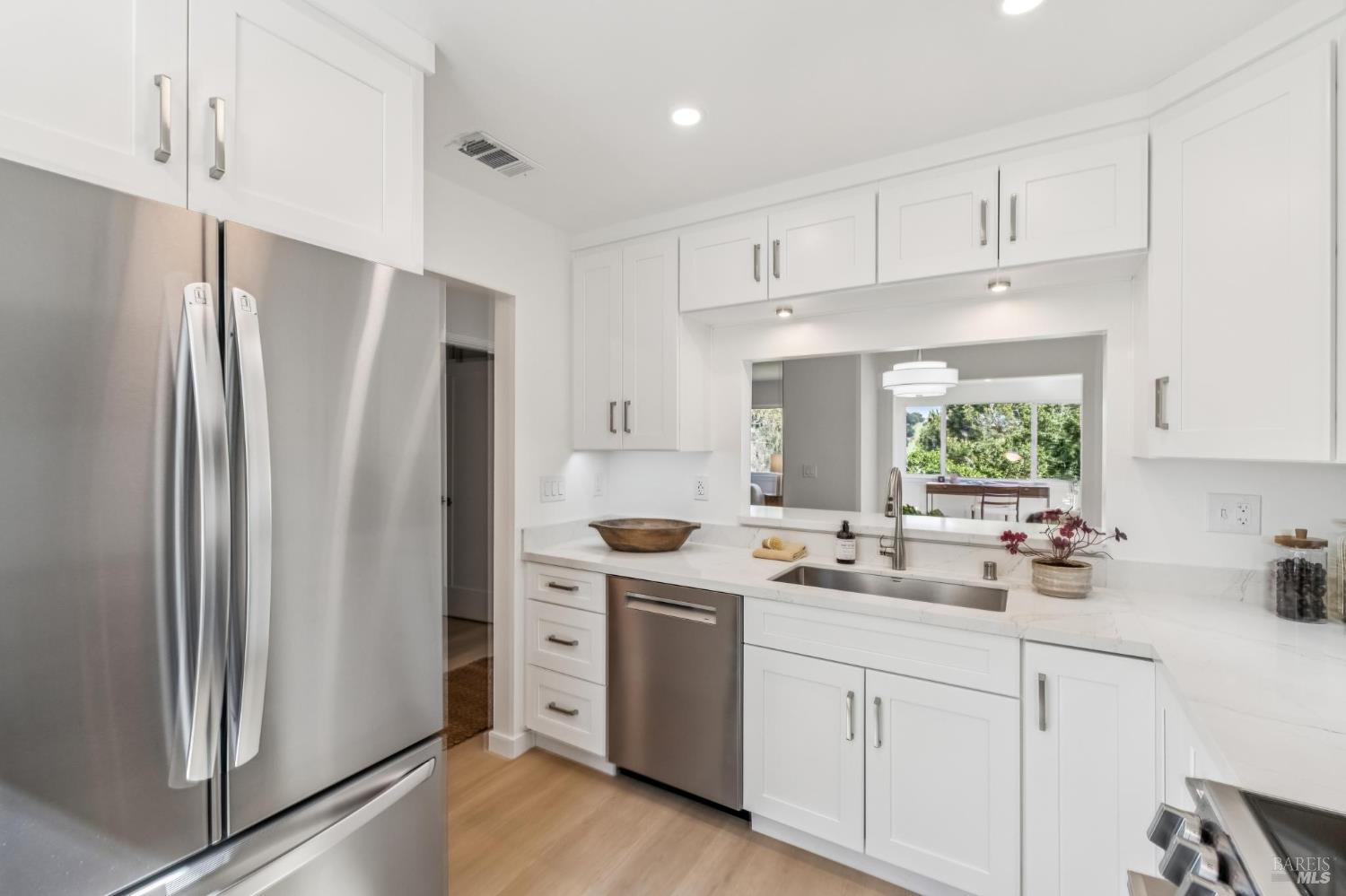 Tucked into the trees at the end of a quiet row, this fully remodeled townhome bathes in abundant natural light, It's the kind of spot that makes you exhale when you walk in. The main level is open, bright, and built for how you actually spend your time. Wide-plank new flooring runs throughout, connecting a living room with a natural fireplace, a dining area, and a fully remodeled kitchen. A flex space off the main room works as a home office, den, creative corner, or the spot where the dog naps in the sun. A powder room completes the main level. Downstairs, three bedrooms sit tucked away from the living space with new carpet and a quieter, more private feel. The primary is ensuite with its own remodeled bath, and two additional bedrooms share a second full bath that's been beautifully updated to match. Outside your door, Shelter Ridge delivers the trails, pools, tennis, and open space, and downtown Mill Valley is minutes away when you want coffee, dinner, or jaunt to the farmers market. Easy freeway access keeps the commute to the city painless or wine country weekends less than an hour away. Remodeled, move-in ready, and set in one of Mill Valley's best lifestyle spots17 Thoreau Circle is ready when you are.