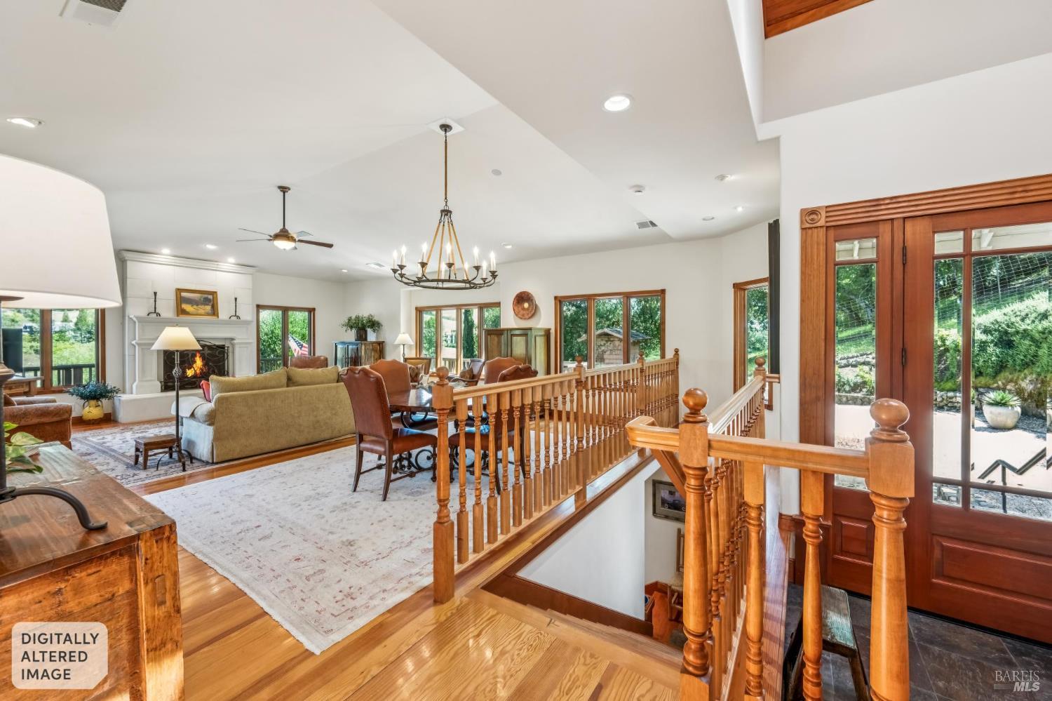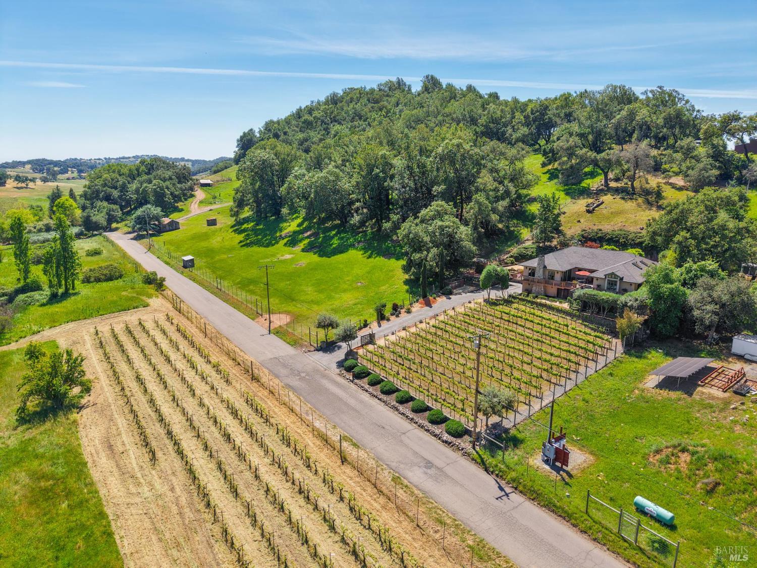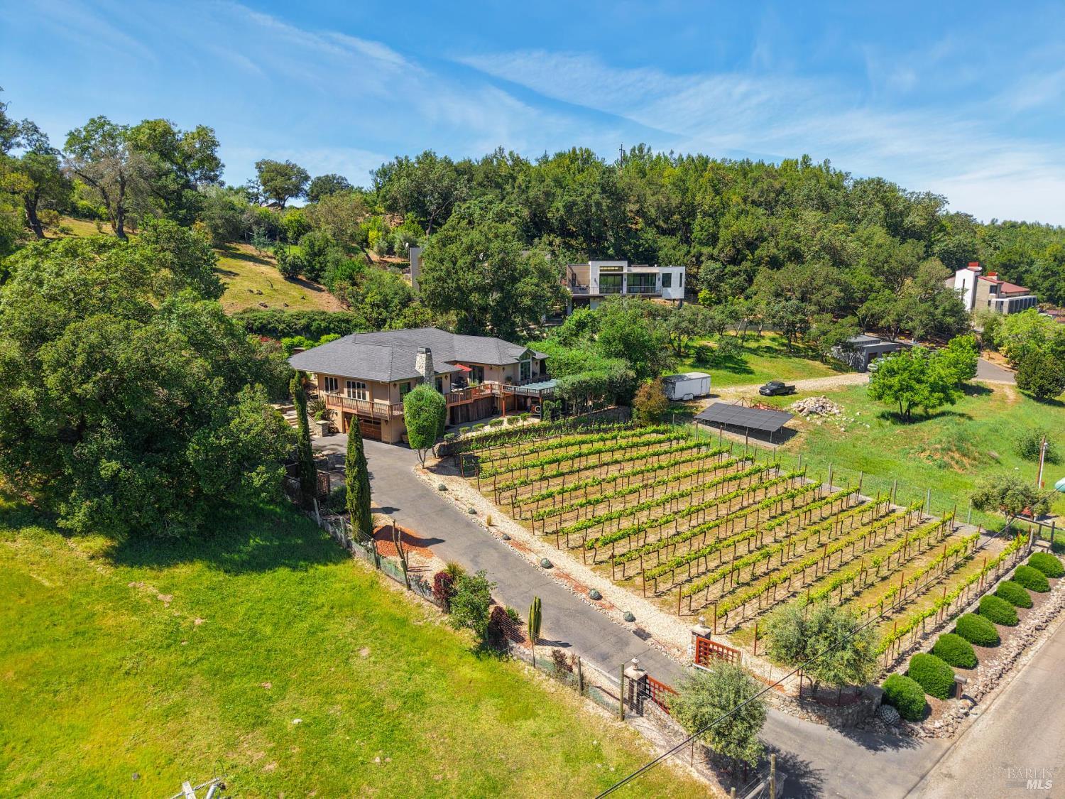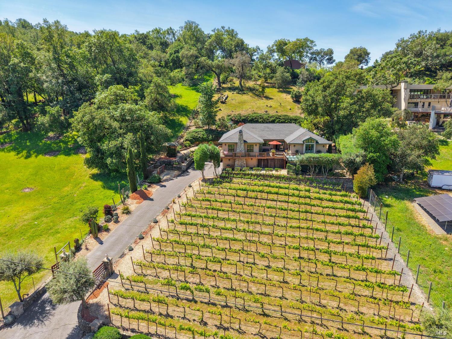 Perfectly located on coveted Lovall Valley, this property is situated on Sonoma's Eastside and showcases exceptional views of nearby vineyards and surrounding hillsides. A gated entry leads past stone walls and native landscaping to a hobby vineyard with approximately 300 mature Petit Verdot vines. Upon entering the residence, you are greeted by a spacious living room with cathedral ceilings and expansive windows designed to capture the dramatic landscape and natural light throughout the day. Gleaming fir floors and a gas fireplace create a warm, inviting atmosphere. The kitchen is equipped with a Wolf range, Sub-Zero refrigerator, generous storage, and connects seamlessly to the dining area, which features coffered ceilings and French doors that open to the grounds. The outdoor areas are thoughtfully designed and include a pergola draped in trumpet vines, creating a natural extension of the living space and a perfect setting for entertaining friends and family. The single-level layout offers three bedrooms and two and one-half bathrooms, all with consistent wood flooring. The expansive primary bedroom features high ceilings and French doors that lead to a nearby deck. Enjoy all that Sonoma Valley has to offer in this inviting Wine Country retreat, centered around views, indoor-outdoor living, and a strong connection to Sonoma's natural beauty.