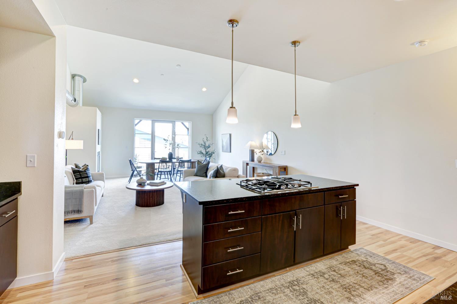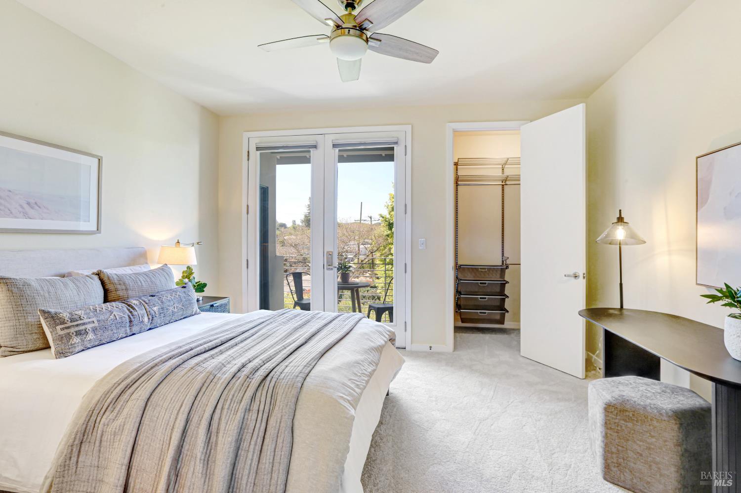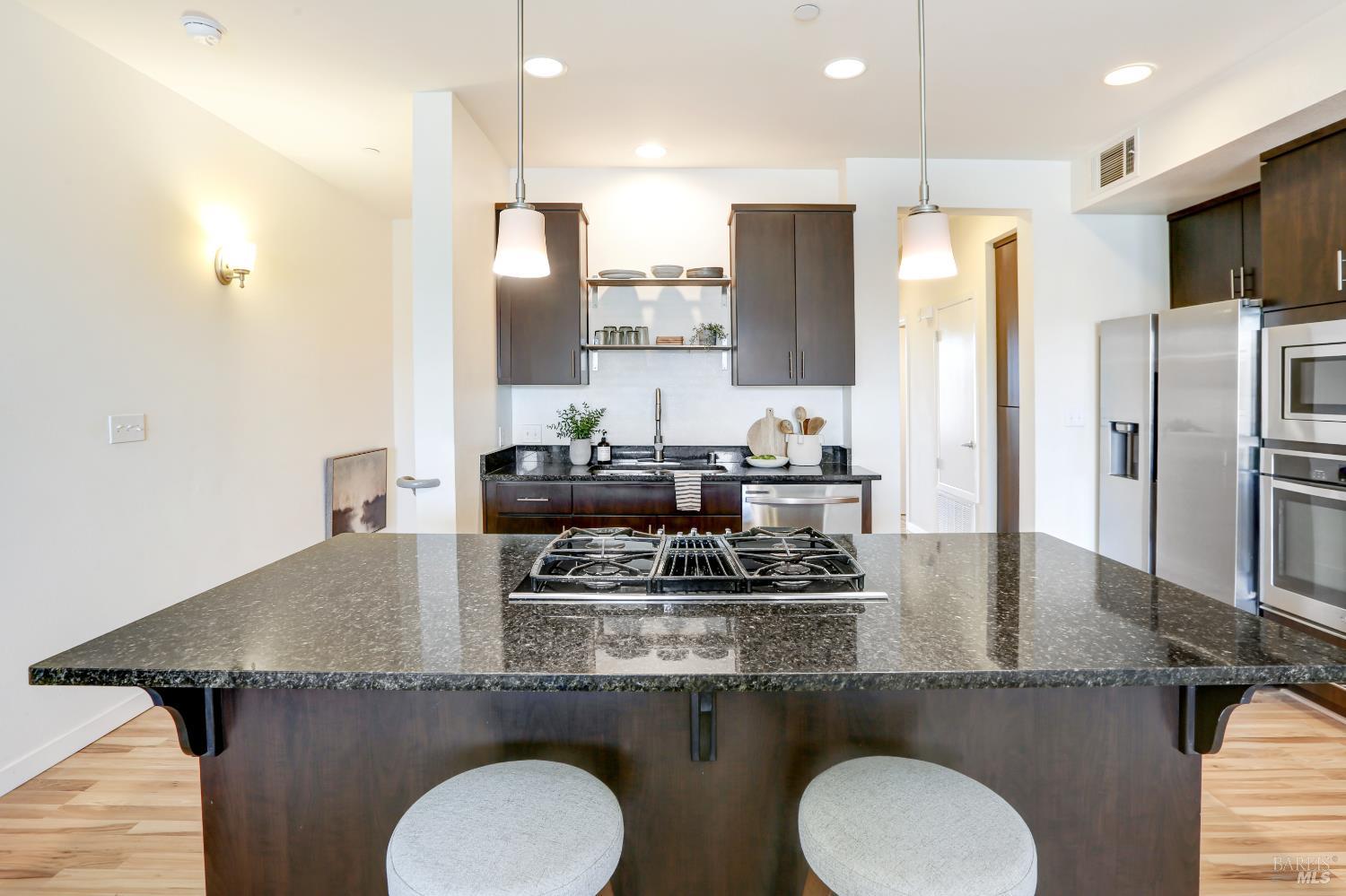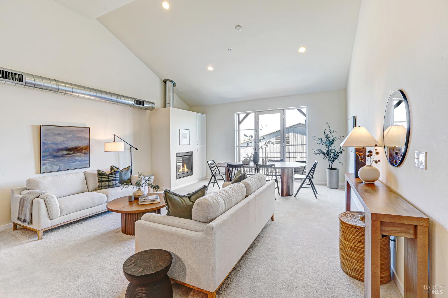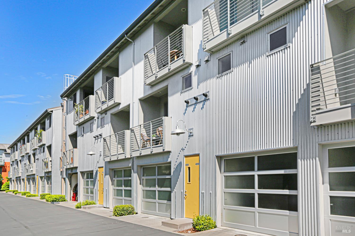 Beautifully designed contemporary condo offering a true urban living experience in the heart of downtown Petaluma, just moments from the Theatre District and riverfront. This light-filled home features two bedrooms, two and a half bathrooms, and an attached one car garage equipped with a NEMA 14-50 outlet for EV charging. With a well-appointed, contemporary layout, the open concept living space showcases clean lines, modern finishes, and a loft like feel with abundant natural light throughout. The seamless flow between the kitchen and living area creates an ideal setting for both everyday living and entertaining. Three balconies provide inviting outdoor spaces to relax and take in city and mountain views. Enjoy the convenience of being just steps from downtown restaurants, shops, galleries, and riverfront pathways. Perfect for those seeking a vibrant, low maintenance lifestyle in one of Petaluma's most desirable locations.