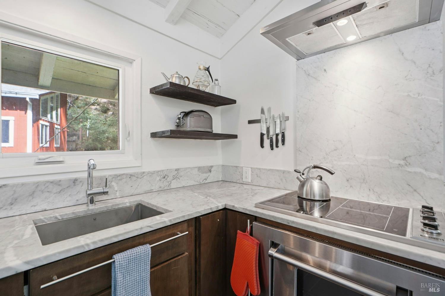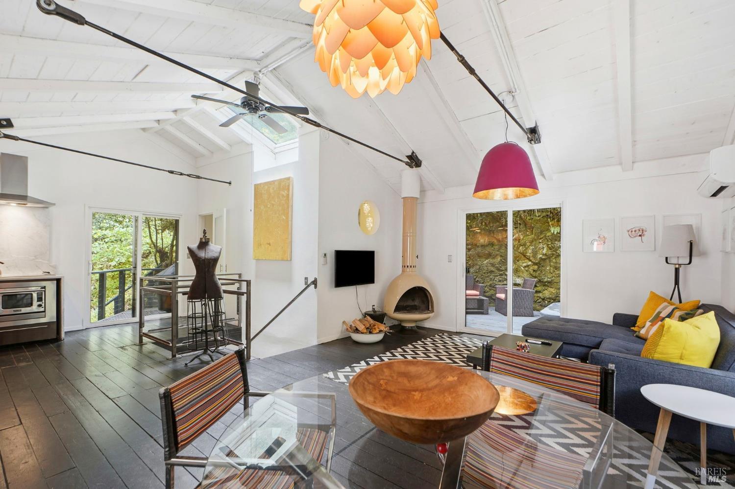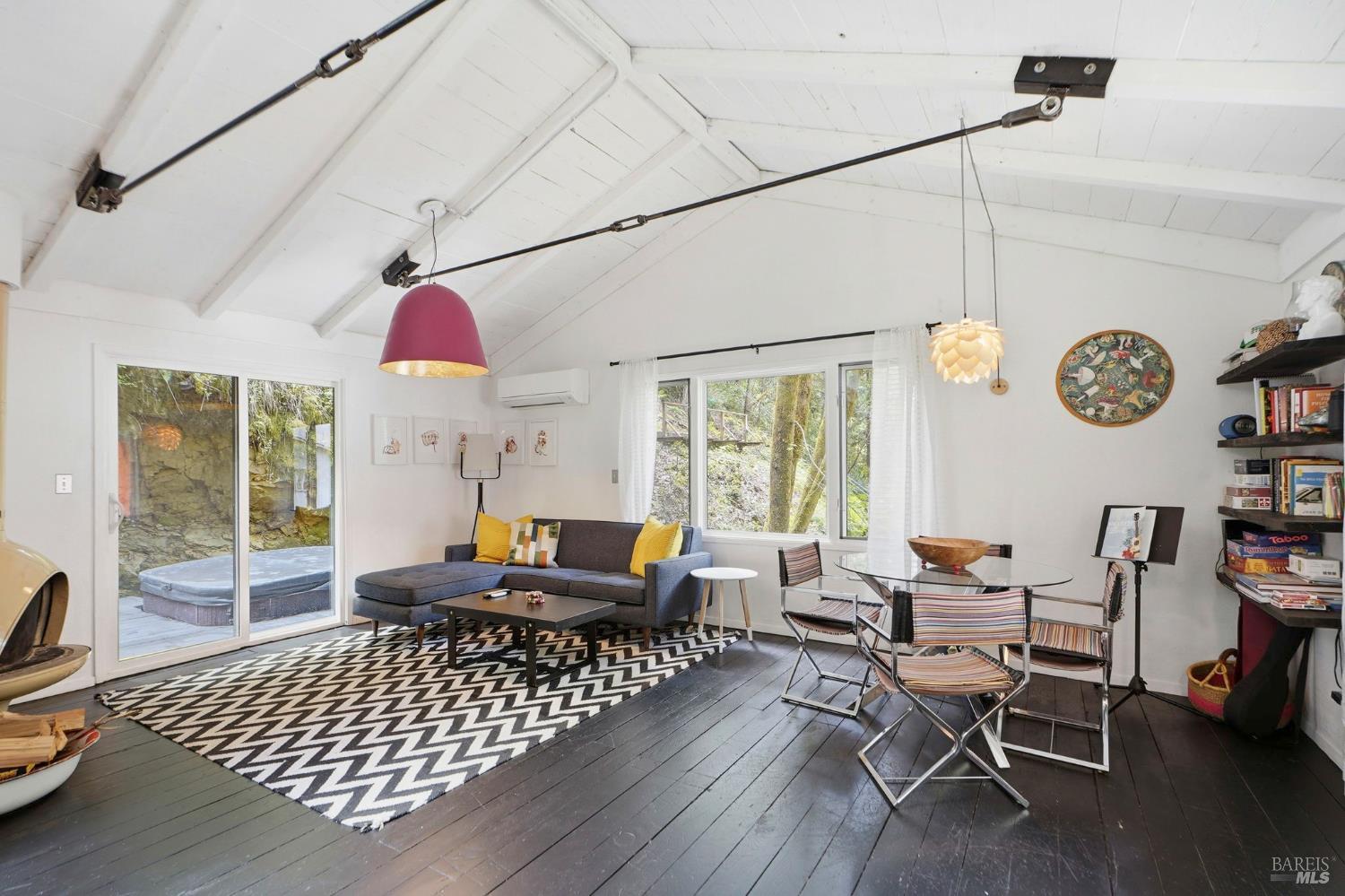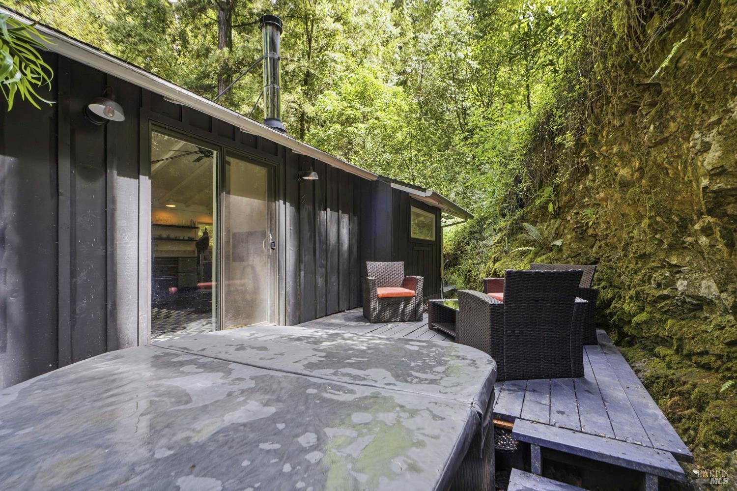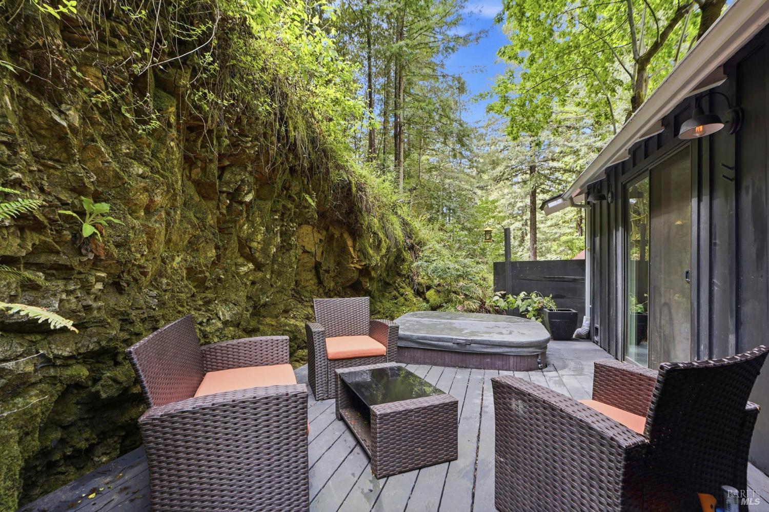 This charming 1963 hillside cottage packs an incredible punch into 922 square feet hardwood floors, light from every angle, and a chef's kitchen that will stop you in your tracks. And what a kitchen it is. Viking combination oven (steam, microwave & convection), Viking induction cooktop, drawer refrigerators and freezer, Bosch whisper dishwasher, and stunning marble counters. Designed for the serious cook and the casual entertainer alike. Step outside to private decks and a hot tub perfectly positioned for soaking under the redwoods after a day on the Russian River. Armstrong Redwoods, world-class wineries, and Guerneville's beloved dining and shops are all just minutes away. Whether you're seeking a full-time home or the perfect weekend getaway in one of the North Bay's most sought-after destinations this one delivers.