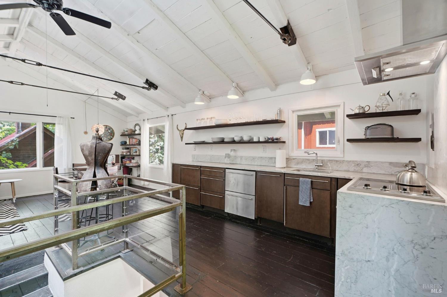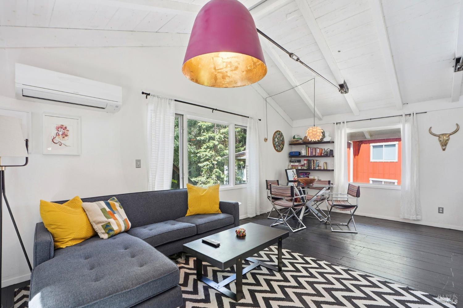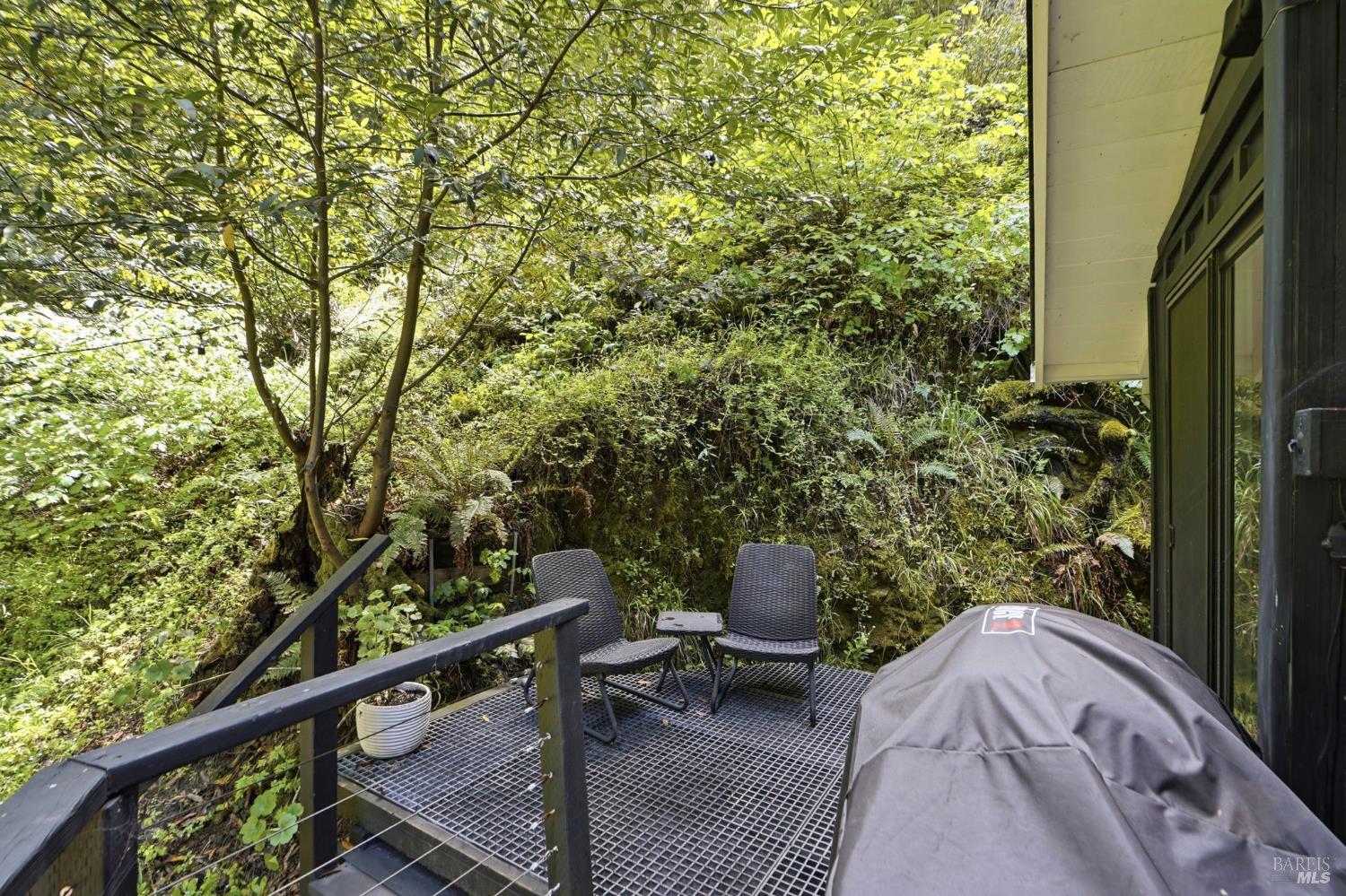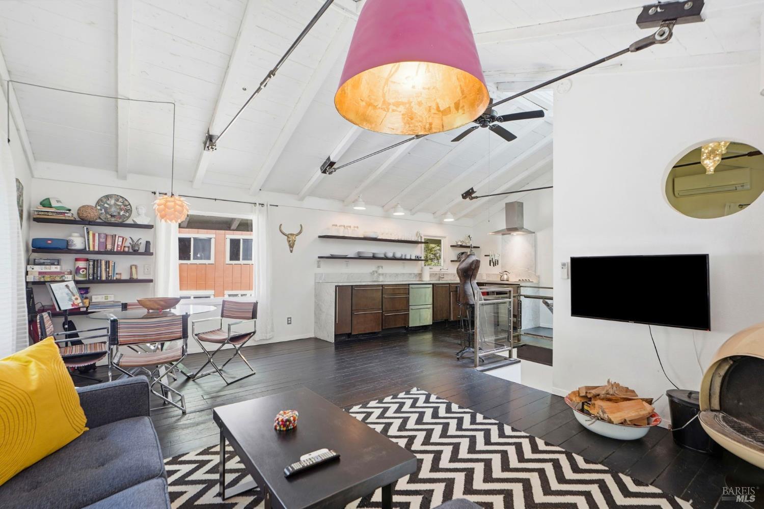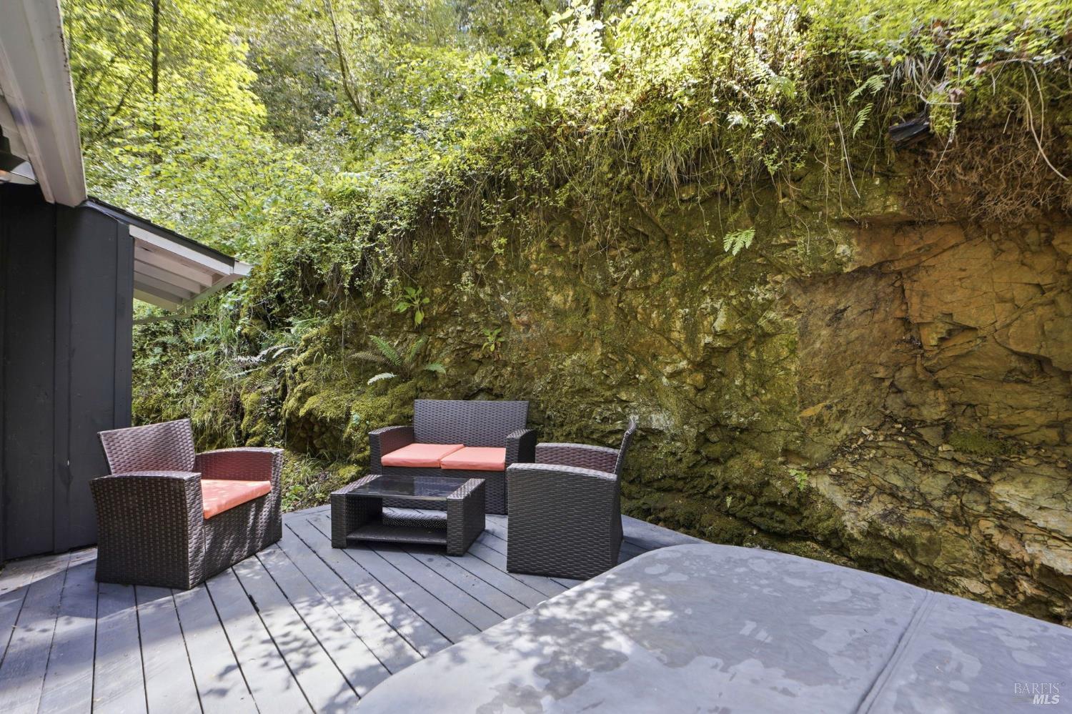 This charming 1963 hillside cottage packs an incredible punch into 922 square feet hardwood floors, light from every angle, and a chef's kitchen that will stop you in your tracks. And what a kitchen it is. Viking combination oven (steam, microwave & convection), Viking induction cooktop, drawer refrigerators and freezer, Bosch whisper dishwasher, and stunning marble counters. Designed for the serious cook and the casual entertainer alike. Step outside to private decks and a hot tub perfectly positioned for soaking under the redwoods after a day on the Russian River. Armstrong Redwoods, world-class wineries, and Guerneville's beloved dining and shops are all just minutes away. Whether you're seeking a full-time home or the perfect weekend getaway in one of the North Bay's most sought-after destinations this one delivers.