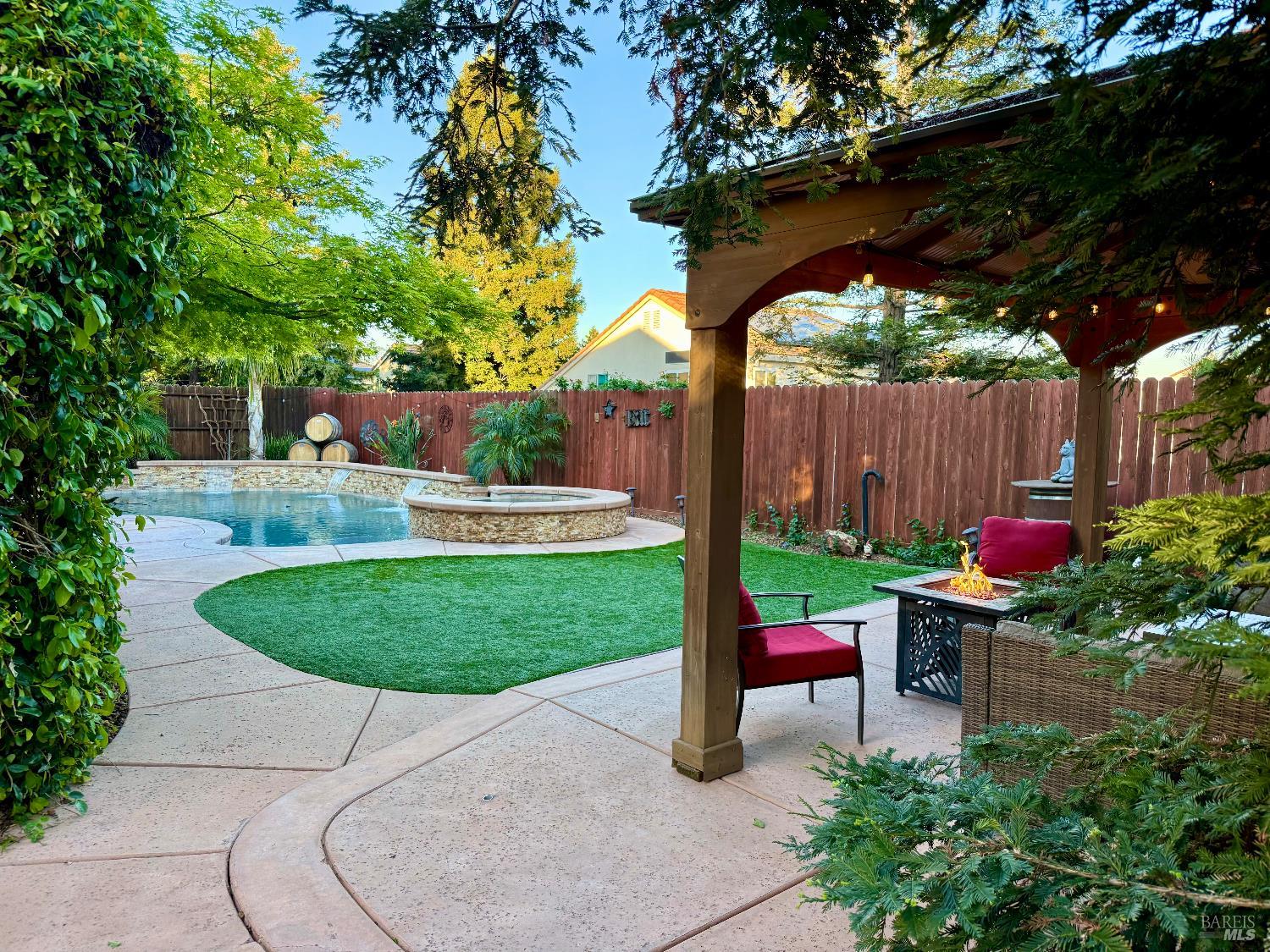 This is the one! Located in the desirable Browns Valley neighborhood this beautiful 5bed/3 full bath home offers a spacious open-concept design with stylish laminate flooring and an impressive chef's kitchen featuring an oversized island, double ovens, gas cooktop, and abundant cabinetry perfect for both everyday living and entertaining. The main level includes two bedrooms, a remodeled full bathroom, indoor laundry room, two separate living spaces and a formal dining area that provides flexibility and elegance. Upstairs you'll find three additional bedrooms, including a luxurious primary suite with a spa-inspired bathroom featuring an oversized custom-tiled shower with body sprayers, handheld wand and huge rain shower head. His and hers closets, a deco wall, & generous storage complete the space. The two additional bedrooms upstairs share a well-designed Jack-and-Jill bathroom. Step outside and you'll discover your own private backyard oasis. The custom heated gunite salt water pool and spa with PebbleTec finish. Pool has a Cabo shelf w umbrella holder, waterfall features built in 2018 with wireless controls right from your phone from anywhere in the world. The pergola adds year round outdoor living space with string lights, a fan, and electricity for any of your wants and needs. Mature landscaping surrounds the yard, highlighted by a stunning Japanese maple that offers a canopy of natural shade, while artificial turf keeps the space beautifully green with minimal upkeep. A spacious pergola adorned with string lighting and an outdoor TV sets the stage for unforgettable evenings and effortless entertaining. This exceptional property is further enhanced with PPA solar for energy efficiency and low utility costs, a three-car garage, possible RV parking, and additional outdoor storage sheds. Other upgrades include permanently installed enbrighten outdoor lighting that can change for all the seasons, custom blind/shades on slider and family room windows, new carpet. Perfectly located across from the picturesque, family-friendly Ridgeview Park, this is the kind of home that truly has it all and instantly feels like the one you've been waiting for.