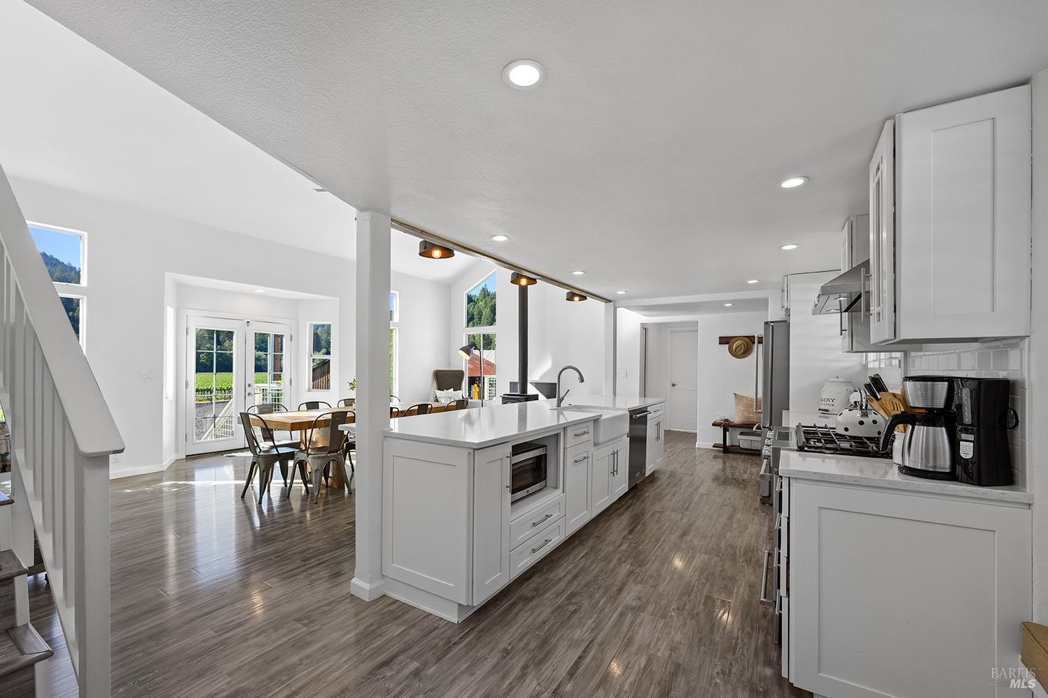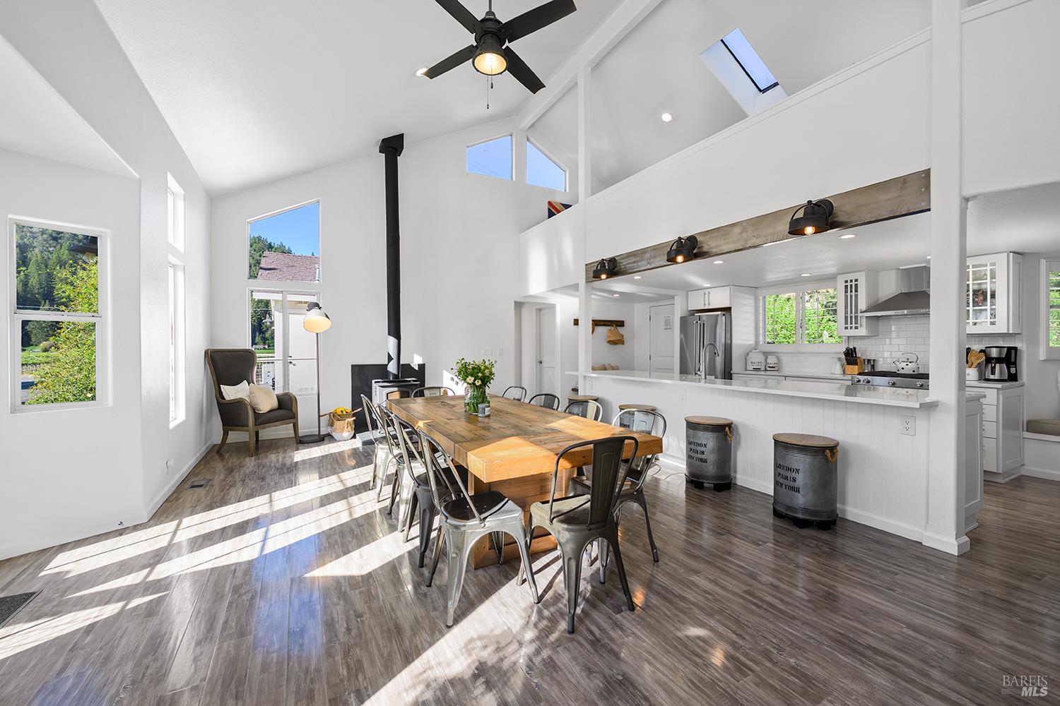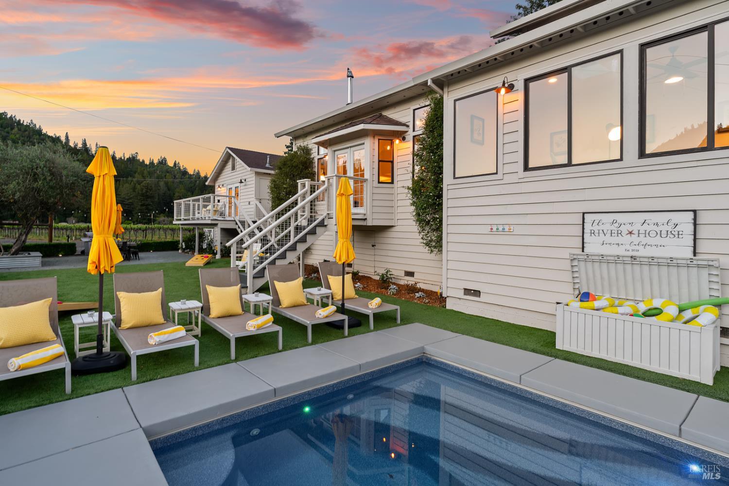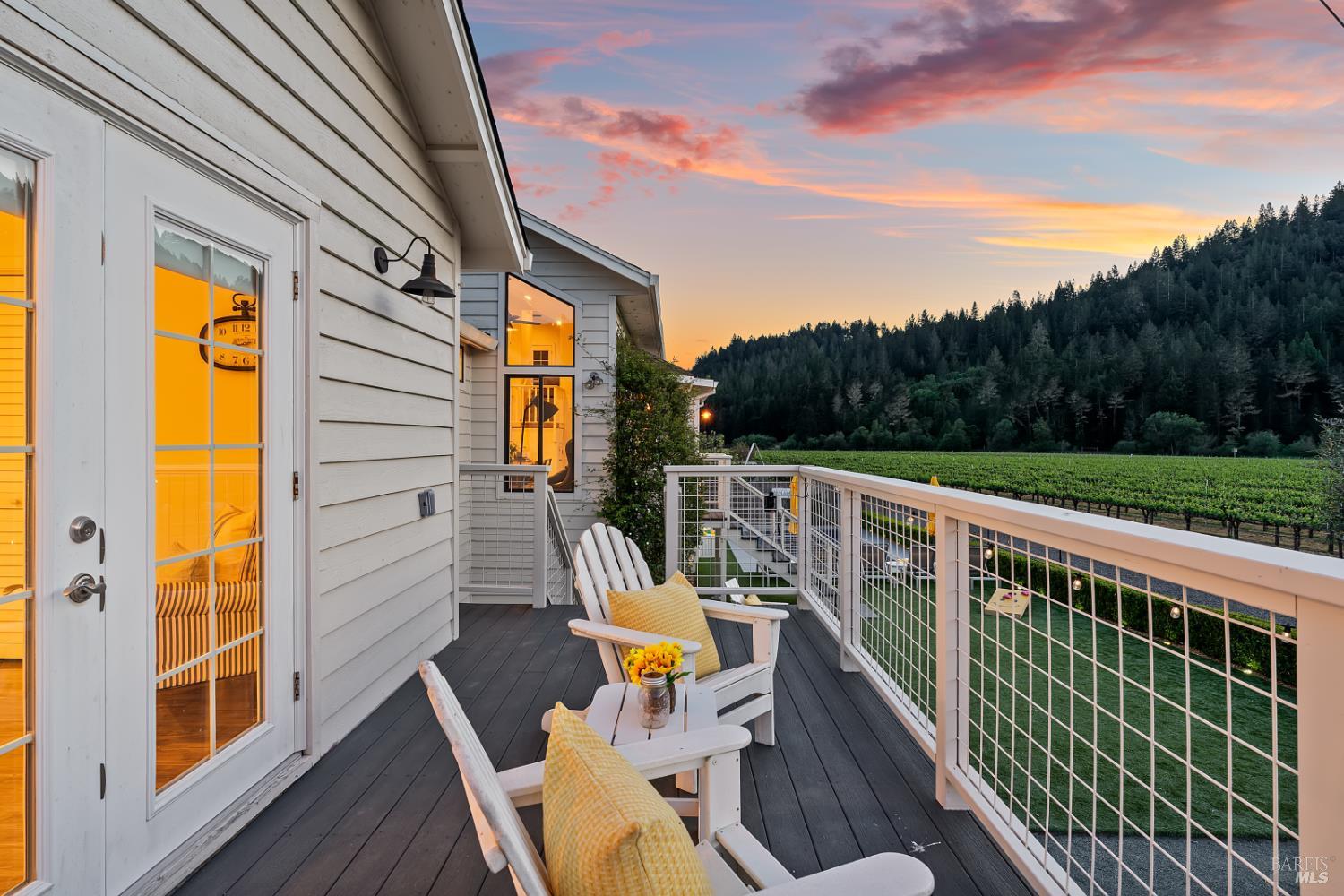 Perched above the rolling vineyards of Korbel with 180-degree views of forested ridgelines and mountain peaks, this fully updated West County farmhouse sets a standard for what a Guerneville estate can be. Set near the end of a private lane on a level 0.25-acre parcel with just one neighbor, the home delivers the kind of privacy and presence that defines true Sonoma County living. At 2,548 square feet with 5 bedrooms and 3.5 bathrooms, the floor plan is both gracious and flexible including a self-contained guest suite with its own private entrance, ideal for multigenerational living, visiting wine country guests, or income potential. Inside, the architecture earns its views. Soaring ceilings and walls of glass draw the vineyards and hills directly into the living space, while the thoughtfully updated kitchen and bathrooms make no compromises designer plumbing fixtures, elevated hardware, and rich stone and tile finishes create a refined, cohesive aesthetic from room to room. The result is a home that feels polished without being precious, luxurious without losing its warmth. Step outside and the property reveals its final act: a sparkling newer in-ground pool anchors a beautifully lit outdoor entertaining area that transitions seamlessly from golden afternoon gatherings to evenings under the stars. Whether you're hosting a harvest dinner for twelve or unwinding after a day on the Sonoma Coast, this outdoor space delivers. Practical details matter too municipal water and sewer, an attached garage, and a location that places you minutes from Guerneville's beloved farm-to-table dining scene, legendary wineries, Armstrong Redwoods State Natural Reserve, and the rugged, breathtaking bluffs and beaches of the Sonoma Coast. As a full-time residence or a West County retreat, this is a property that rewards you every single day you're in it.